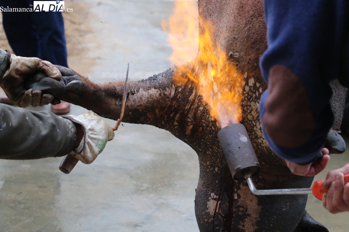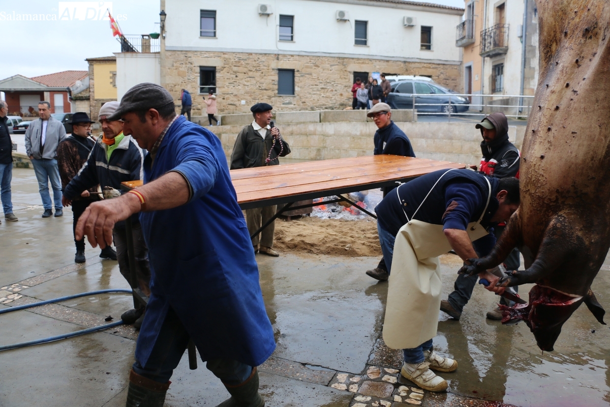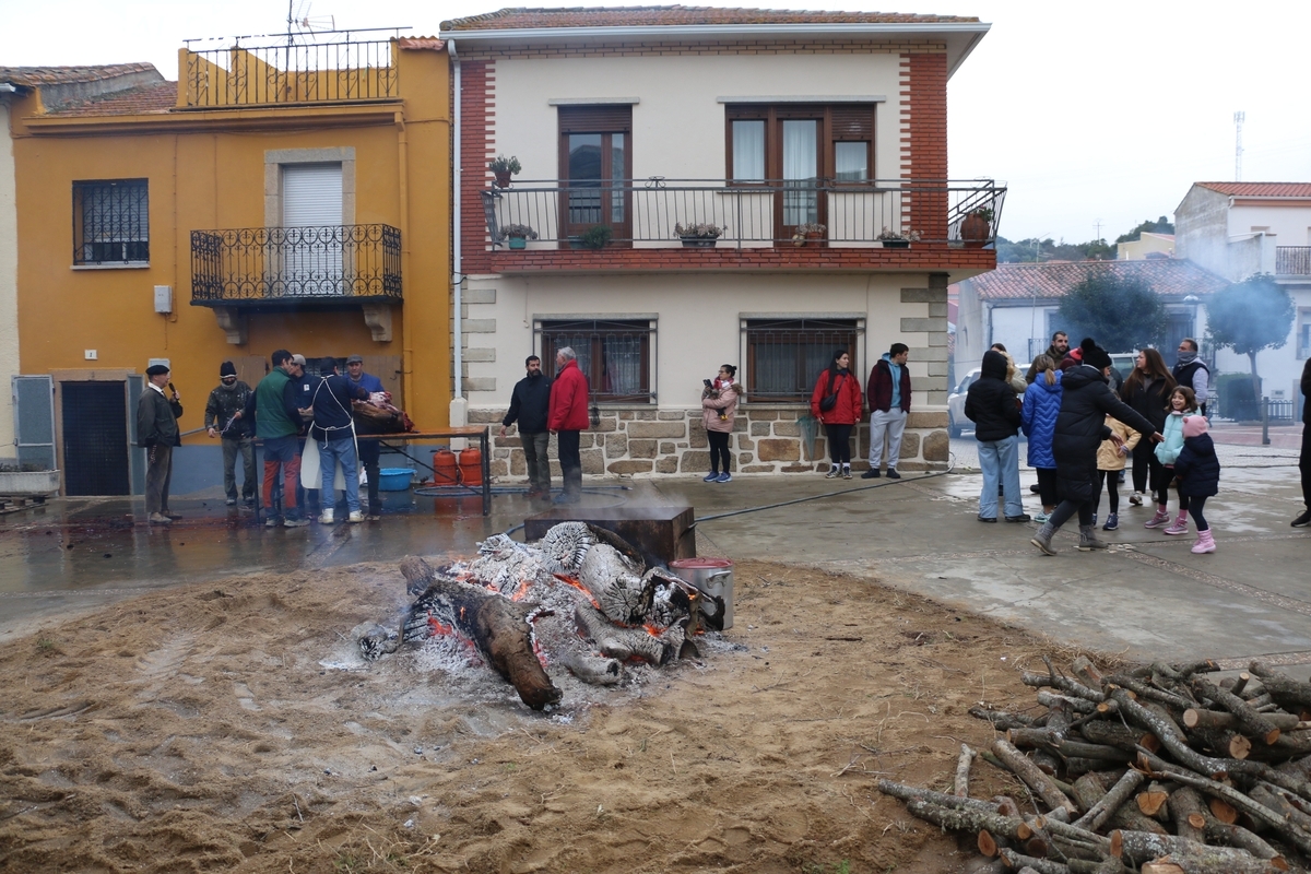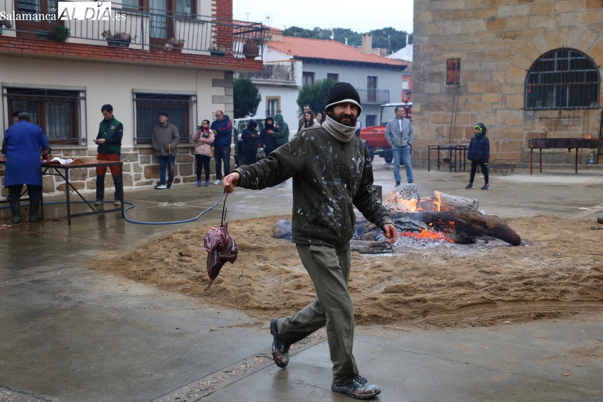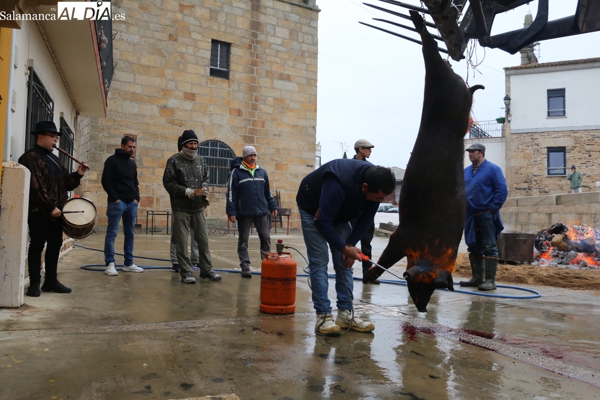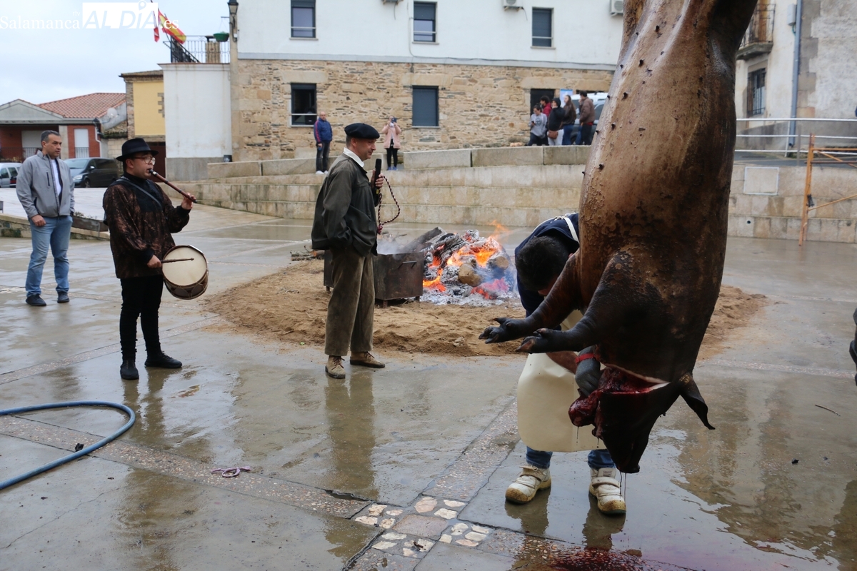 A las brasas de dos grandes barbacoas se asaban panceta, lomo y tocino, que con chichas, empanadas y hornazos compondrían el menú, y todo bajo los sones de la gaita y el tamboril de Diego Rengel y animado por un maestro de ceremonias de la Diputación de Salamanca, pues cabe recordar que la matanza de Saucelle se incluye en el circuito provincial de Matanzas que promueve la institución provincial.