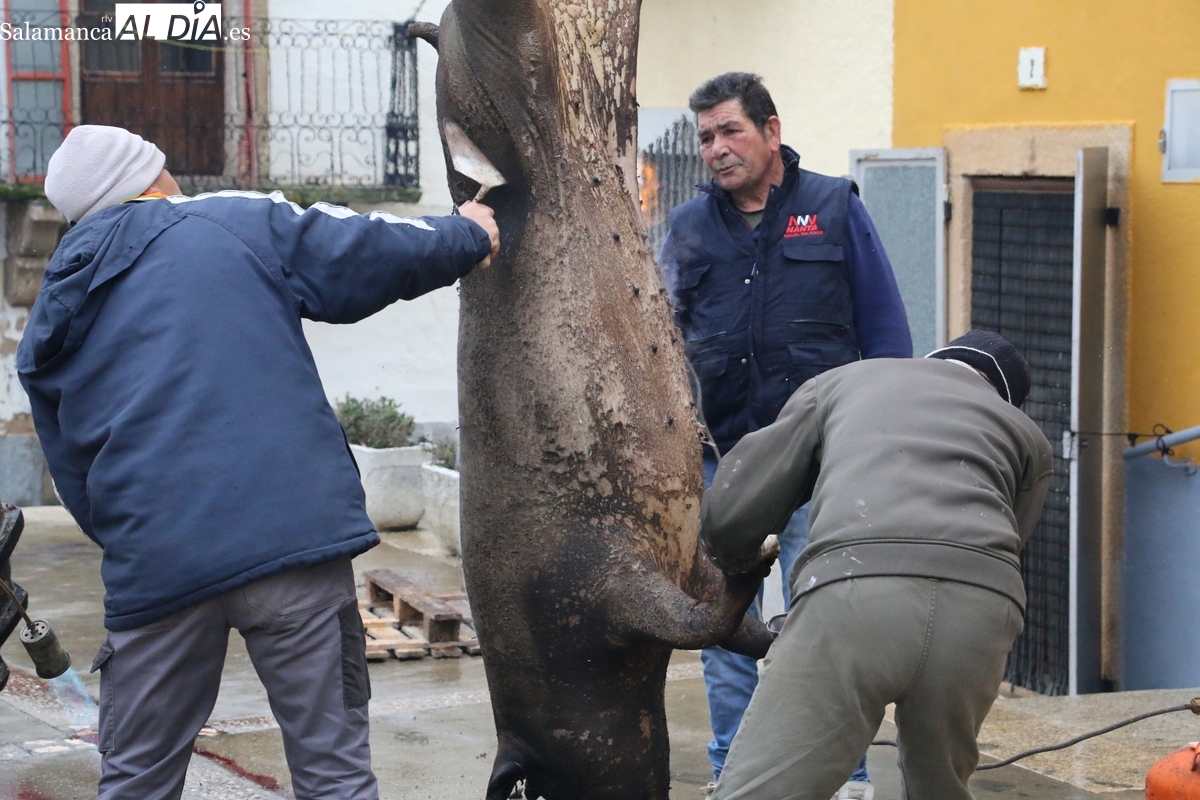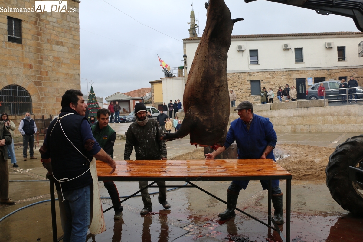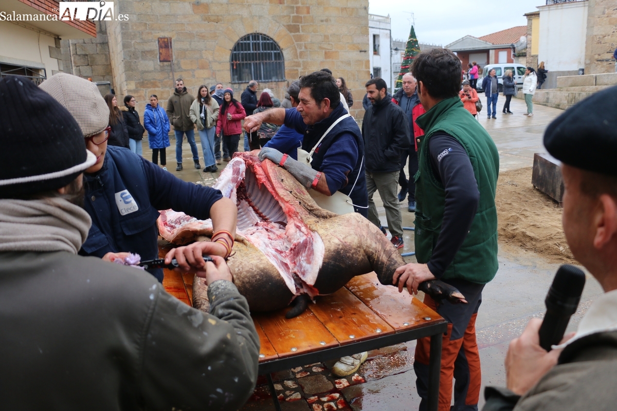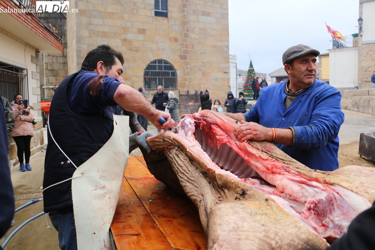 Así las cosas, y tras el encendido de la iluminación navideña en la tarde del viernes, acto acompañado de chocolate con churros, pasadas las 11:30 de la mañana de este sábado , la protagonista del evento entraba ya inerte en la plaza del frontón, una buena cochina ibérica de 210 kilos de peso y de la que dio cuenta Paco 'el carnicero', este año ayudado por Maxilimiliano Martín y un nuttrido grupo de colaboradores , ambos ayudados en las labores.