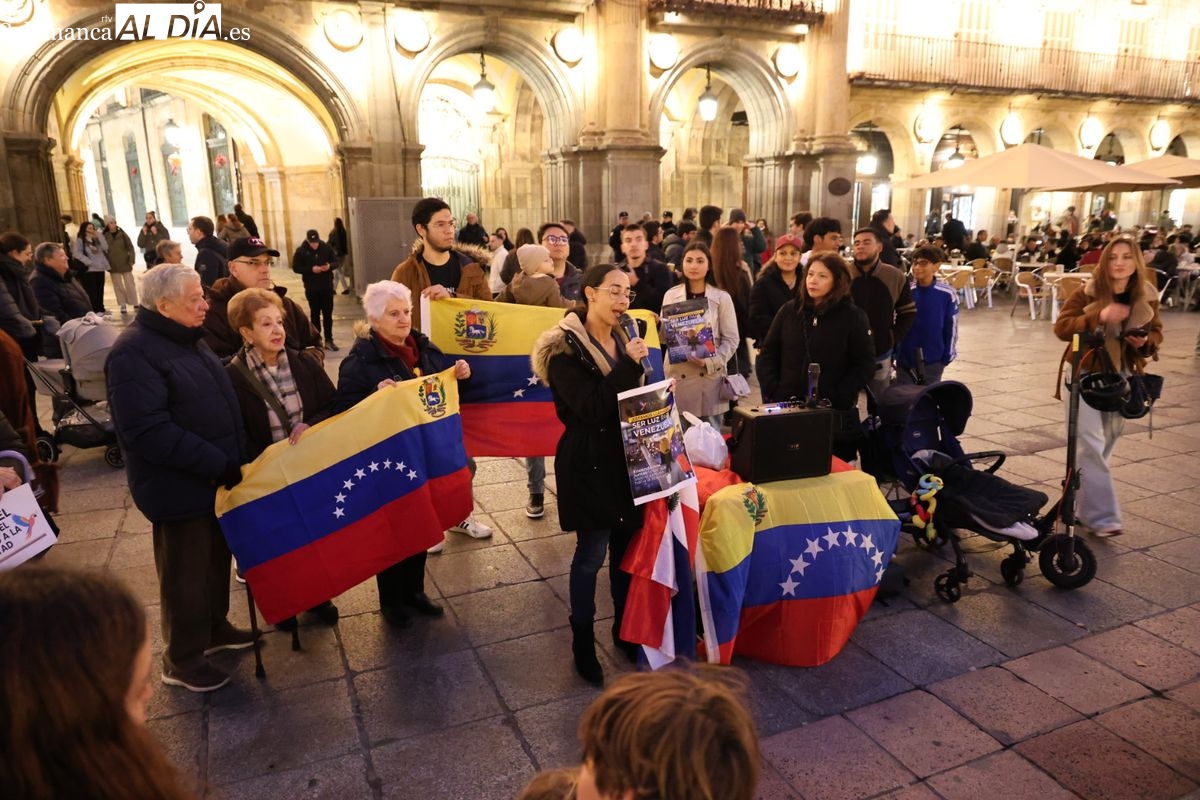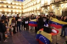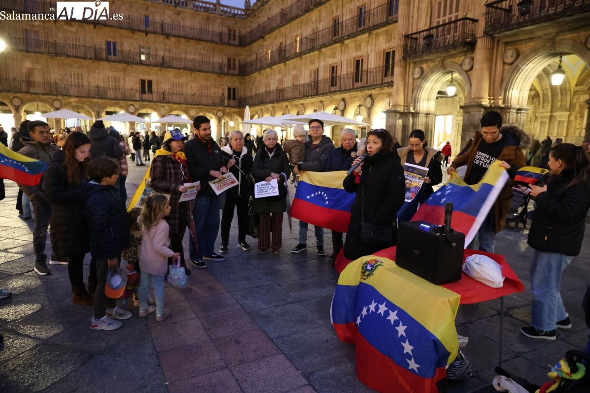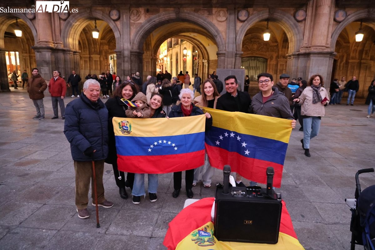 La Plaza Mayor de Salamanca ha vuelto a ser escenario de reivindicación este sábado por la tarde. La Comunidad Venezolana en Salamanca ha protagonizado una concentración en el ágora charra enmarcada dentro de una jornada de protesta a nivel mundial bajo el lema 'Por Libertad'.