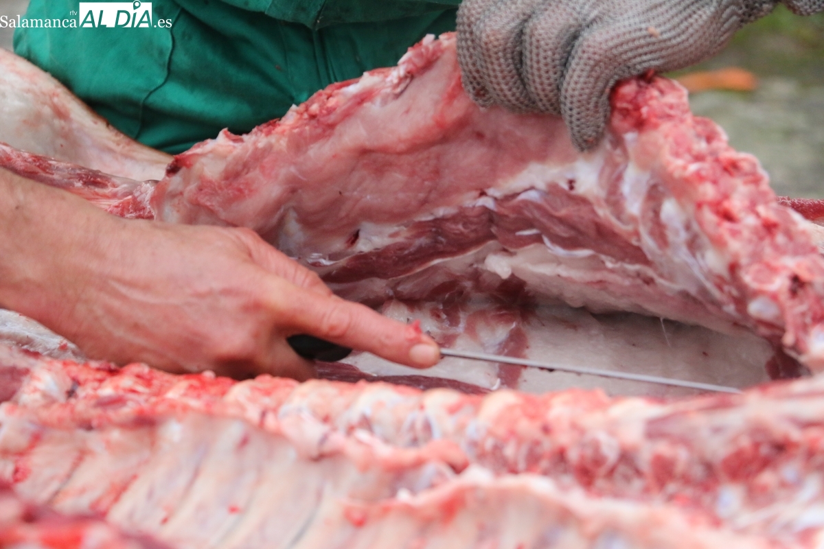 Una vez el cochino estuvo chamuscado y limpio, tomó el mando el matarife Cesáreo Martín Valle. El maestro matancero hizo gala de una notable destreza y rapidez, deshaciendo el marrano 'en un santiamén'. El proceso de despiece comenzó con la separación de la cabeza del tronco, para continuar meticulosamente con la extracción de la cinta con panceta y manto. Acto seguido se retiraron el hunto, las tripas y vísceras, momento en el que se tomó la muestra del diafragma necesaria para el examen veterinario de triquinosis, garantizando así la seguridad alimentaria.