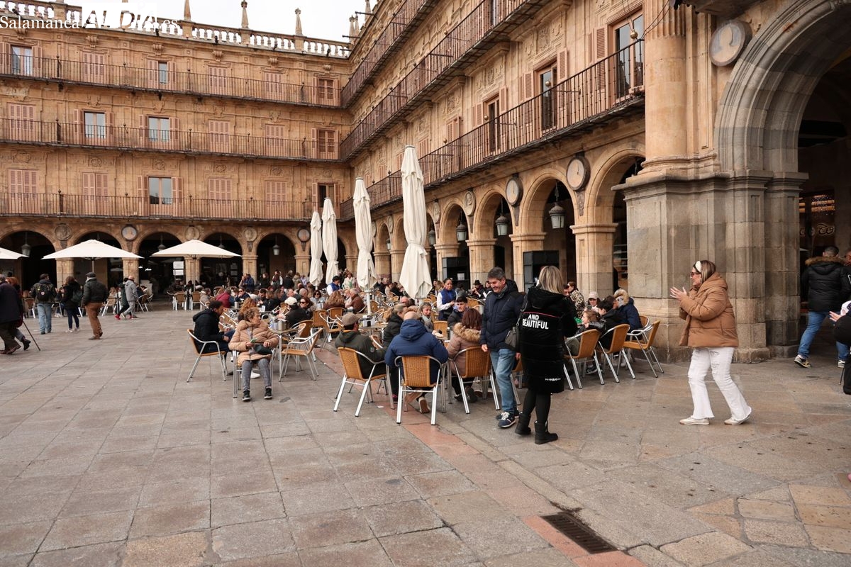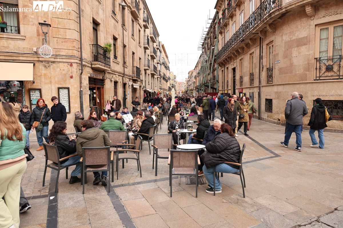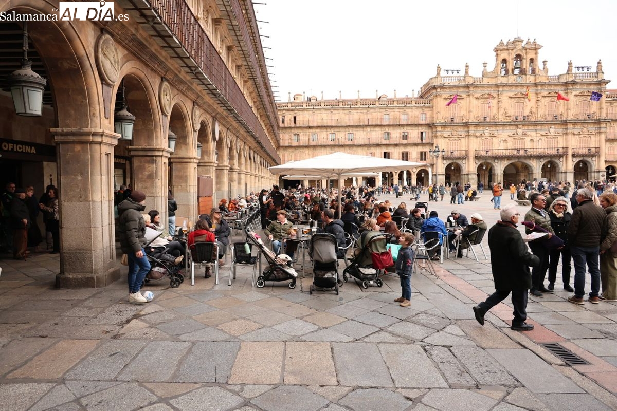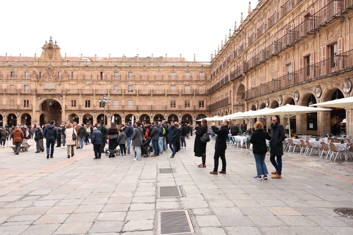 A la llegada de visitantes se suma la presencia de numerosos vecinos de Salamanca. Los salmantinos han aprovechado el día festivo para salir al centro, realizar compras o disfrutar de la gastronomía local o simplemente pasear, contribuyendo a la sensación de lleno que se respira en la zona histórica.