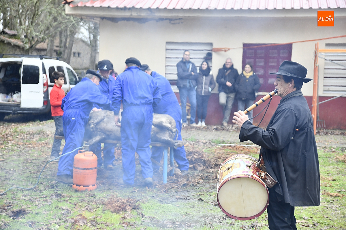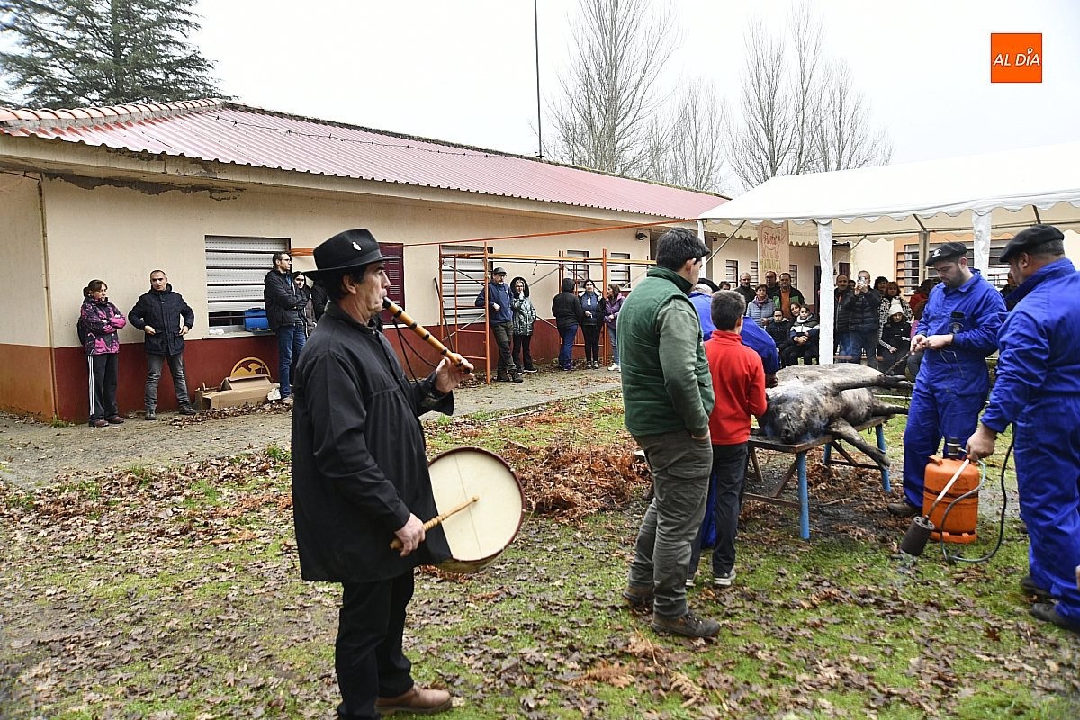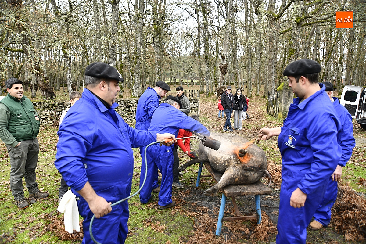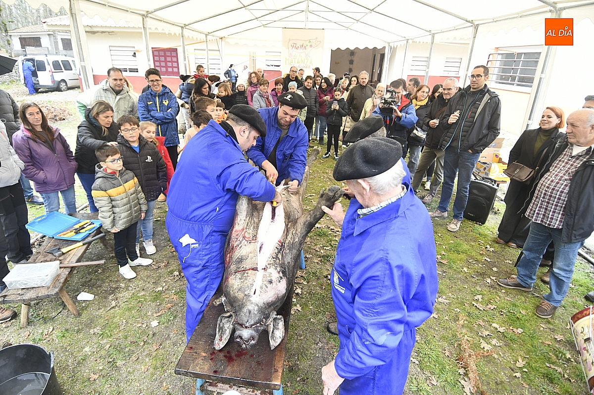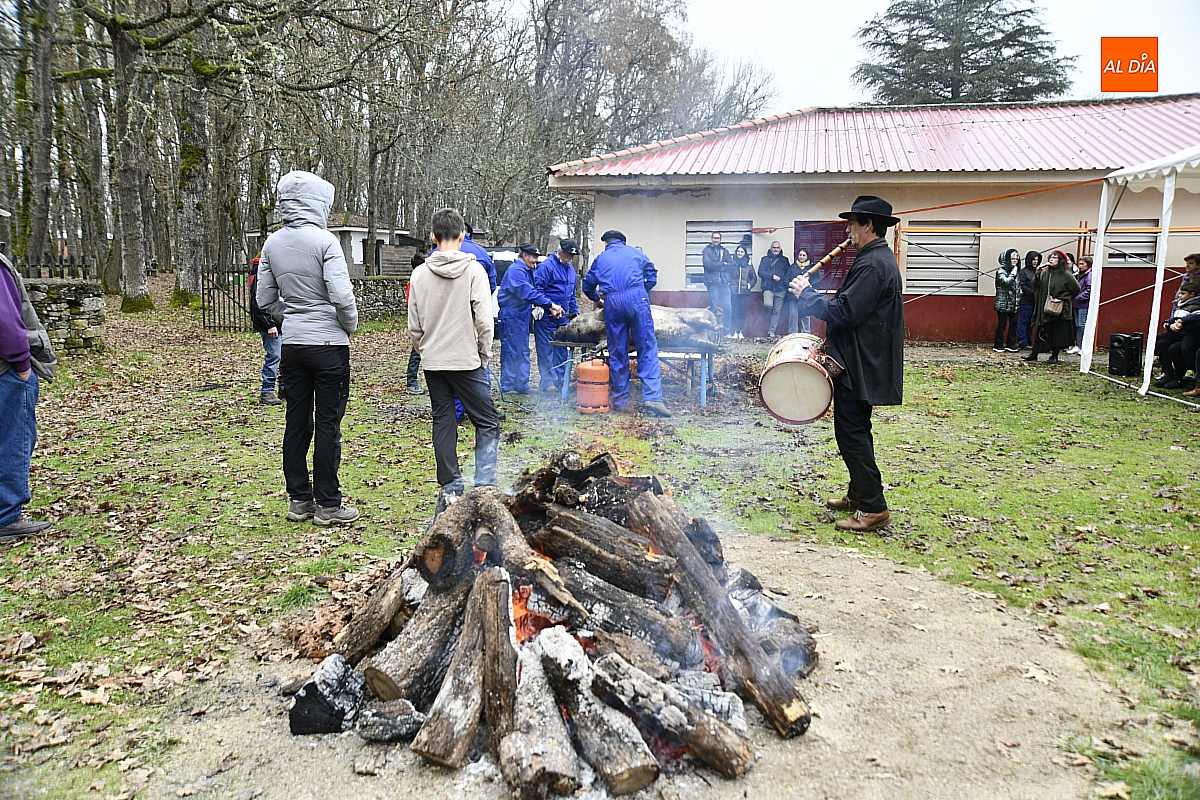 A pesar de la ligera lluvia que durante la mañana cayó sobre todo El Rebollar, vecinos, oriundos y visitantes portugueses fueron acercándose al recinto, donde la música de gaita y tamboril, junto con licores y aguardientes de la zona, animó el ambiente. El Matancero de Honor, Agapito Mateos, y los expertos Juan Miguel, Jorge, Rubén y Paco avanzaron las labores entre la atenta mirada de numerosos niños, que en ocasiones se animaron a colaborar.