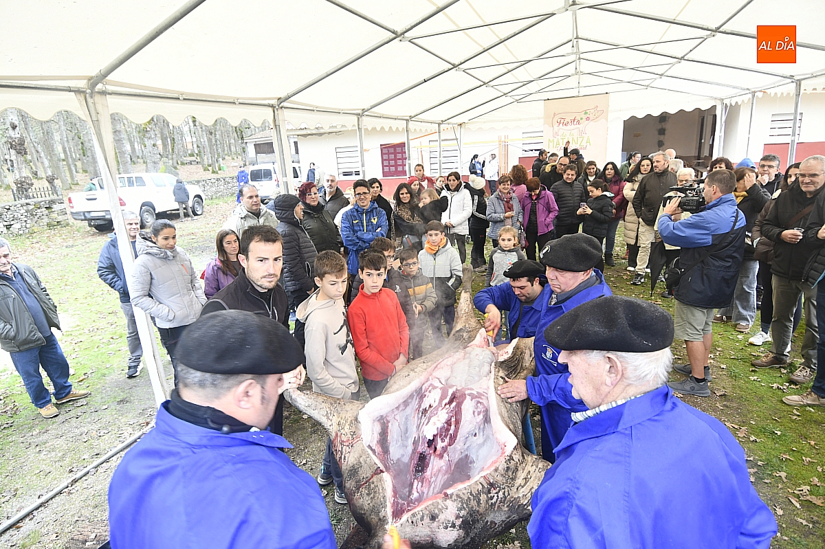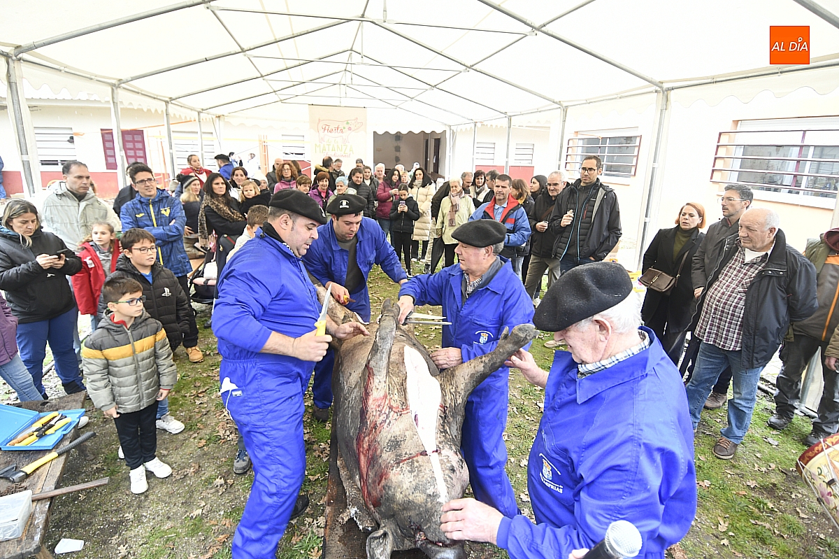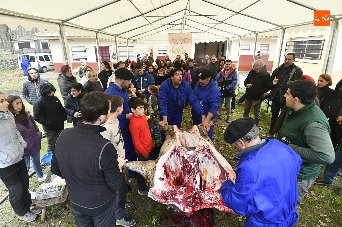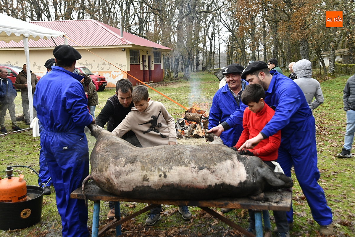 A pesar de la ligera lluvia que durante la mañana cayó sobre todo El Rebollar, vecinos, oriundos y visitantes portugueses fueron acercándose al recinto, donde la música de gaita y tamboril, junto con licores y aguardientes de la zona, animó el ambiente. El Matancero de Honor, Agapito Mateos, y los expertos Juan Miguel, Jorge, Rubén y Paco avanzaron las labores entre la atenta mirada de numerosos niños, que en ocasiones se animaron a colaborar.