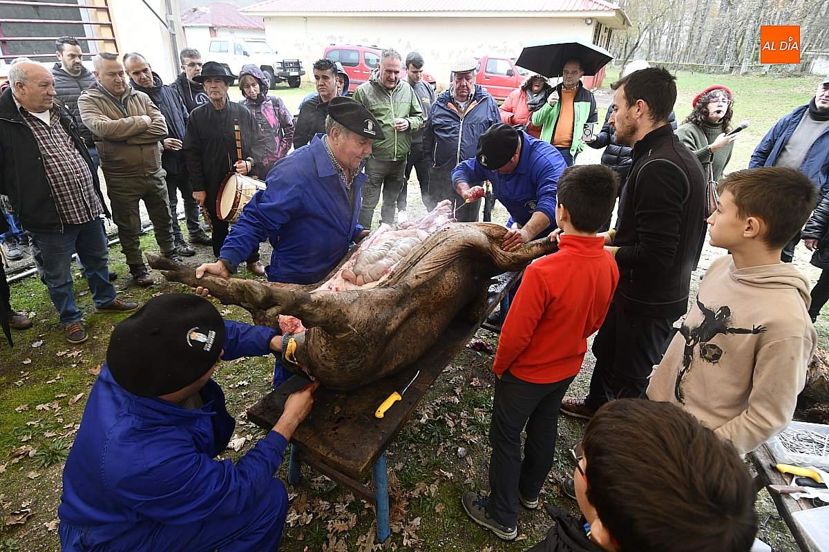 Una vez chamuscado el cerdo, cuyo peso en vivo alcanzó los 265 kilos, los matanceros continuaron con el despiece bajo la carpa instalada para protegerse de la lluvia, lo que permitió al público seguir de cerca cada fase del proceso.