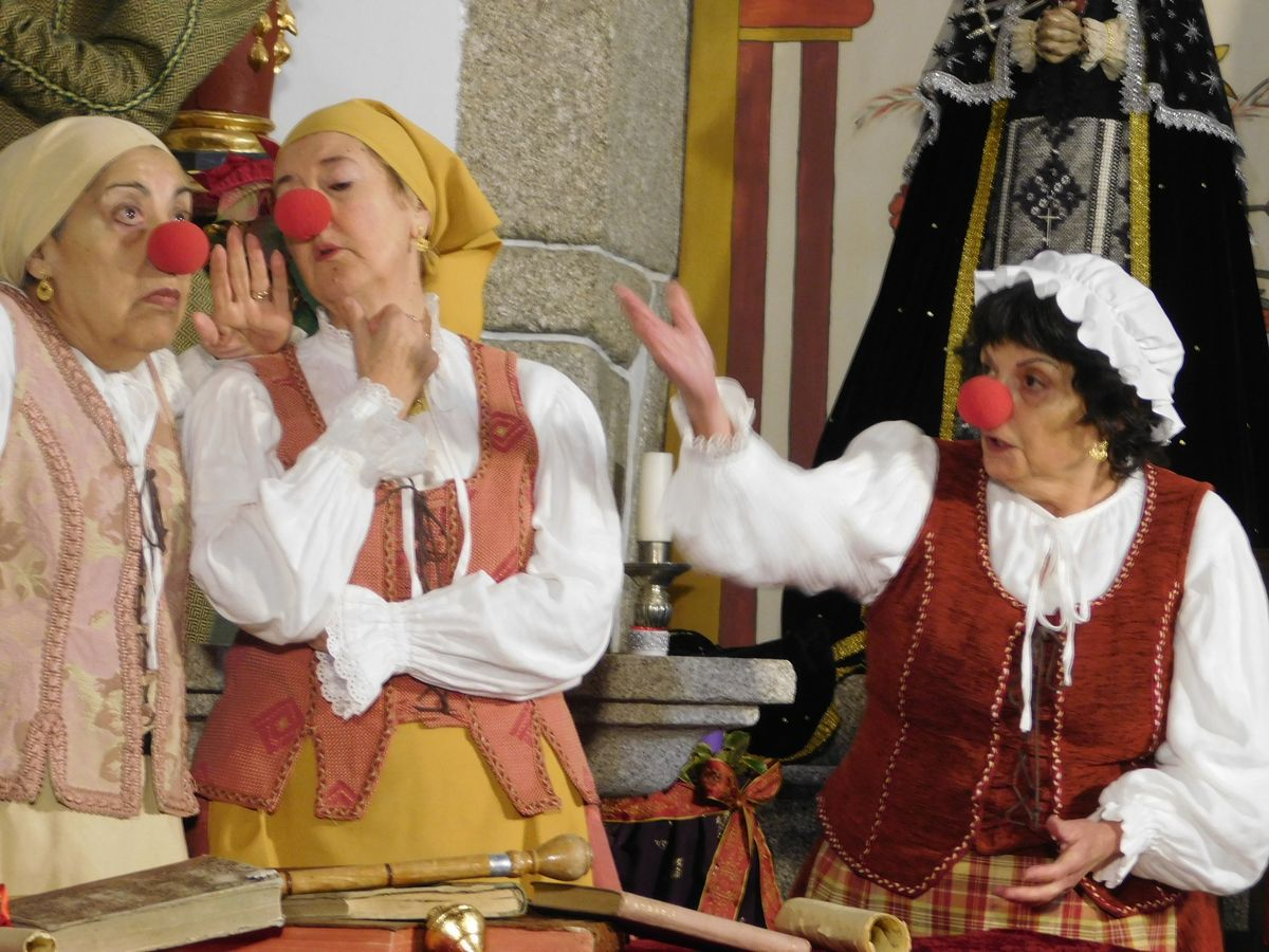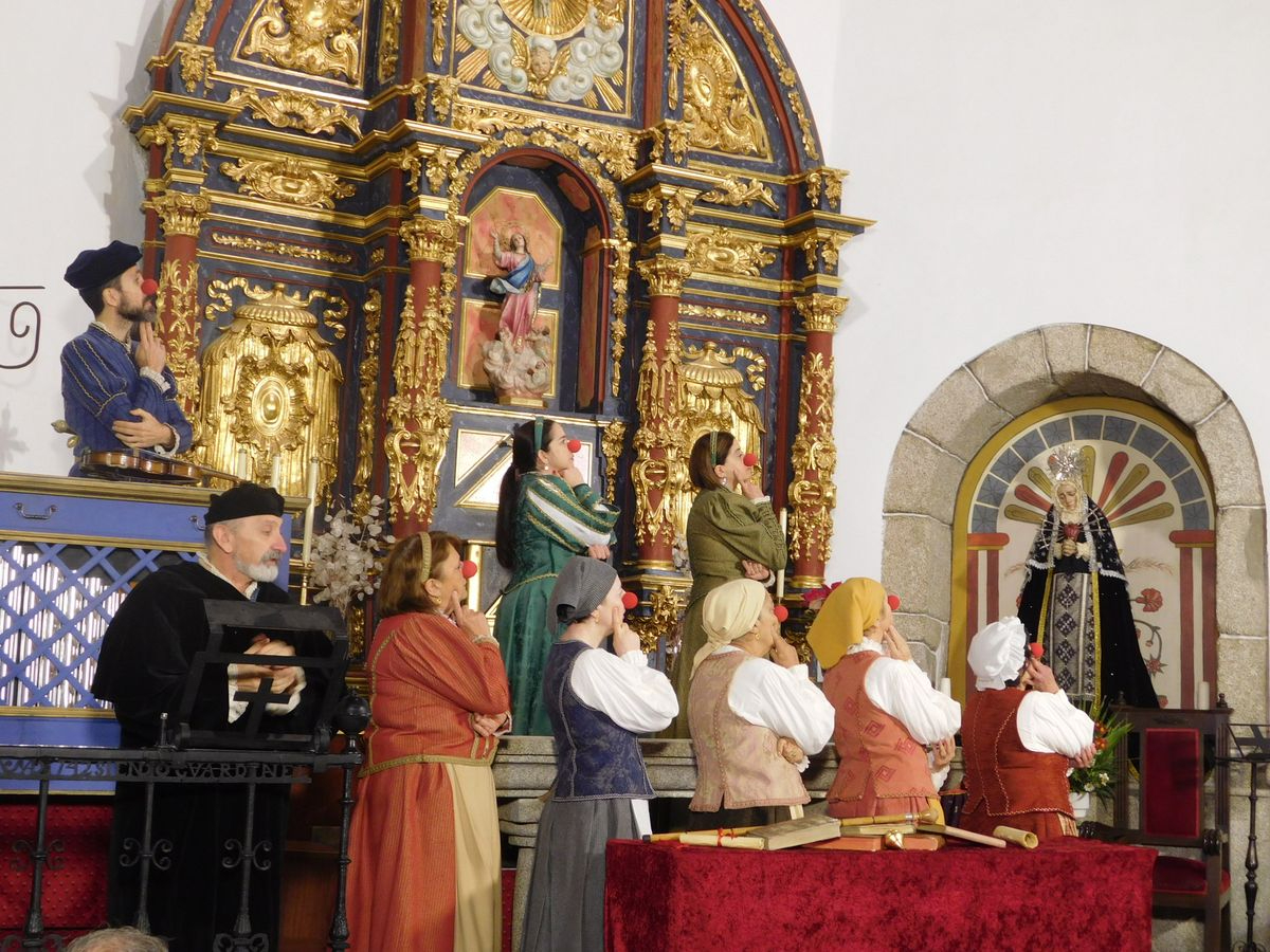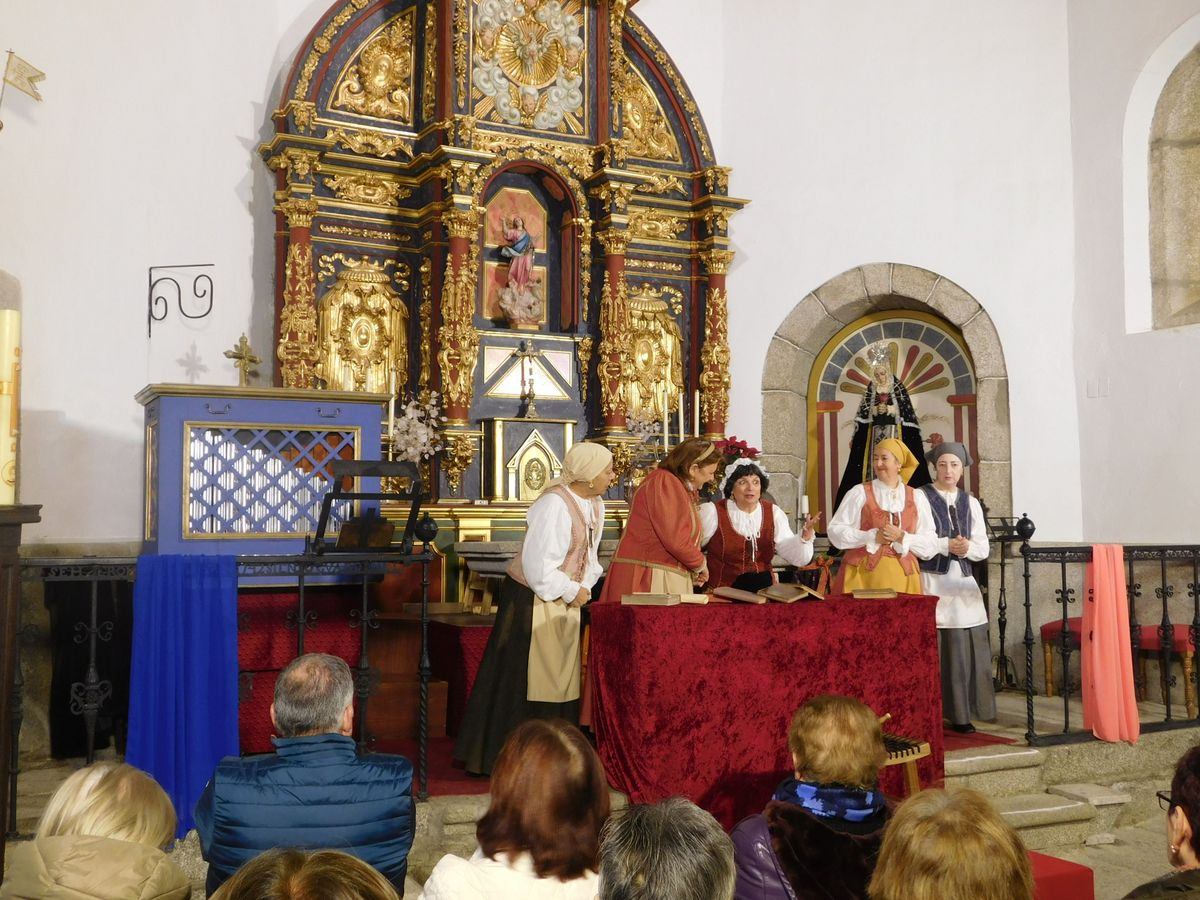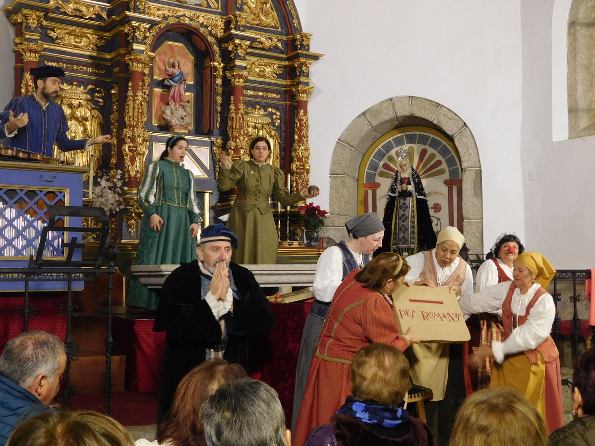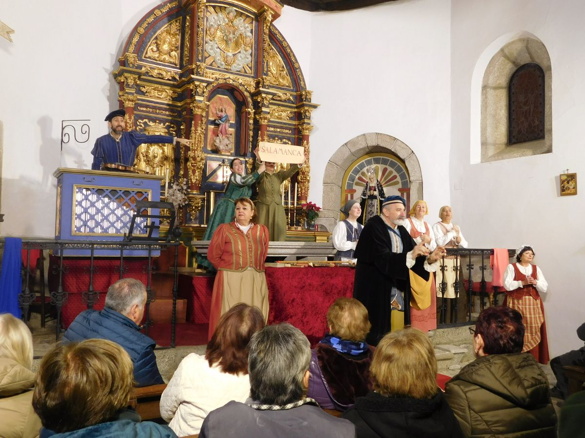 La iglesia de Nuestra Señora de la Asunción abrió sus puertas para que los vecinos de Sanchotello disfrutaran de una tarde inolvidable y es que, en su penúltima representación, la 299, el elenco del grupo “Lazarillo de Tormes” puso todo su arte en escena para demostrarle a un público entregado que, lejos de decaer, la ilusión por representar su montaje “Buscando a Nebrija” seguía intacta, como si de la primera actuación se tratara.