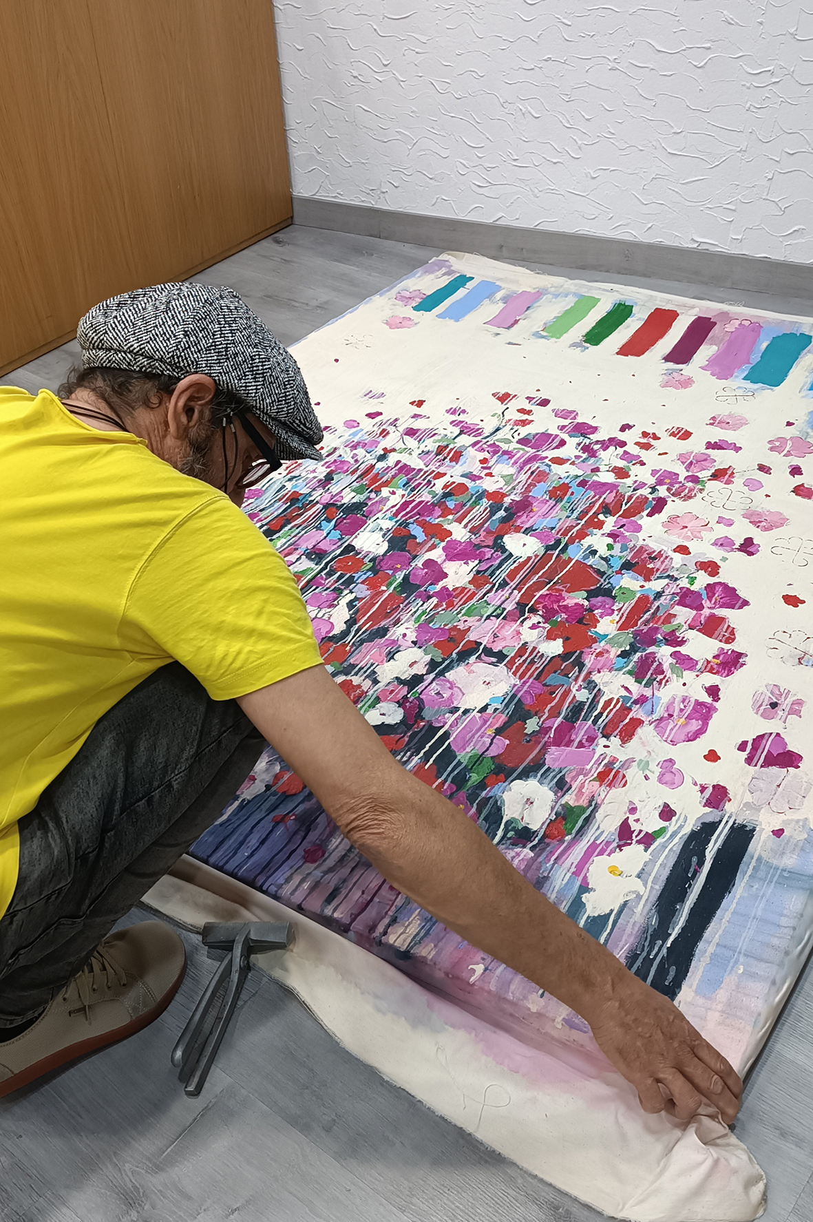 La muestra, coordinada por Luis Méndez, ofrece un recorrido por el imaginario pictórico del autor a través de una selección de piezas pertenecientes a sus series de trabajo 'Flores para los vivos' y 'no se puede hacer camino con piedrecitas de nubes…'. Estas creaciones, que incluyen tanto obras pictóricas como objetos, han sido realizadas durante los últimos años en el estudio que el artista mantiene en la localidad de Magacela, en Badajoz.