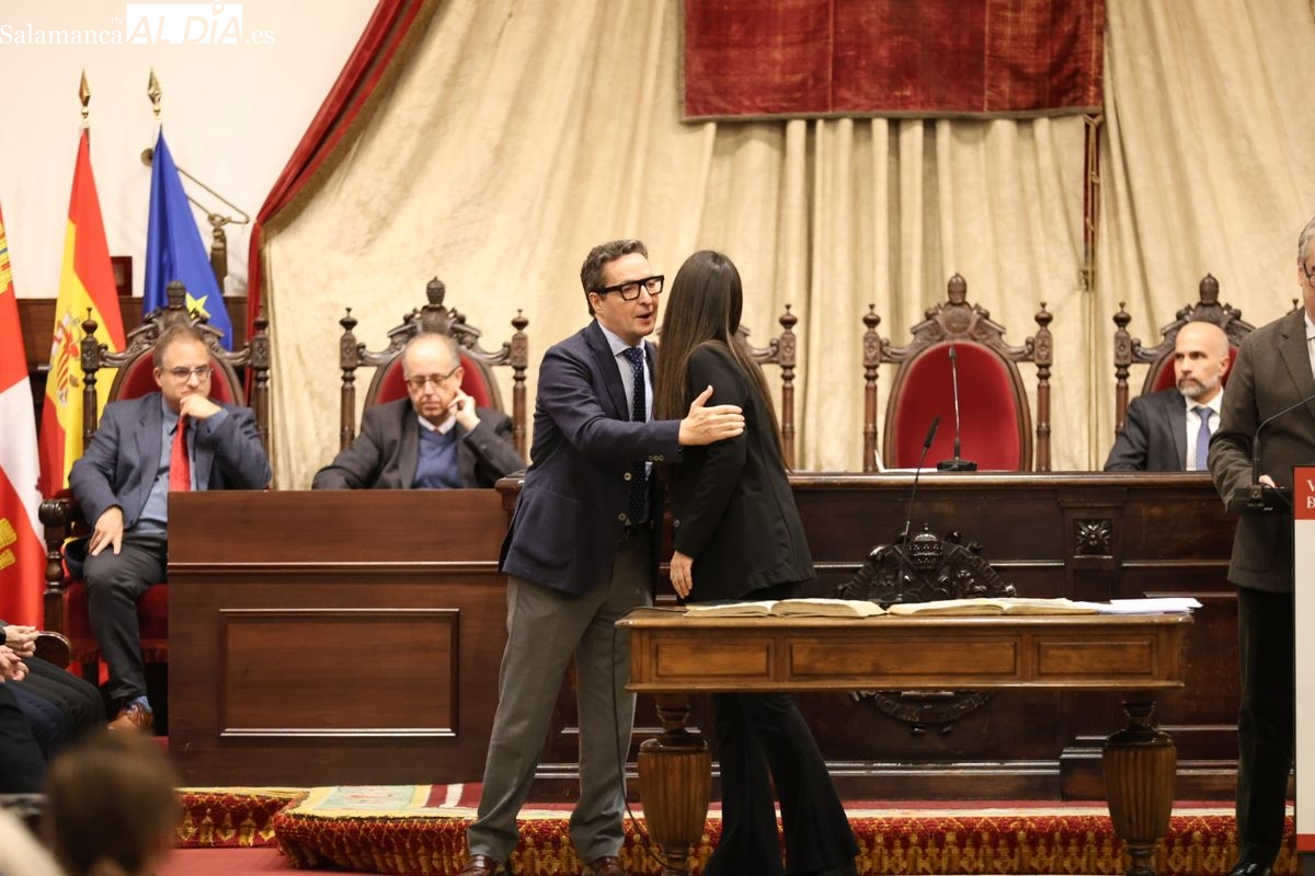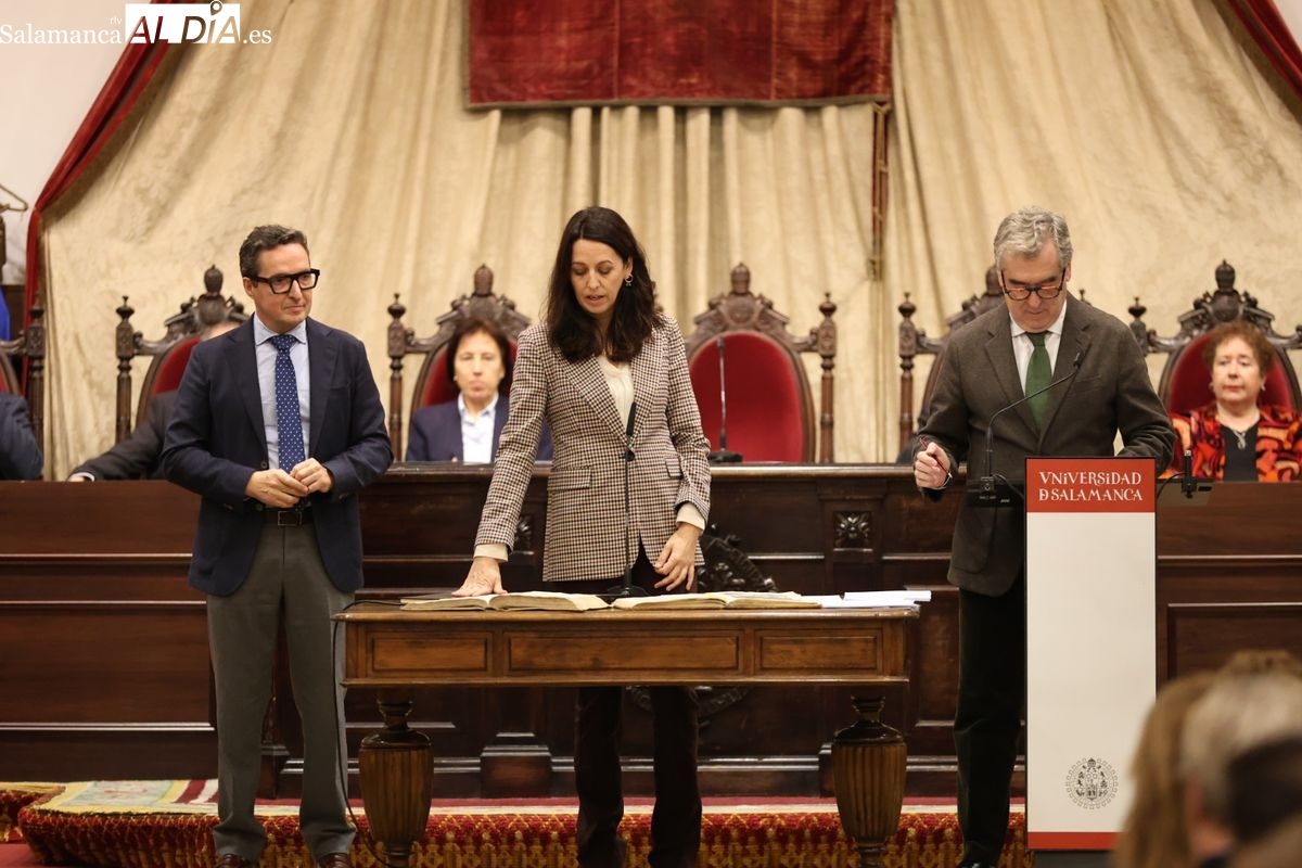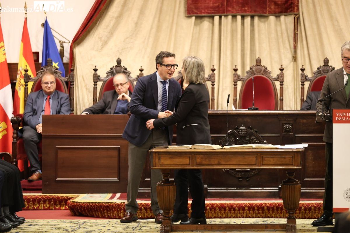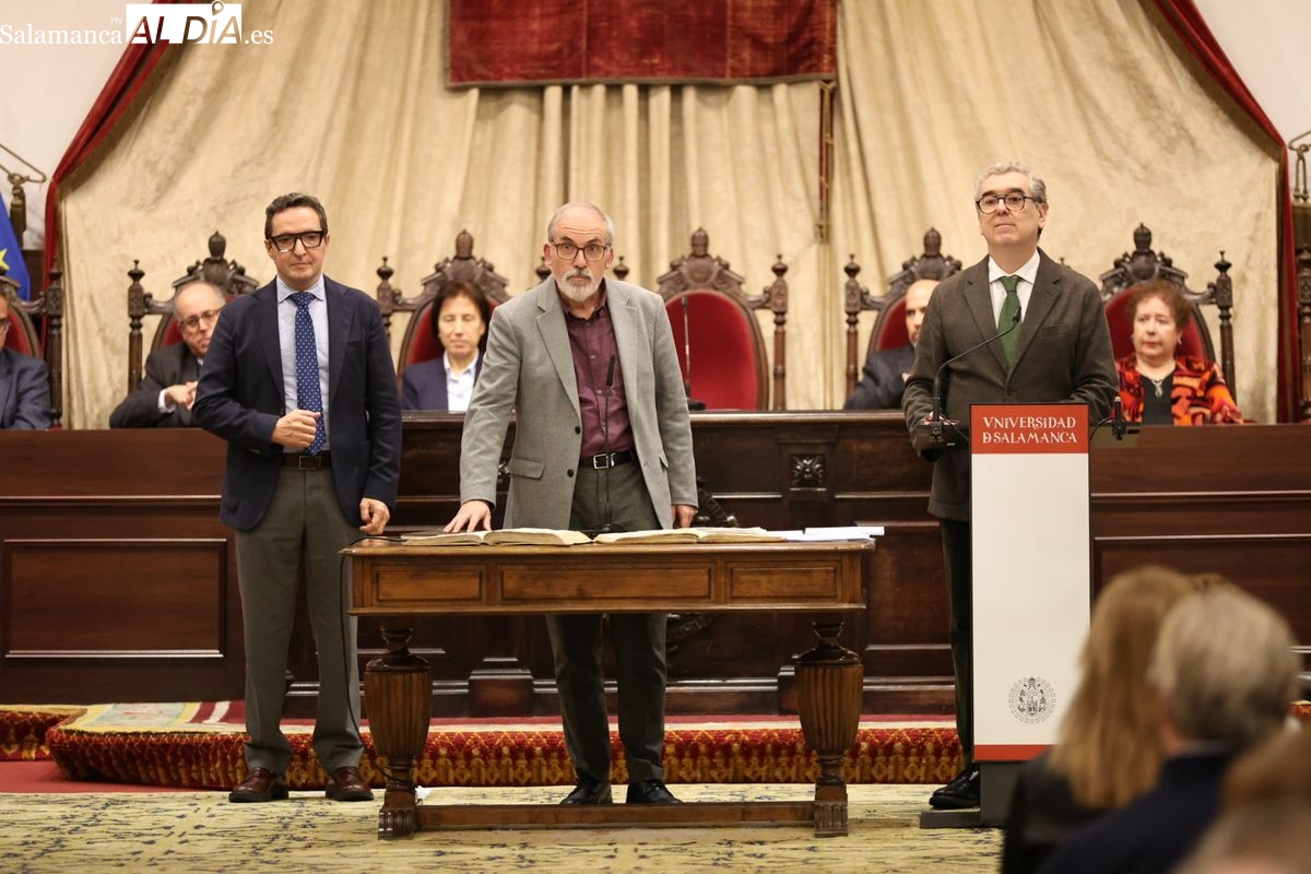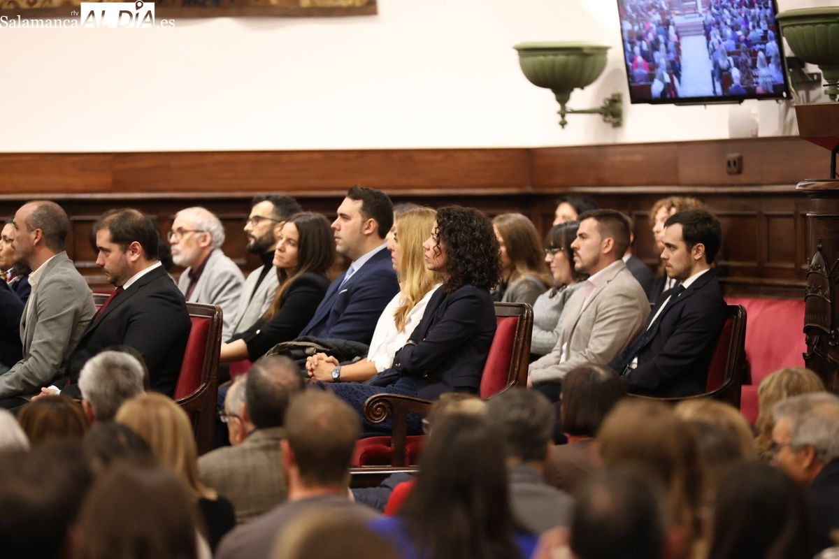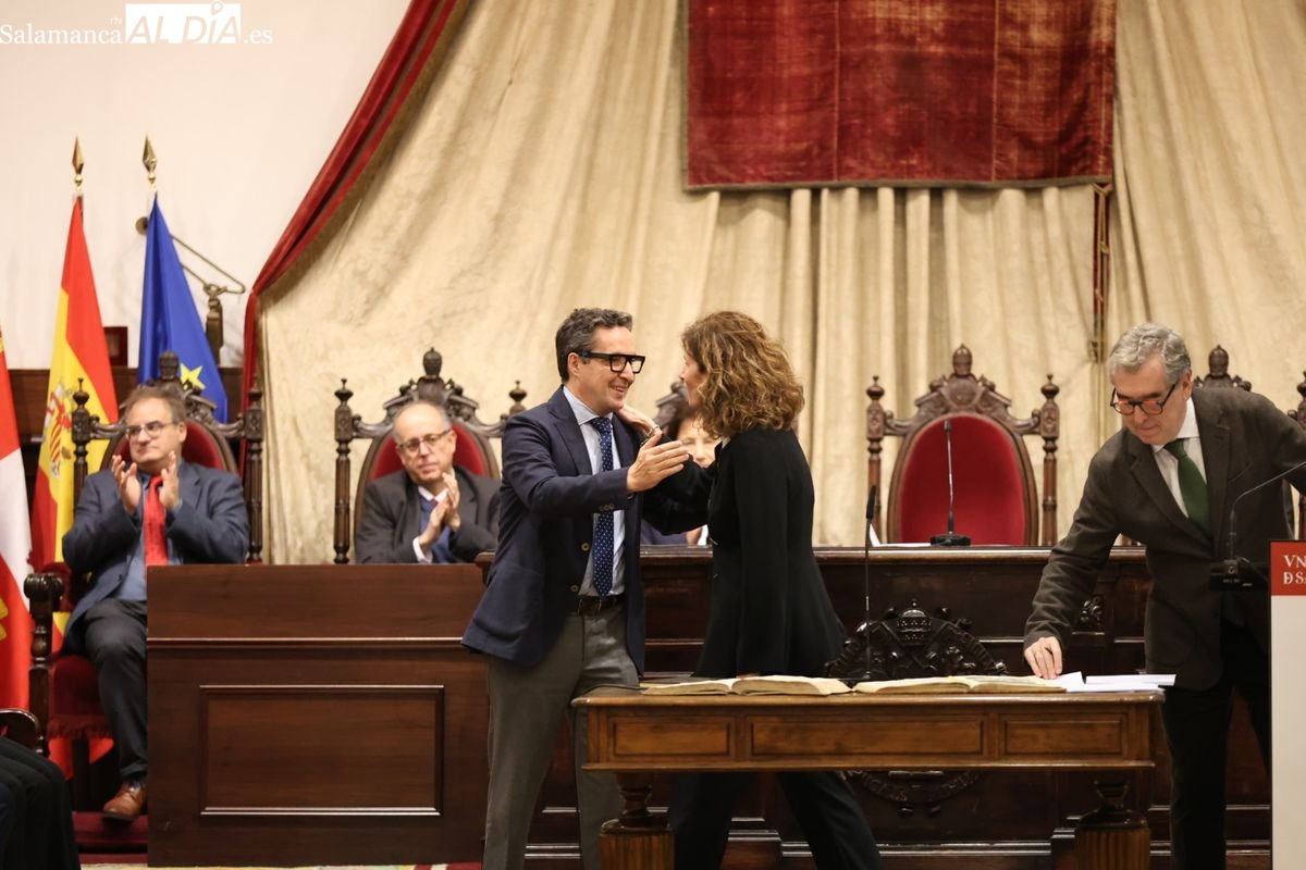 El Paraninfo de la Universidad de Salamanca ha acogido este martes el solemne acto de toma de posesión de un nuevo cargo académico, así como de personal docente e investigador de la institución. La ceremonia, que reafirma el compromiso de la comunidad universitaria con la excelencia académica y la gestión institucional, ha estado encabezada por el máximo responsable de la Universidad, quien ha presidido la sesión protocolaria en el histórico edificio de las Escuelas Mayores.