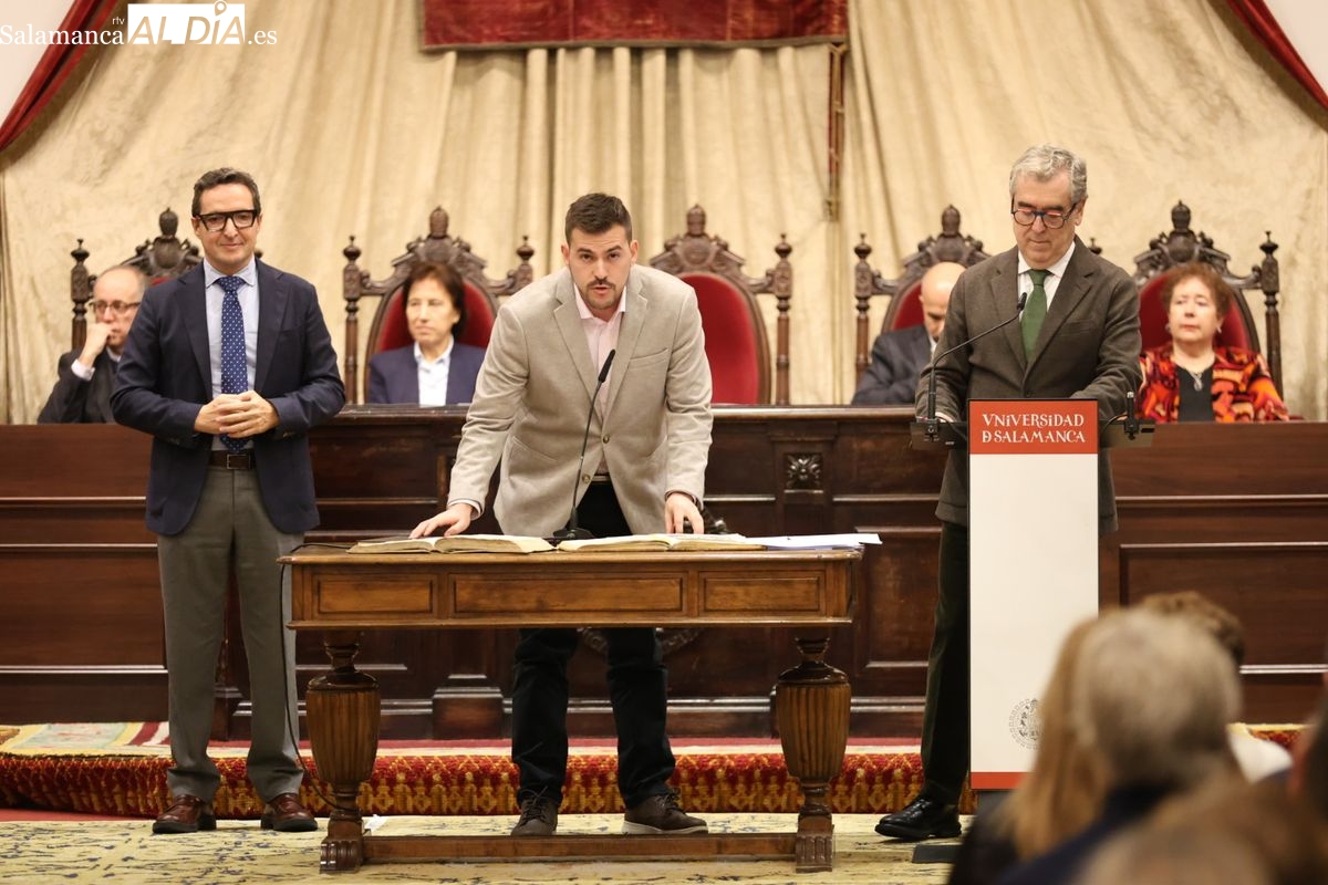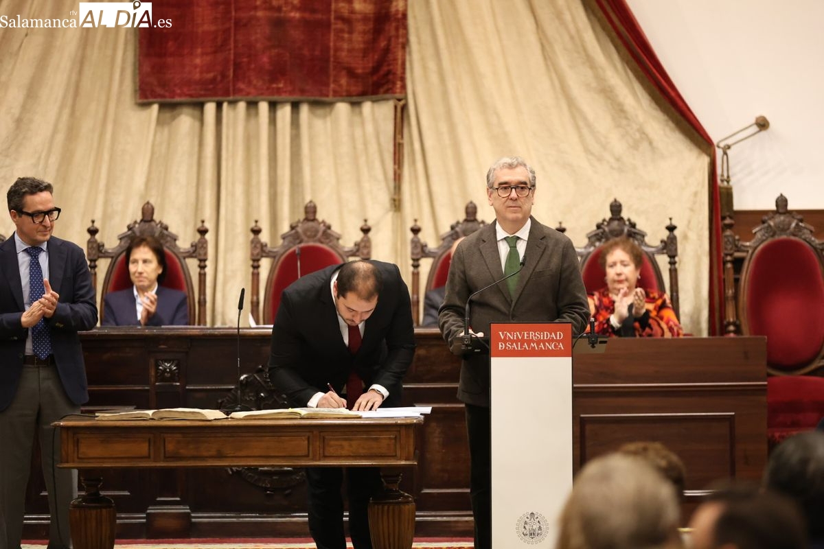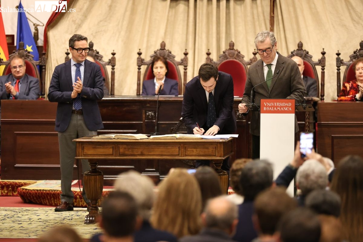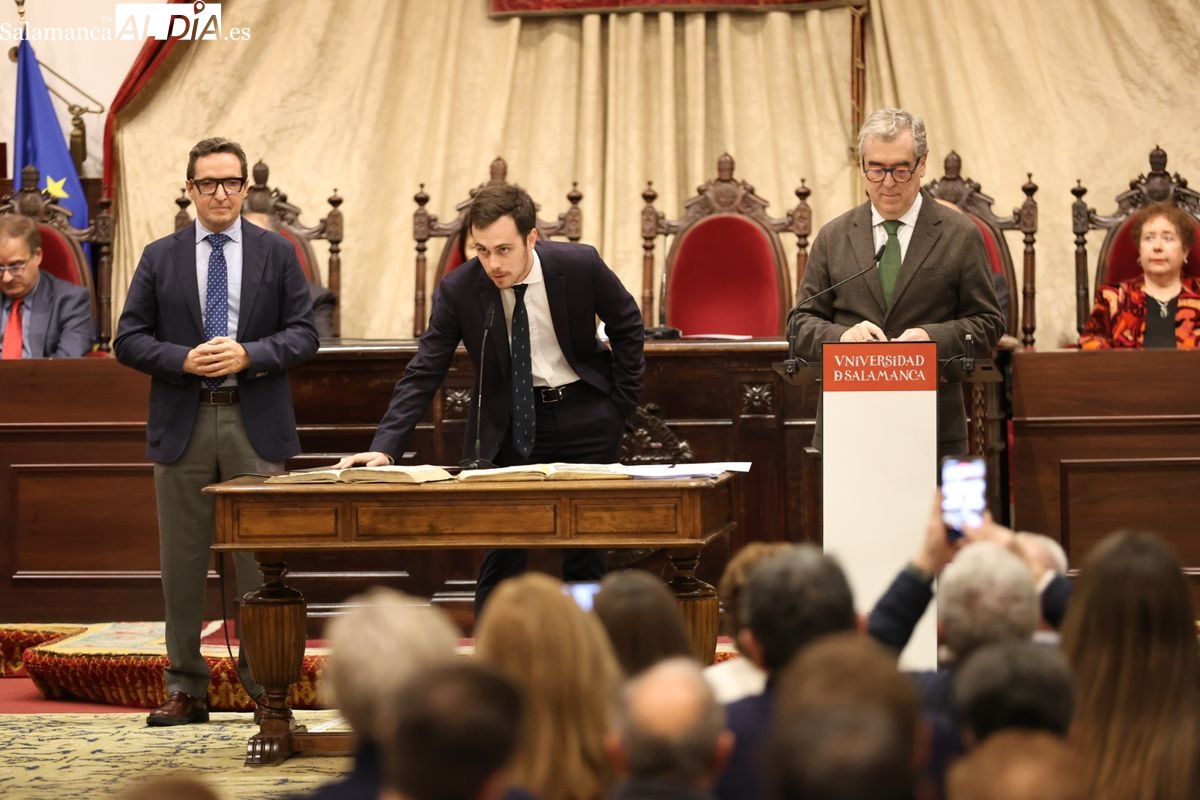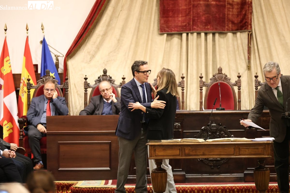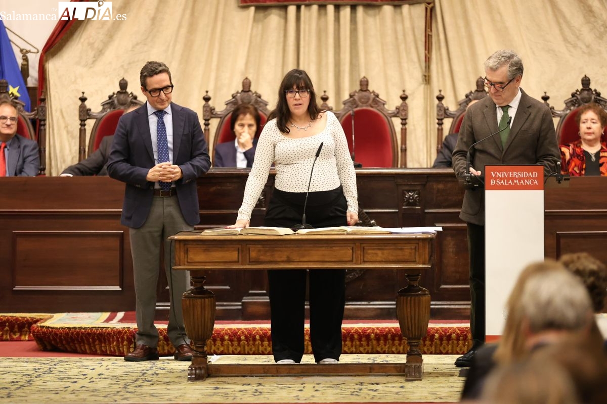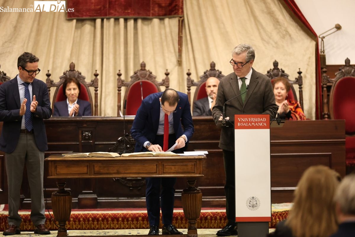 El Paraninfo de la Universidad de Salamanca ha acogido este martes el solemne acto de toma de posesión de un nuevo cargo académico, así como de personal docente e investigador de la institución. La ceremonia, que reafirma el compromiso de la comunidad universitaria con la excelencia académica y la gestión institucional, ha estado encabezada por el máximo responsable de la Universidad, quien ha presidido la sesión protocolaria en el histórico edificio de las Escuelas Mayores.