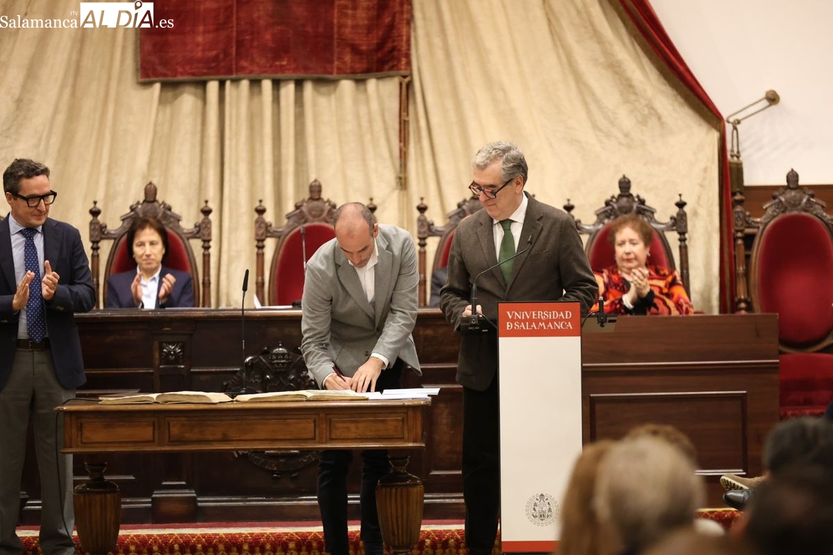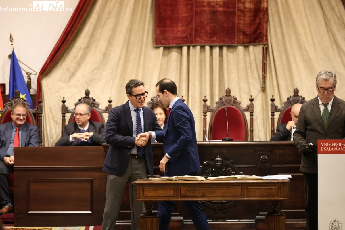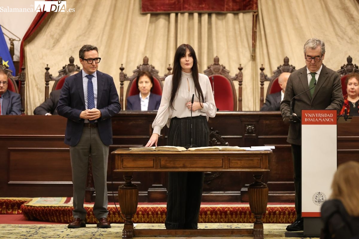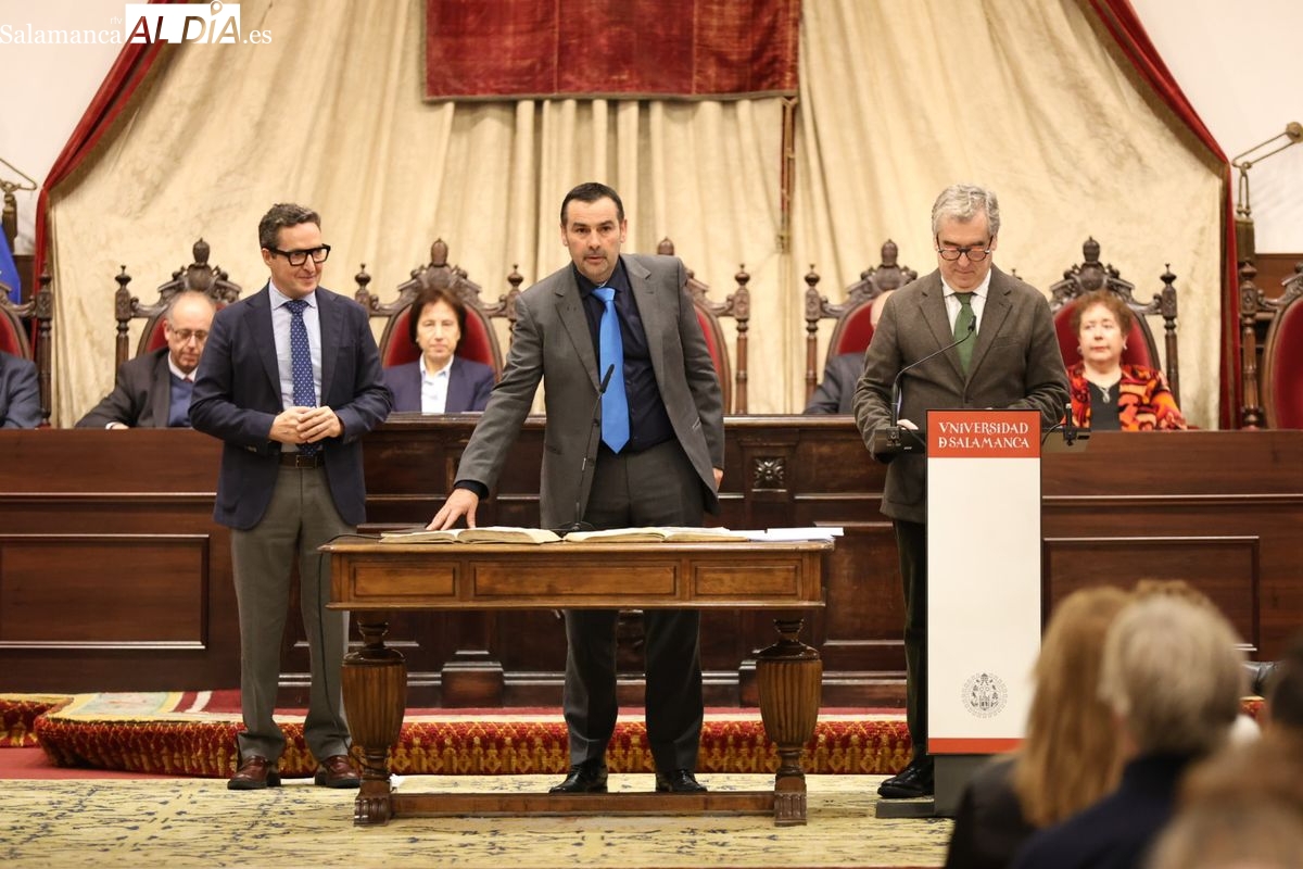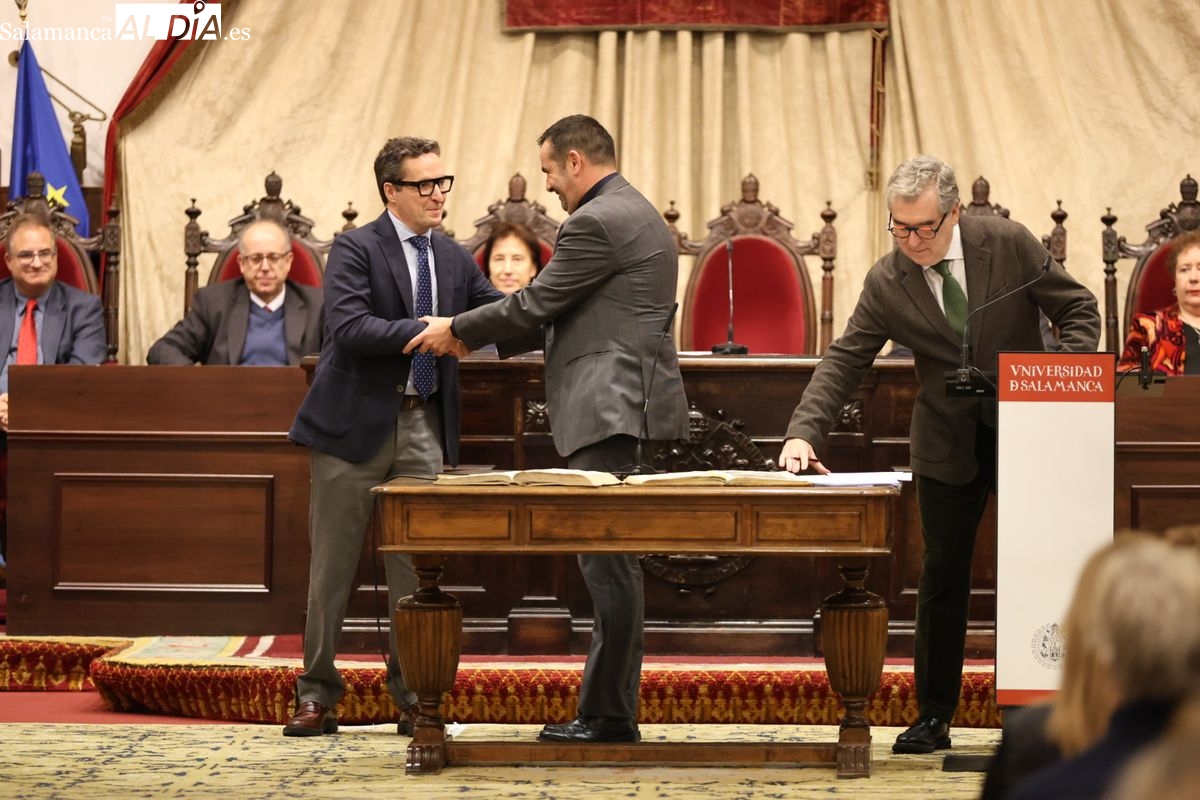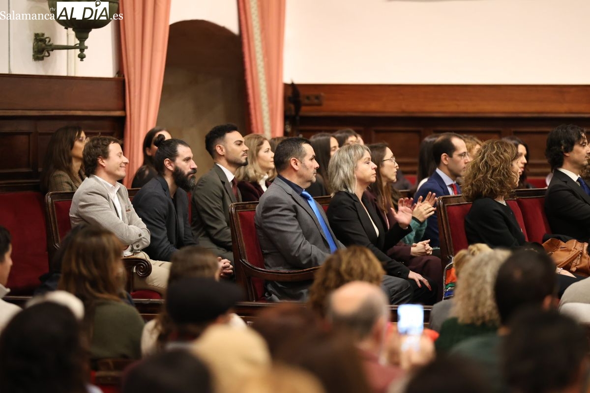 El Paraninfo de la Universidad de Salamanca ha acogido este martes el solemne acto de toma de posesión de un nuevo cargo académico, así como de personal docente e investigador de la institución. La ceremonia, que reafirma el compromiso de la comunidad universitaria con la excelencia académica y la gestión institucional, ha estado encabezada por el máximo responsable de la Universidad, quien ha presidido la sesión protocolaria en el histórico edificio de las Escuelas Mayores.