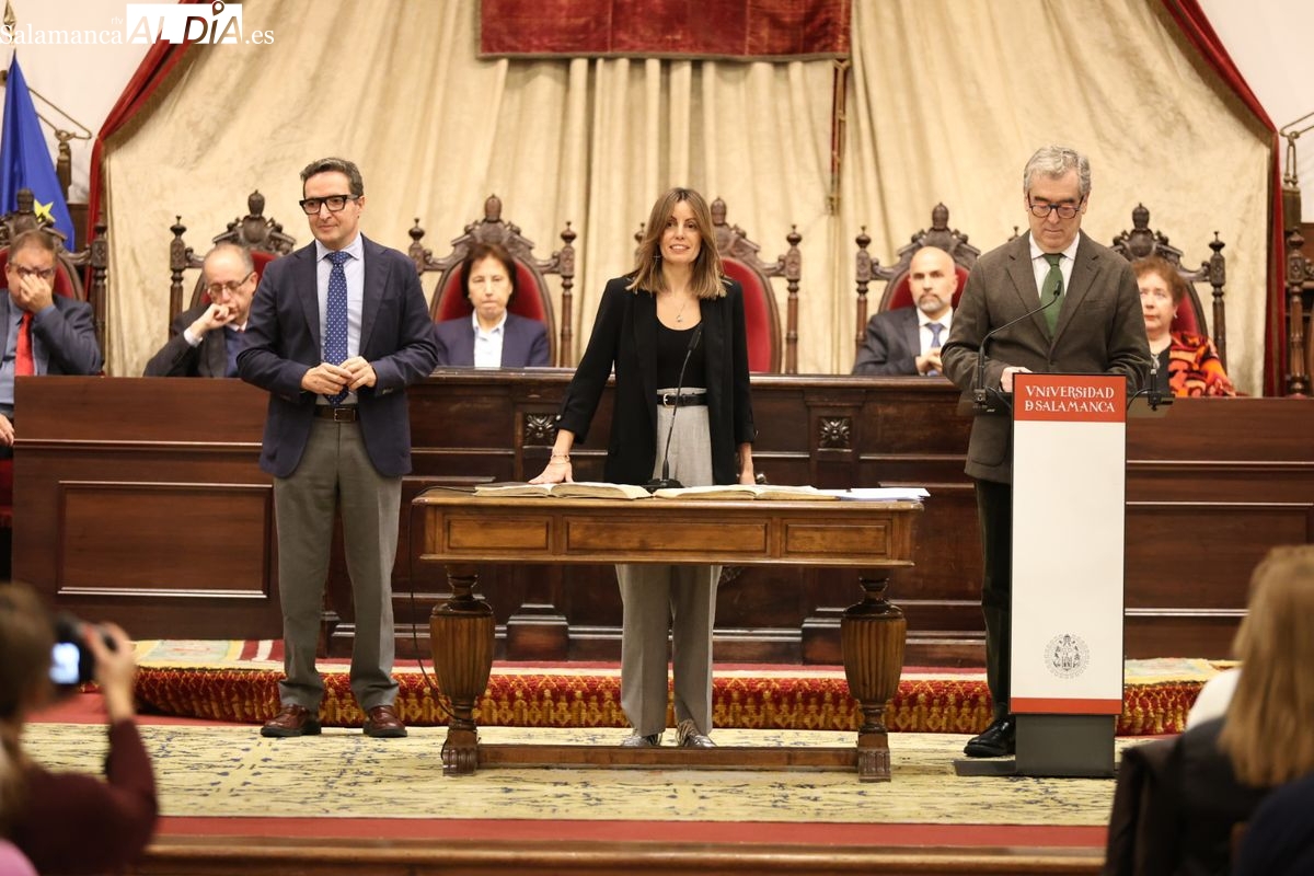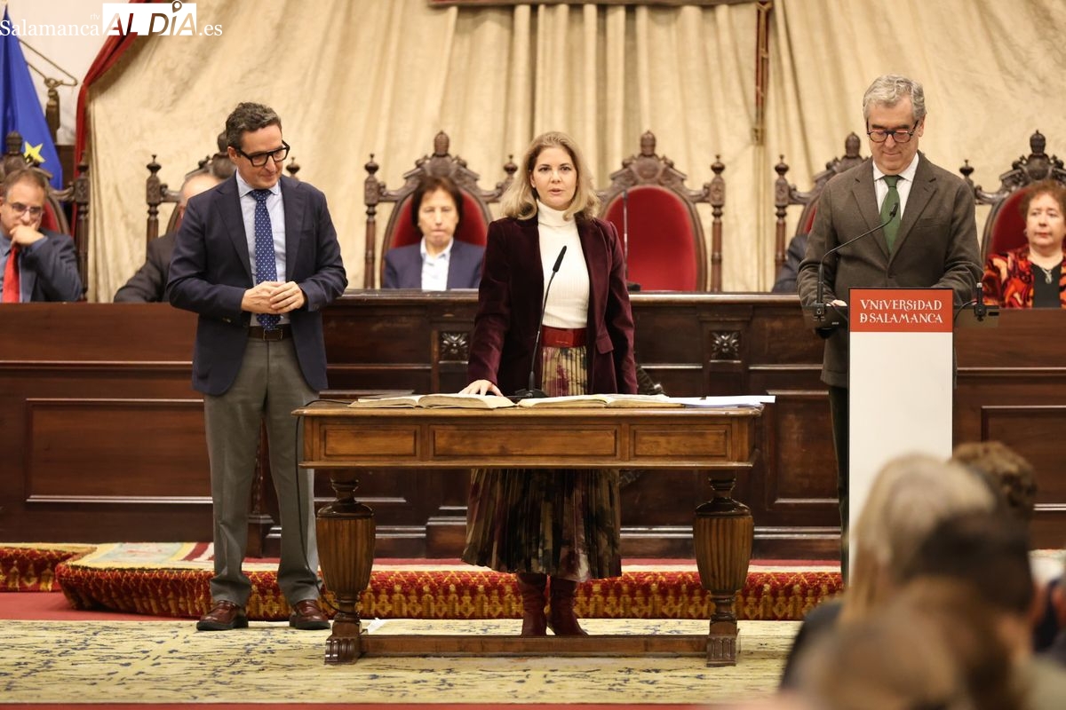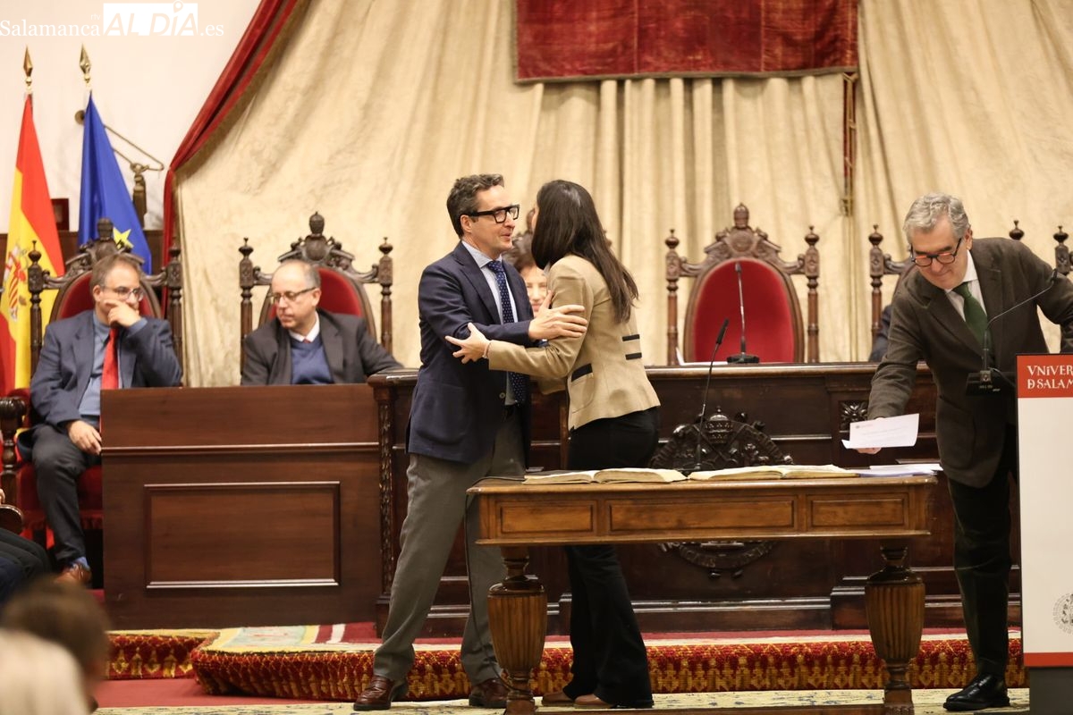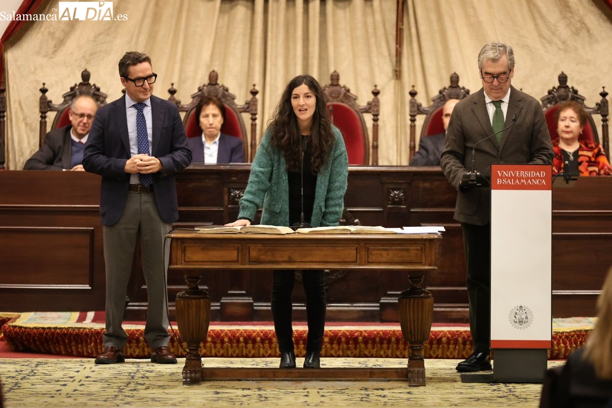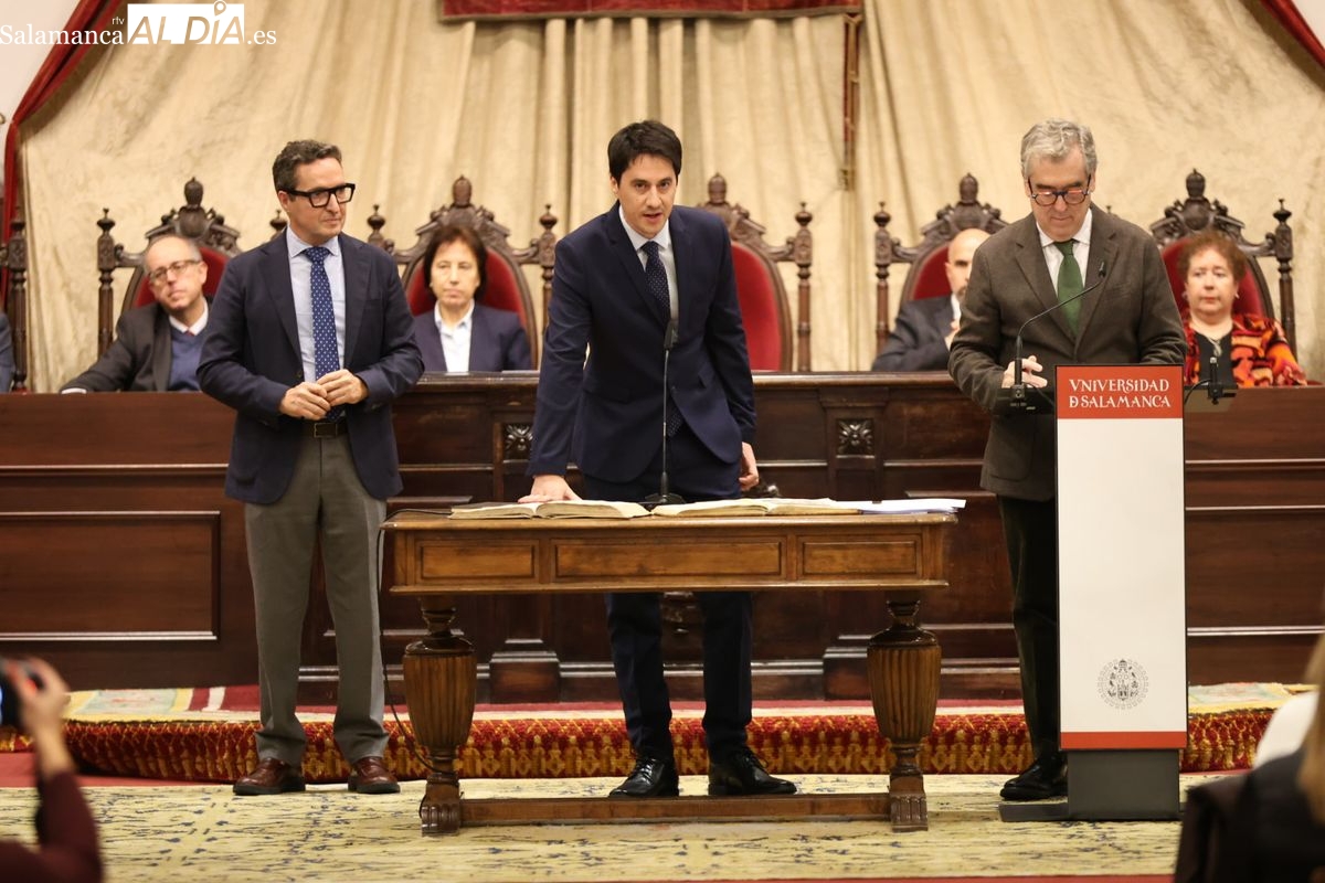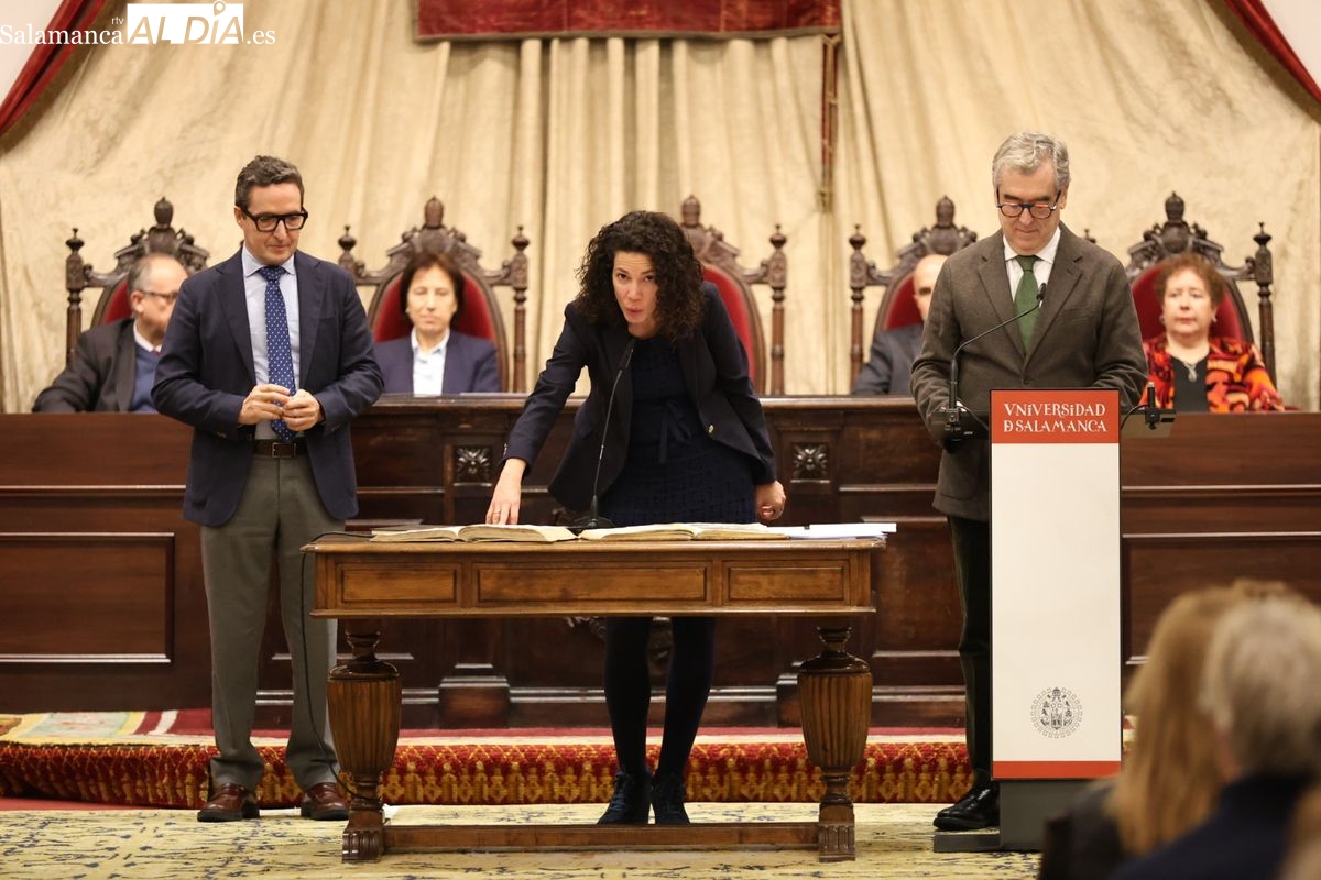 El Paraninfo de la Universidad de Salamanca ha acogido este martes el solemne acto de toma de posesión de un nuevo cargo académico, así como de personal docente e investigador de la institución. La ceremonia, que reafirma el compromiso de la comunidad universitaria con la excelencia académica y la gestión institucional, ha estado encabezada por el máximo responsable de la Universidad, quien ha presidido la sesión protocolaria en el histórico edificio de las Escuelas Mayores.