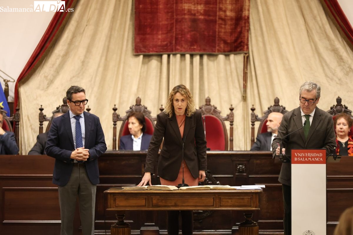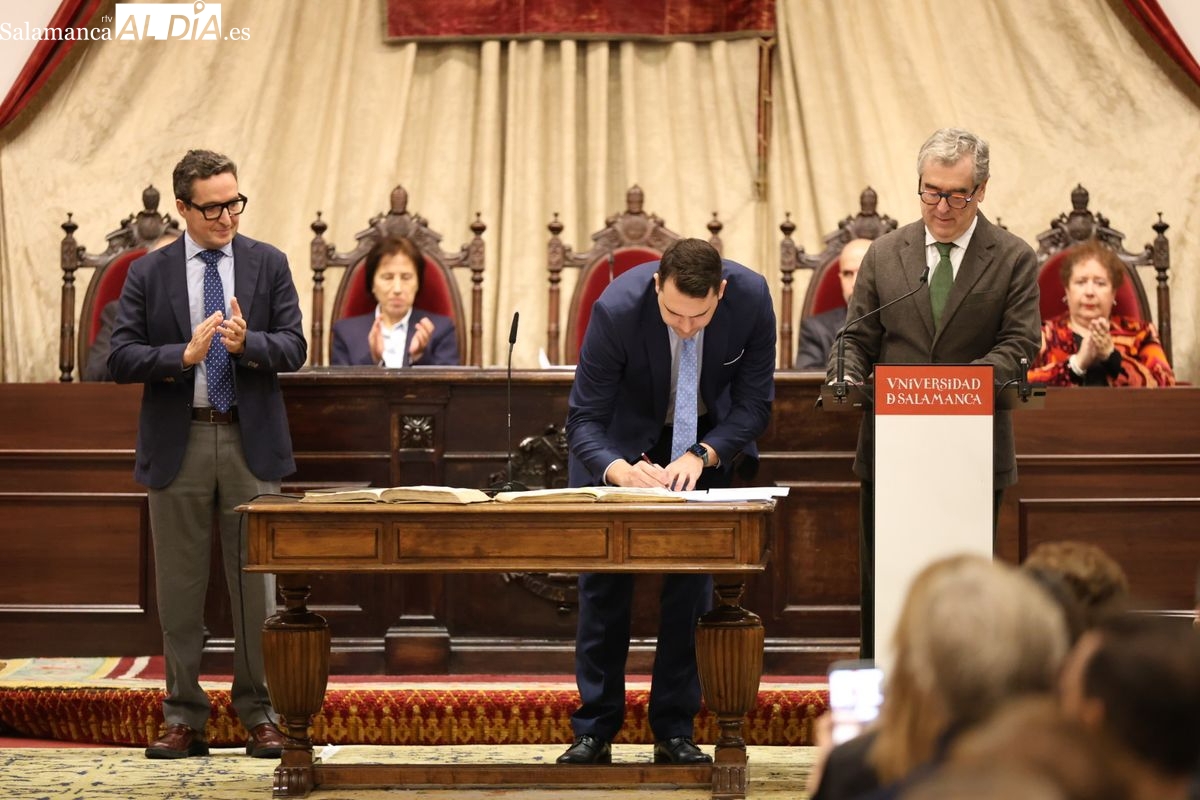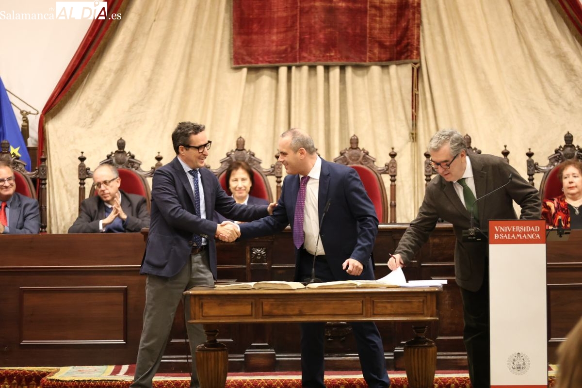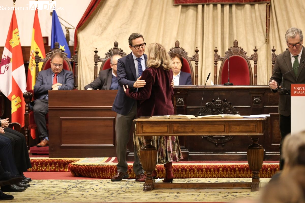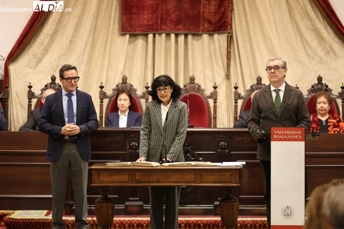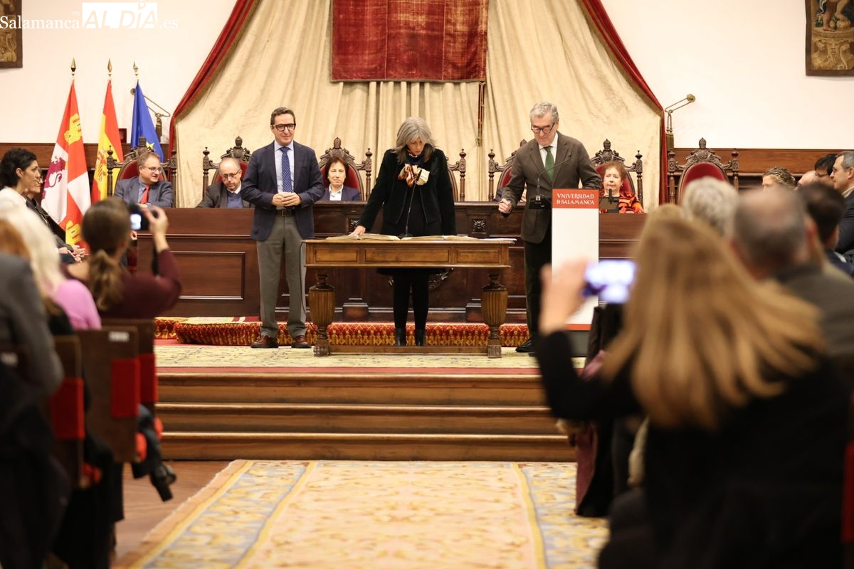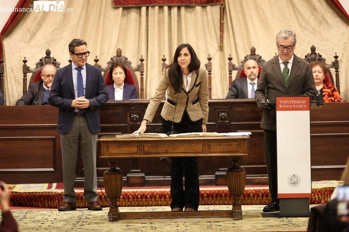 El Paraninfo de la Universidad de Salamanca ha acogido este martes el solemne acto de toma de posesión de un nuevo cargo académico, así como de personal docente e investigador de la institución. La ceremonia, que reafirma el compromiso de la comunidad universitaria con la excelencia académica y la gestión institucional, ha estado encabezada por el máximo responsable de la Universidad, quien ha presidido la sesión protocolaria en el histórico edificio de las Escuelas Mayores.