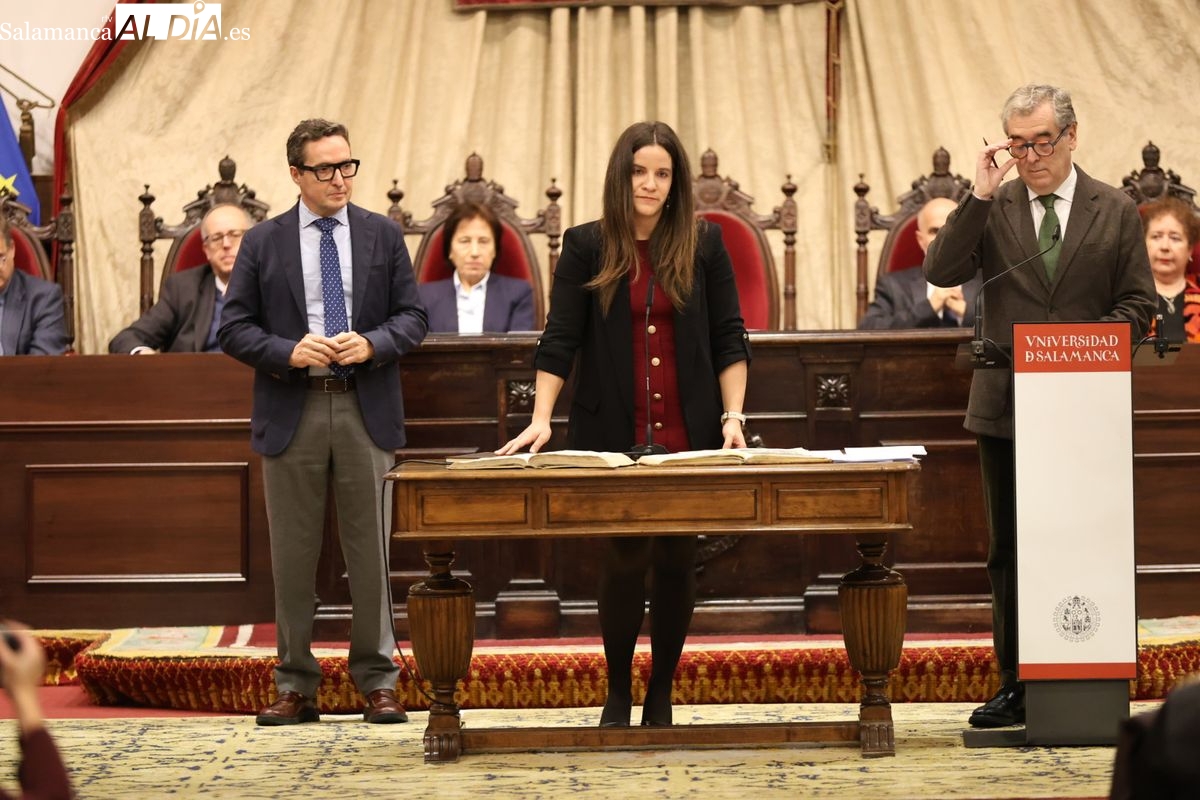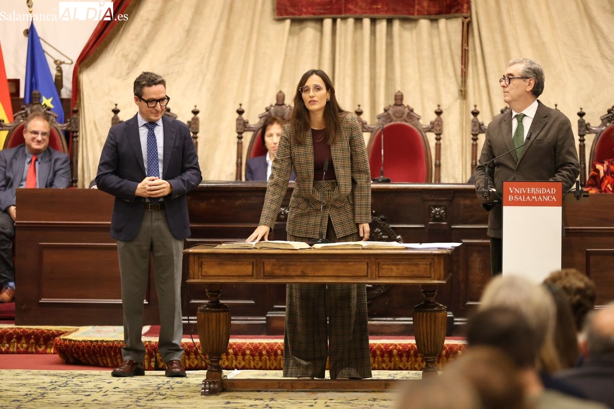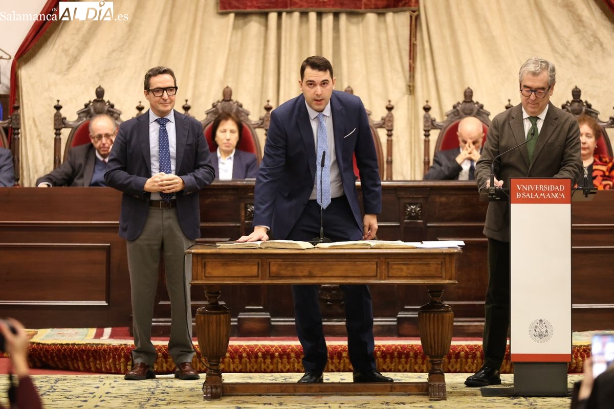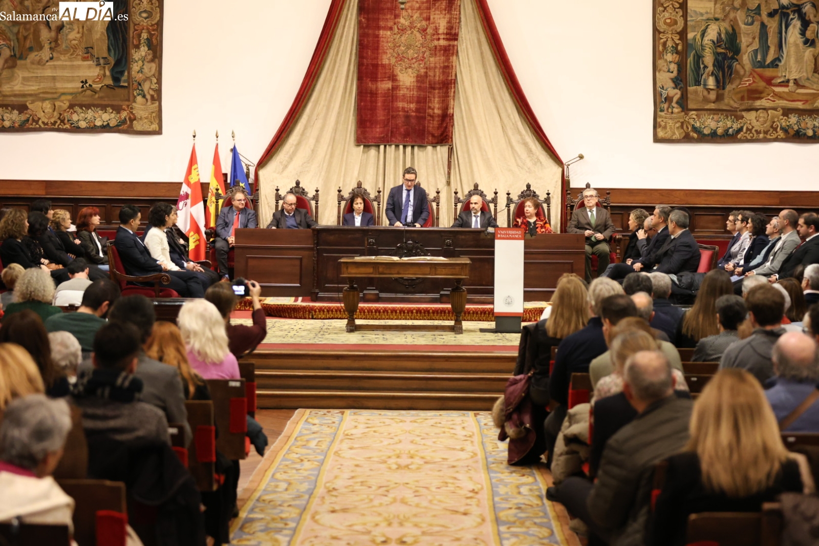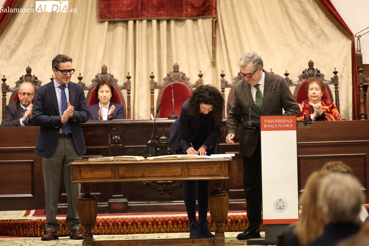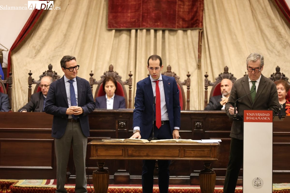 El Paraninfo de la Universidad de Salamanca ha acogido este martes el solemne acto de toma de posesión de un nuevo cargo académico, así como de personal docente e investigador de la institución. La ceremonia, que reafirma el compromiso de la comunidad universitaria con la excelencia académica y la gestión institucional, ha estado encabezada por el máximo responsable de la Universidad, quien ha presidido la sesión protocolaria en el histórico edificio de las Escuelas Mayores.