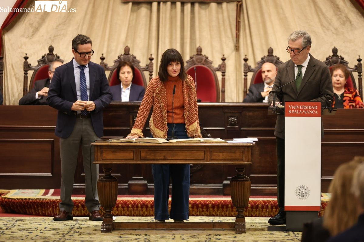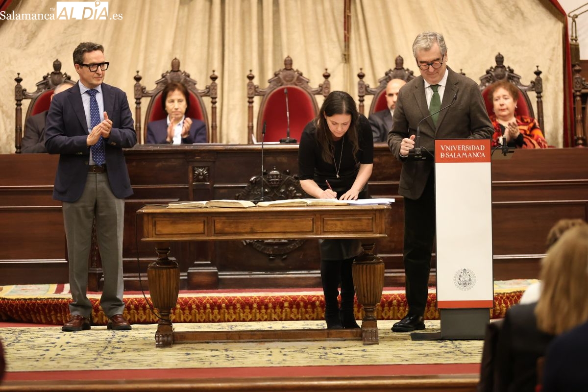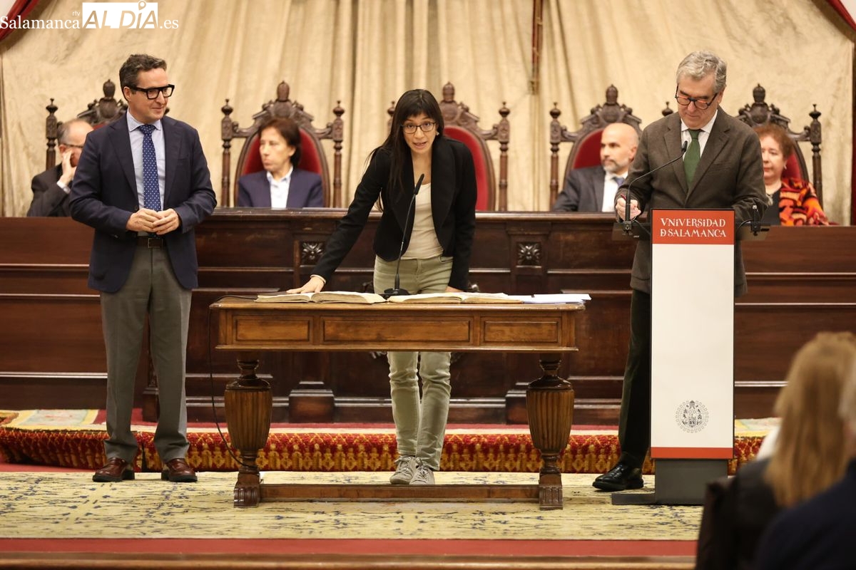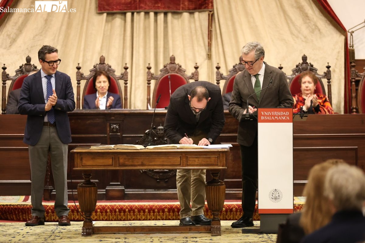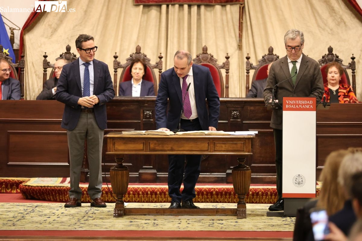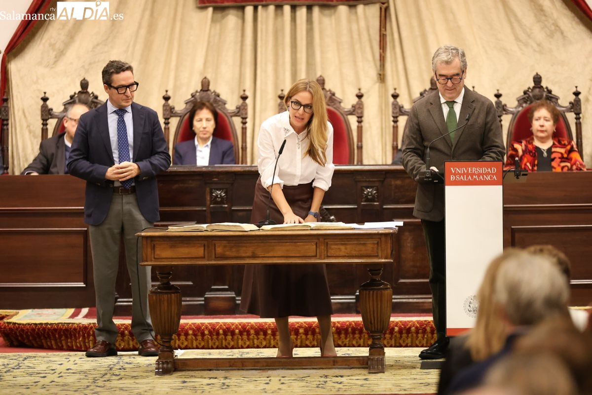 El Paraninfo de la Universidad de Salamanca ha acogido este martes el solemne acto de toma de posesión de un nuevo cargo académico, así como de personal docente e investigador de la institución. La ceremonia, que reafirma el compromiso de la comunidad universitaria con la excelencia académica y la gestión institucional, ha estado encabezada por el máximo responsable de la Universidad, quien ha presidido la sesión protocolaria en el histórico edificio de las Escuelas Mayores.
