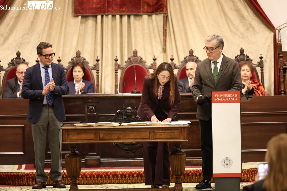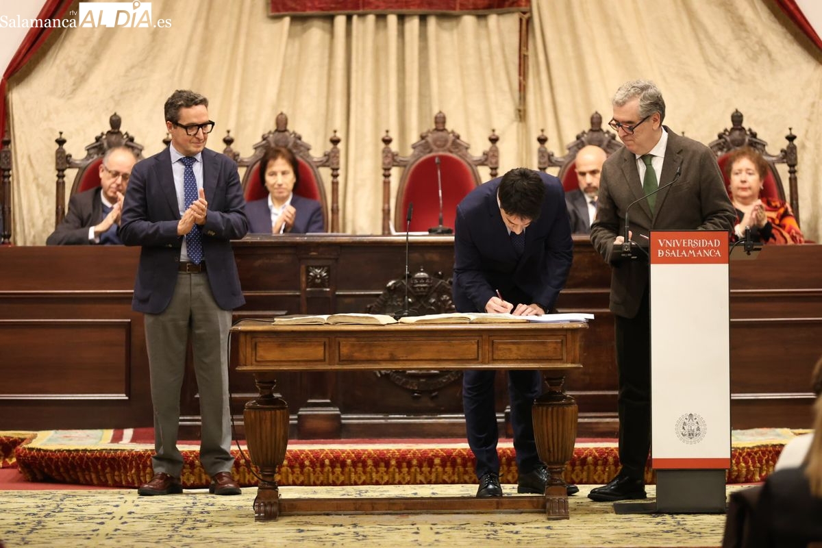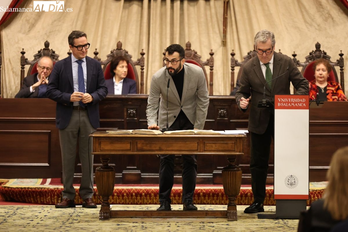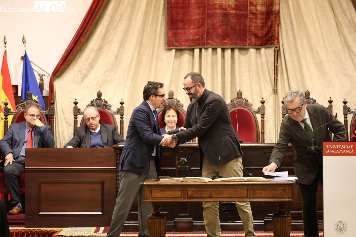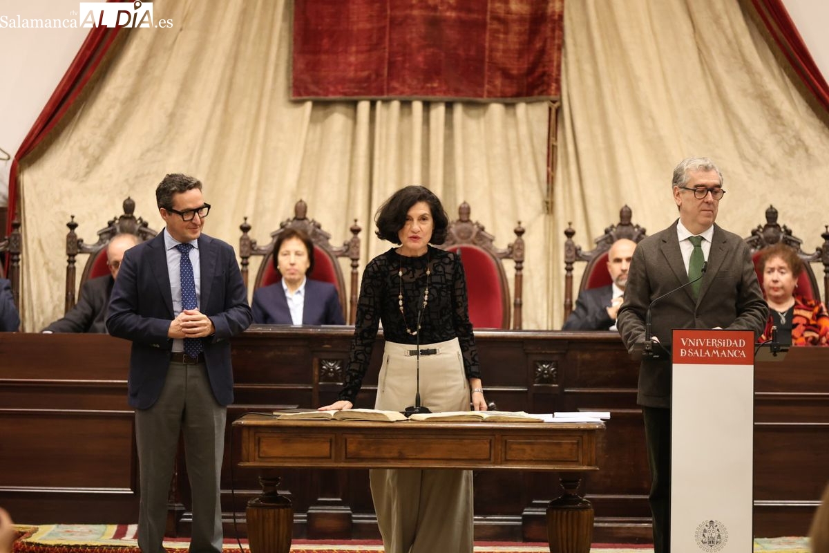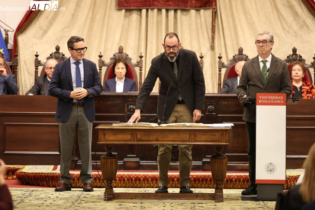 El Paraninfo de la Universidad de Salamanca ha acogido este martes el solemne acto de toma de posesión de un nuevo cargo académico, así como de personal docente e investigador de la institución. La ceremonia, que reafirma el compromiso de la comunidad universitaria con la excelencia académica y la gestión institucional, ha estado encabezada por el máximo responsable de la Universidad, quien ha presidido la sesión protocolaria en el histórico edificio de las Escuelas Mayores.