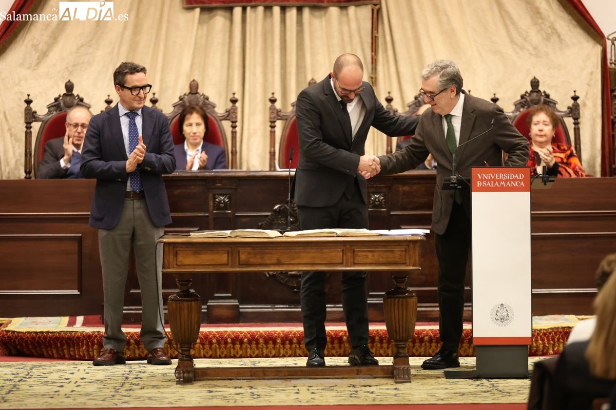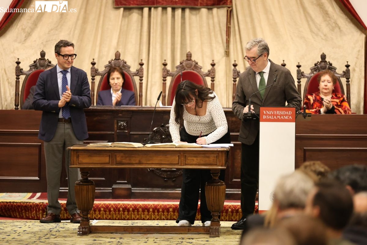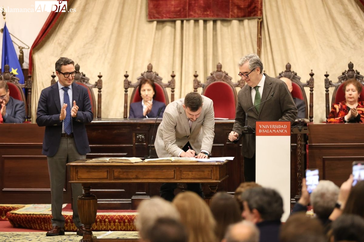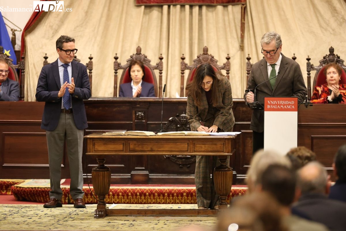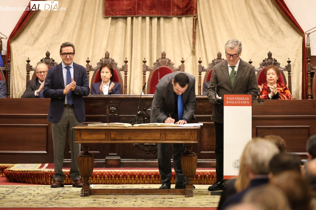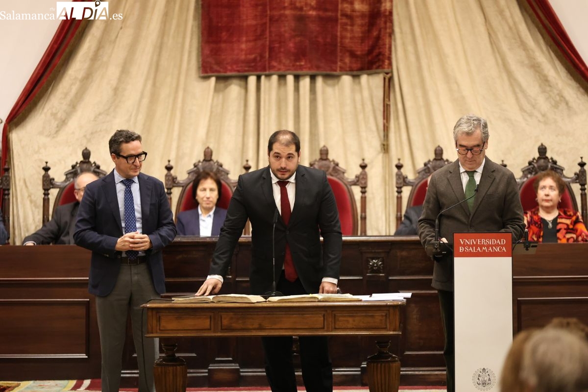 El Paraninfo de la Universidad de Salamanca ha acogido este martes el solemne acto de toma de posesión de un nuevo cargo académico, así como de personal docente e investigador de la institución. La ceremonia, que reafirma el compromiso de la comunidad universitaria con la excelencia académica y la gestión institucional, ha estado encabezada por el máximo responsable de la Universidad, quien ha presidido la sesión protocolaria en el histórico edificio de las Escuelas Mayores.