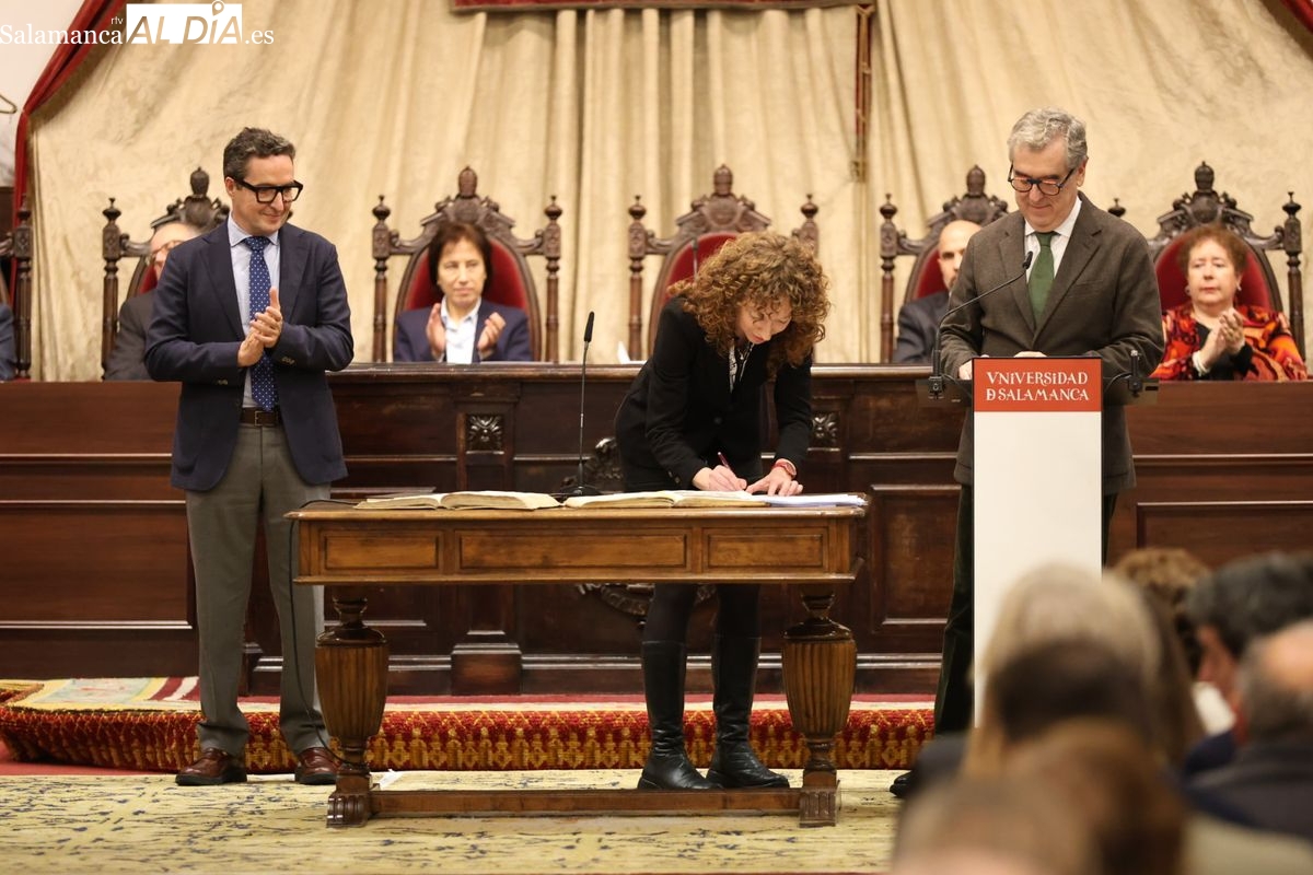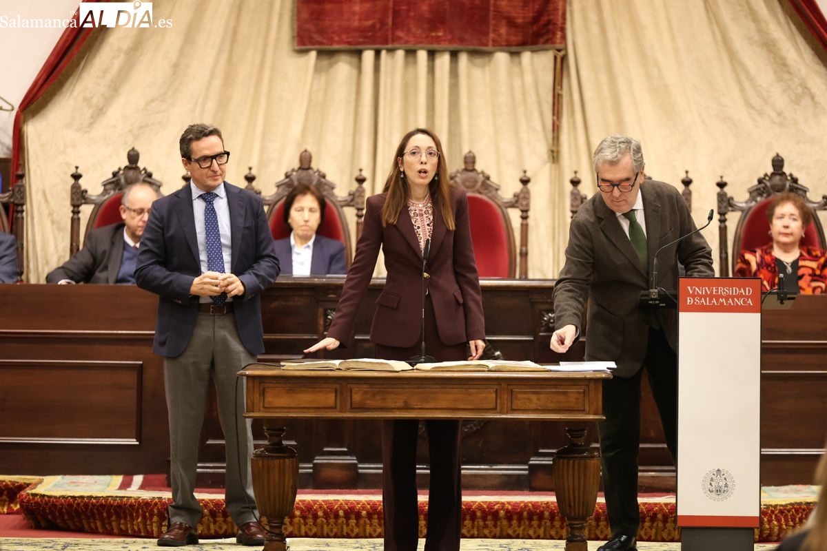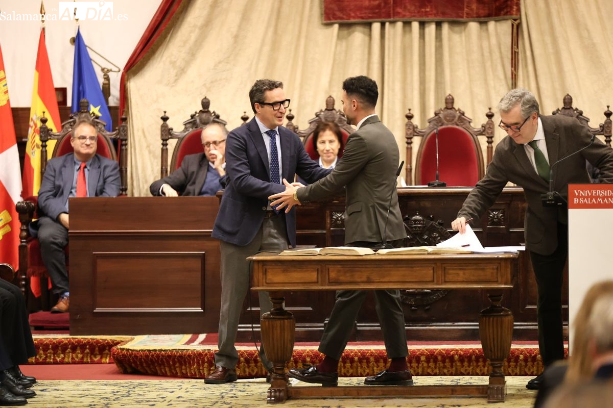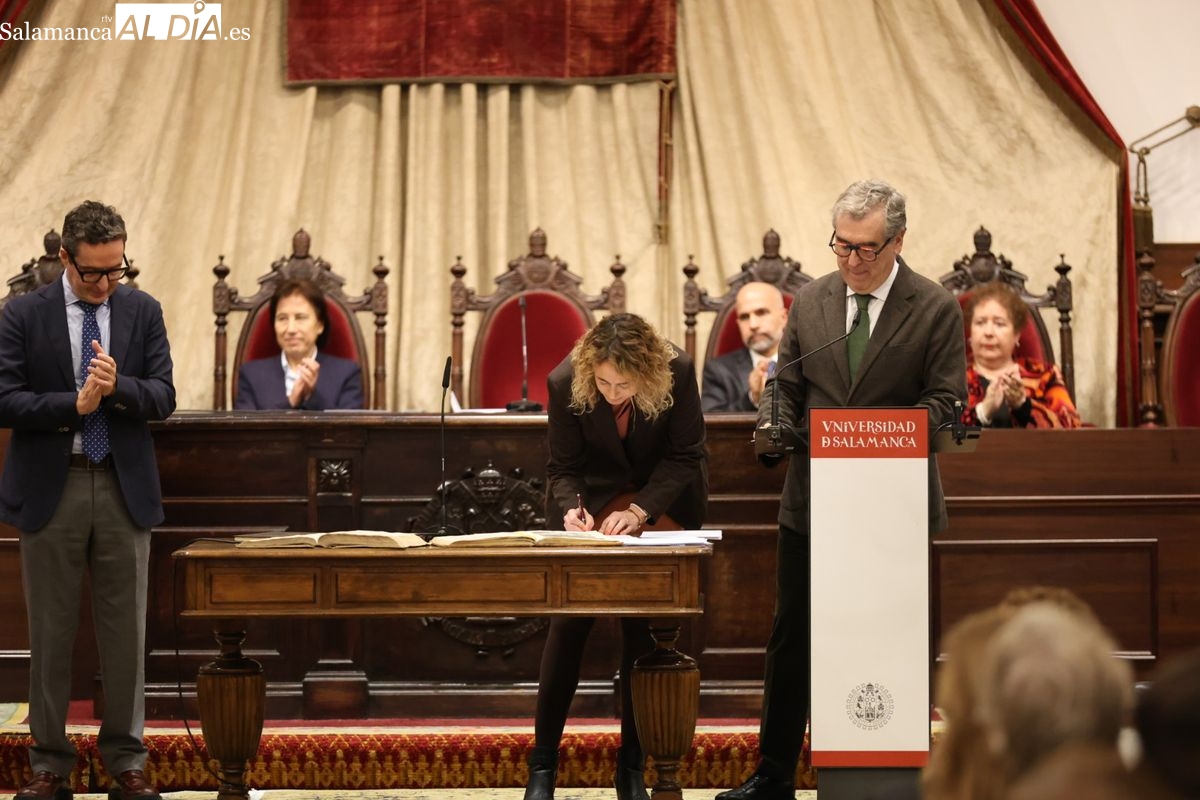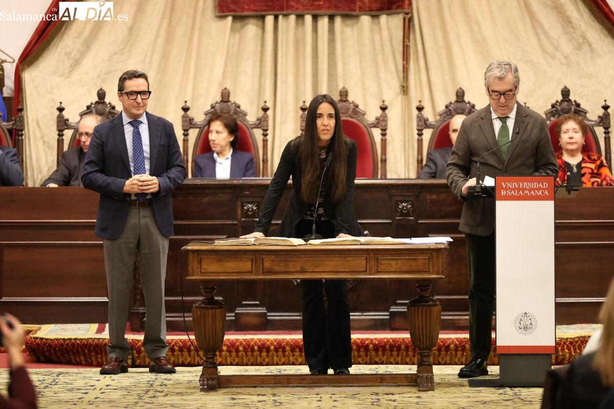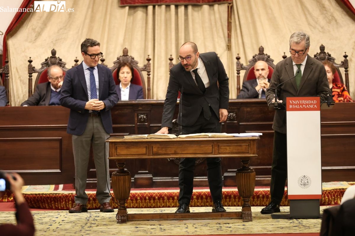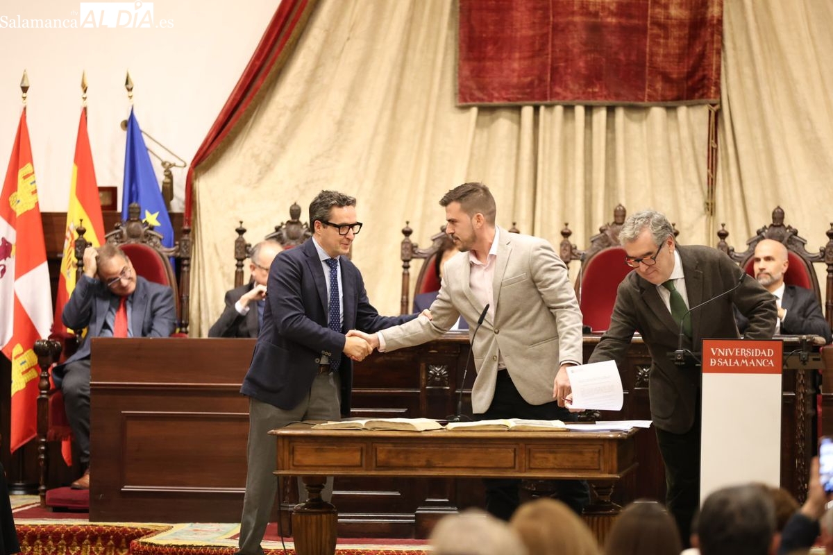 El Paraninfo de la Universidad de Salamanca ha acogido este martes el solemne acto de toma de posesión de un nuevo cargo académico, así como de personal docente e investigador de la institución. La ceremonia, que reafirma el compromiso de la comunidad universitaria con la excelencia académica y la gestión institucional, ha estado encabezada por el máximo responsable de la Universidad, quien ha presidido la sesión protocolaria en el histórico edificio de las Escuelas Mayores.