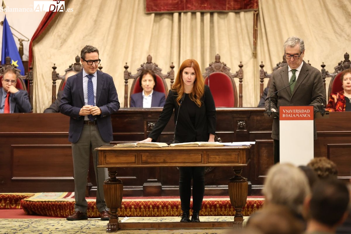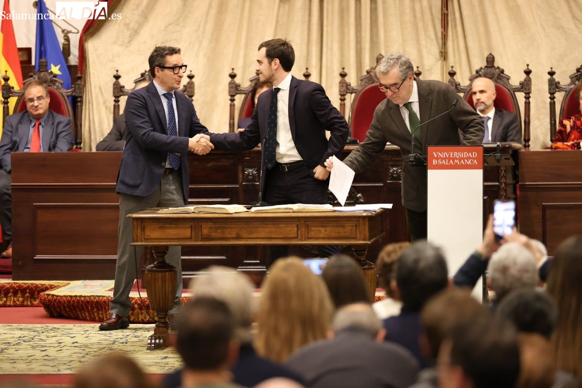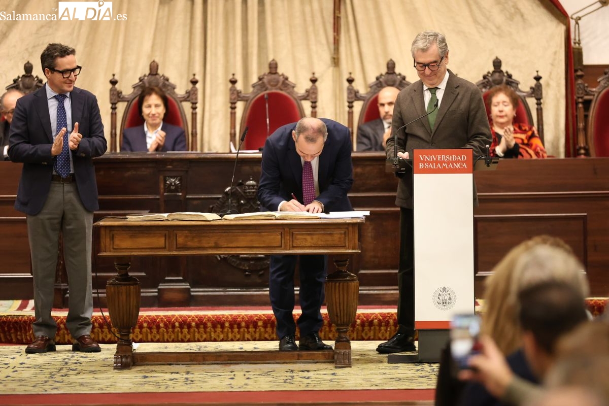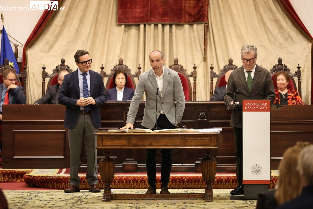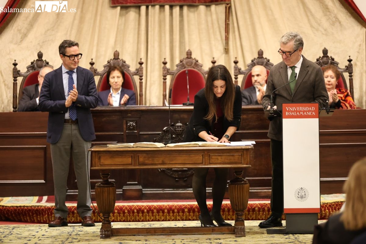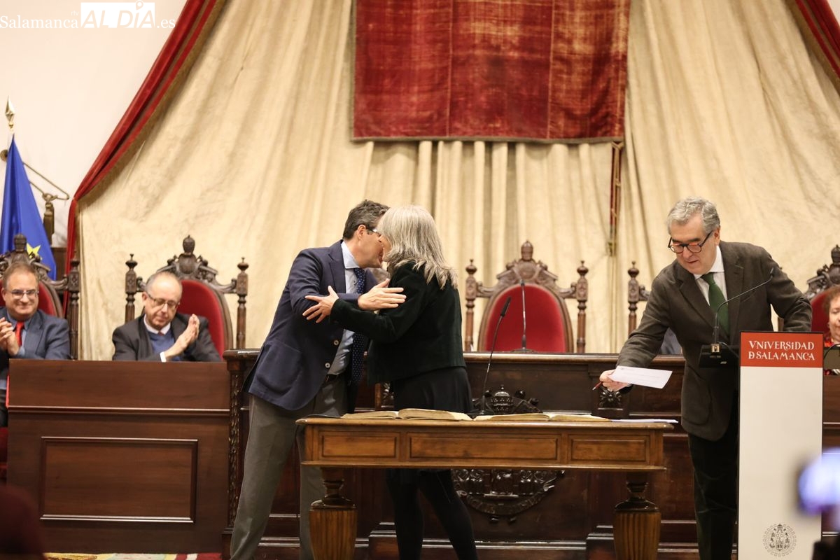 El Paraninfo de la Universidad de Salamanca ha acogido este martes el solemne acto de toma de posesión de un nuevo cargo académico, así como de personal docente e investigador de la institución. La ceremonia, que reafirma el compromiso de la comunidad universitaria con la excelencia académica y la gestión institucional, ha estado encabezada por el máximo responsable de la Universidad, quien ha presidido la sesión protocolaria en el histórico edificio de las Escuelas Mayores.