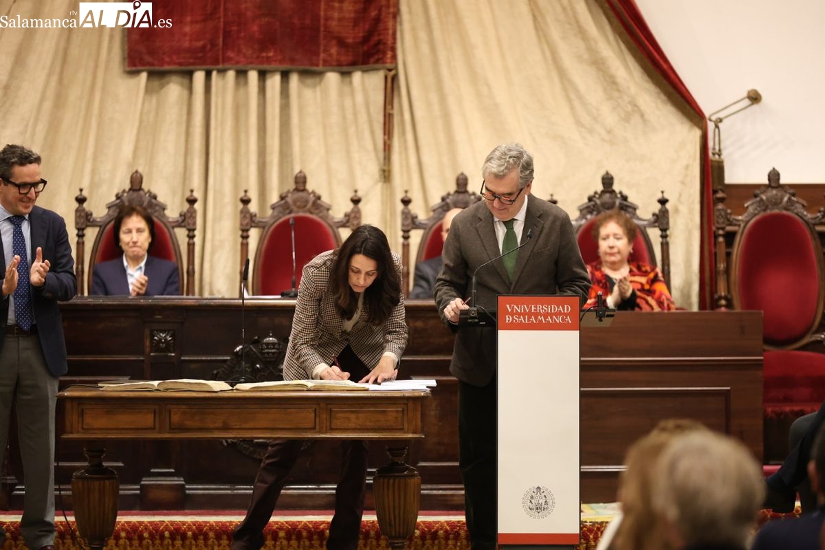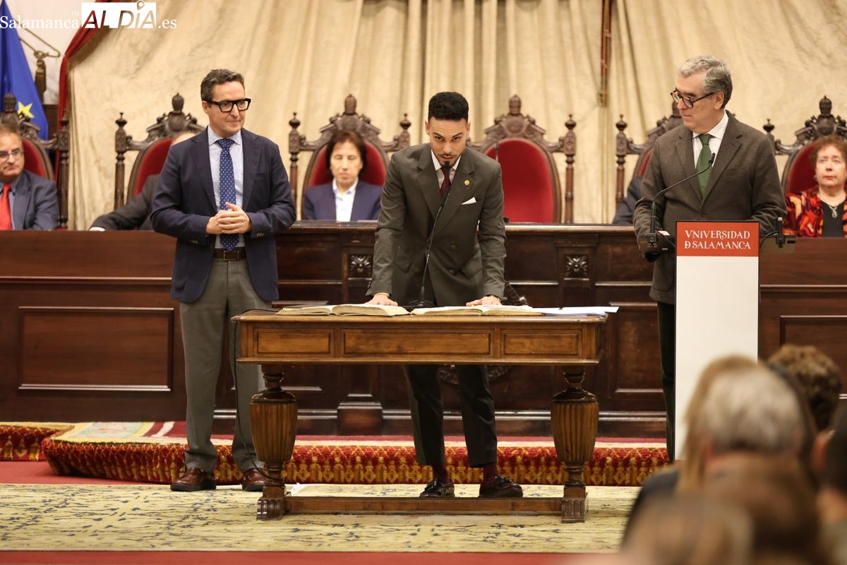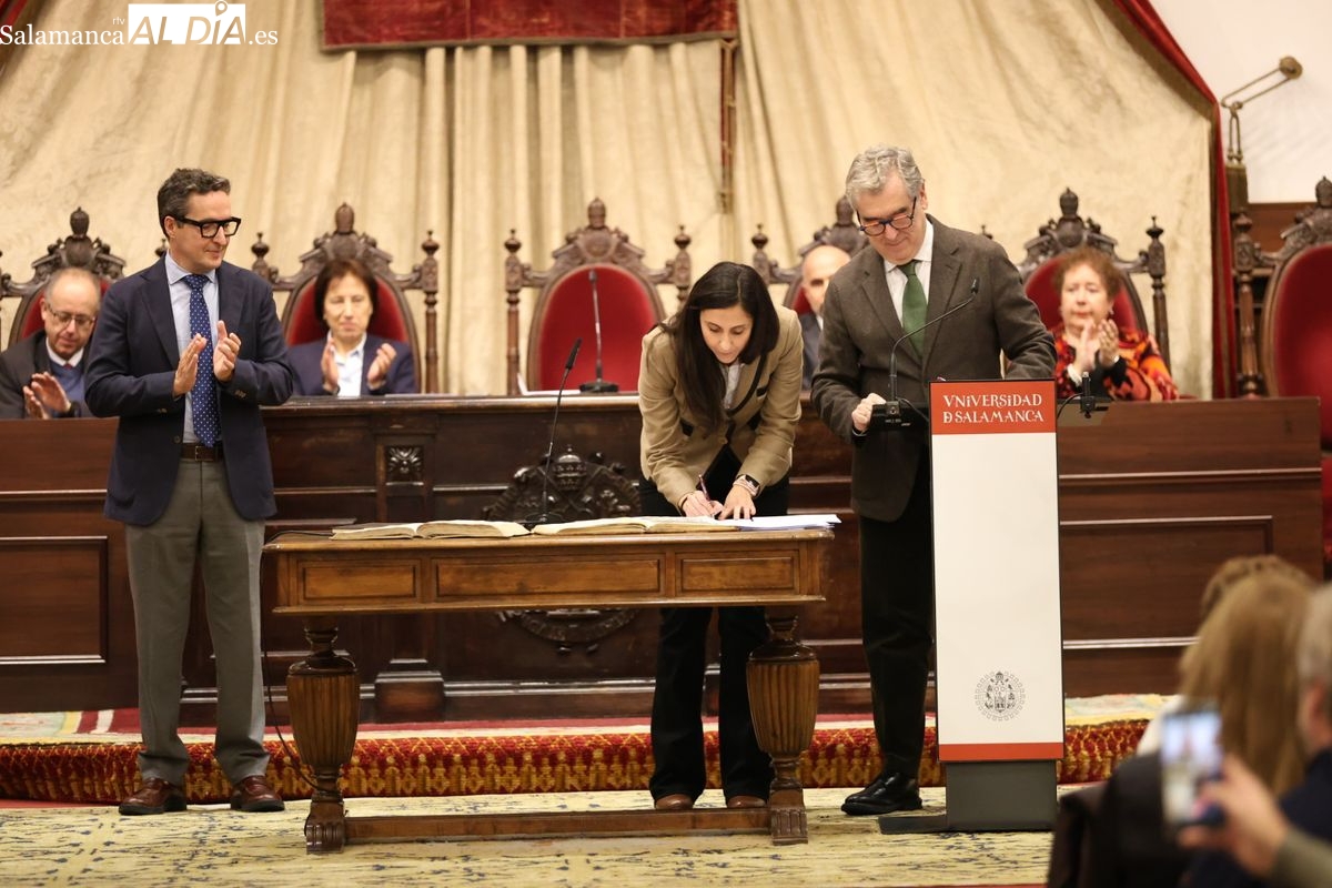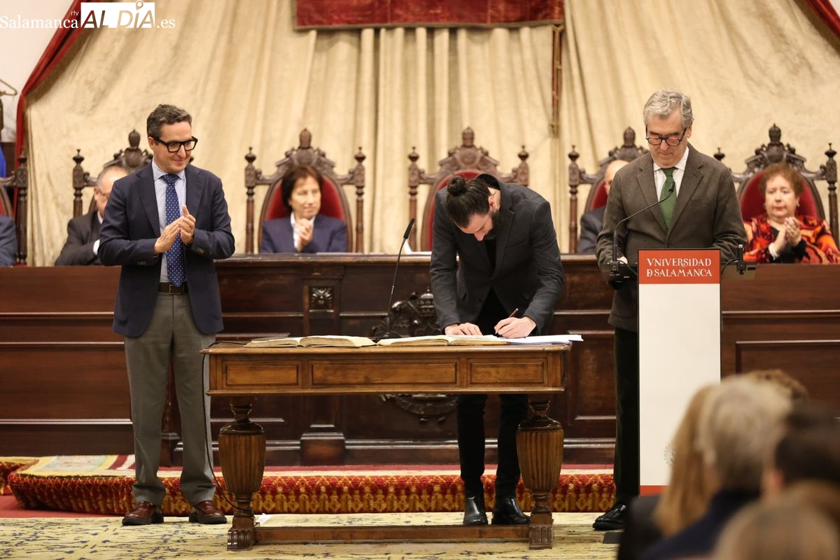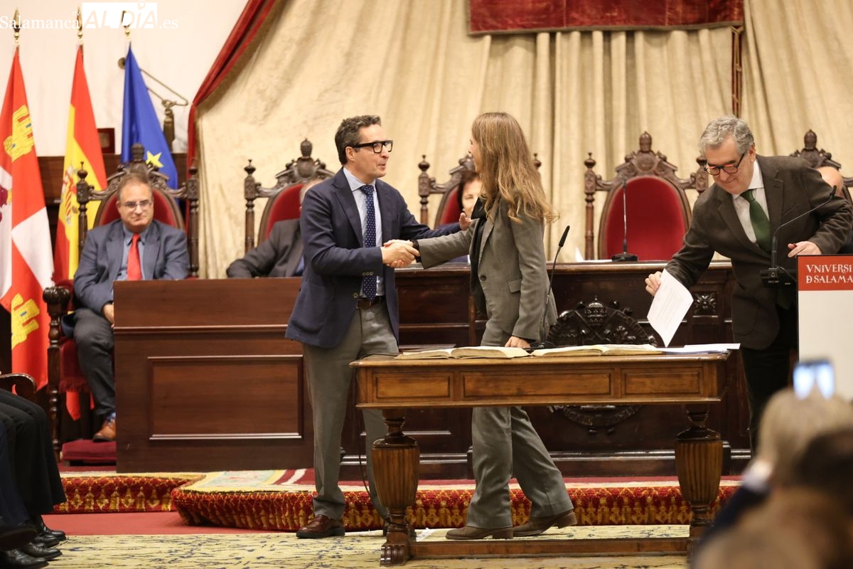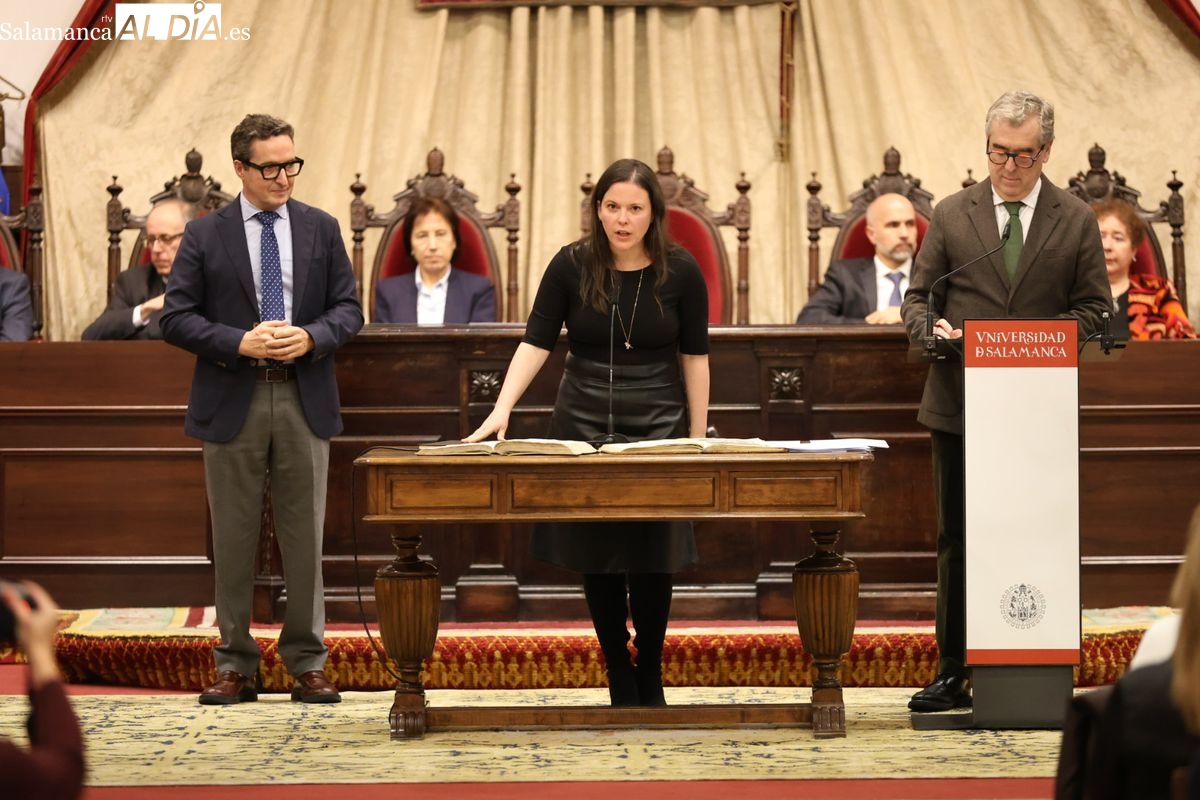 El Paraninfo de la Universidad de Salamanca ha acogido este martes el solemne acto de toma de posesión de un nuevo cargo académico, así como de personal docente e investigador de la institución. La ceremonia, que reafirma el compromiso de la comunidad universitaria con la excelencia académica y la gestión institucional, ha estado encabezada por el máximo responsable de la Universidad, quien ha presidido la sesión protocolaria en el histórico edificio de las Escuelas Mayores.
