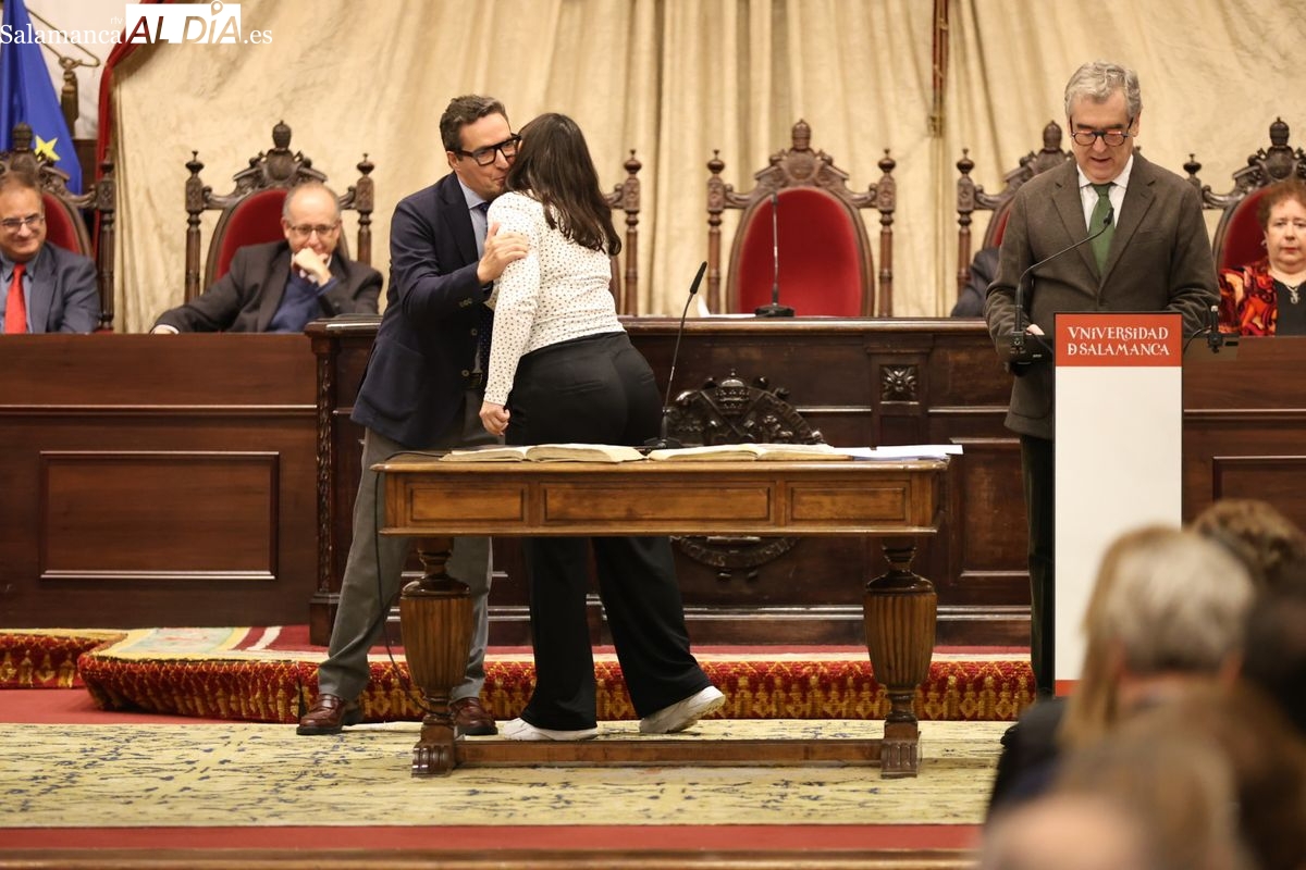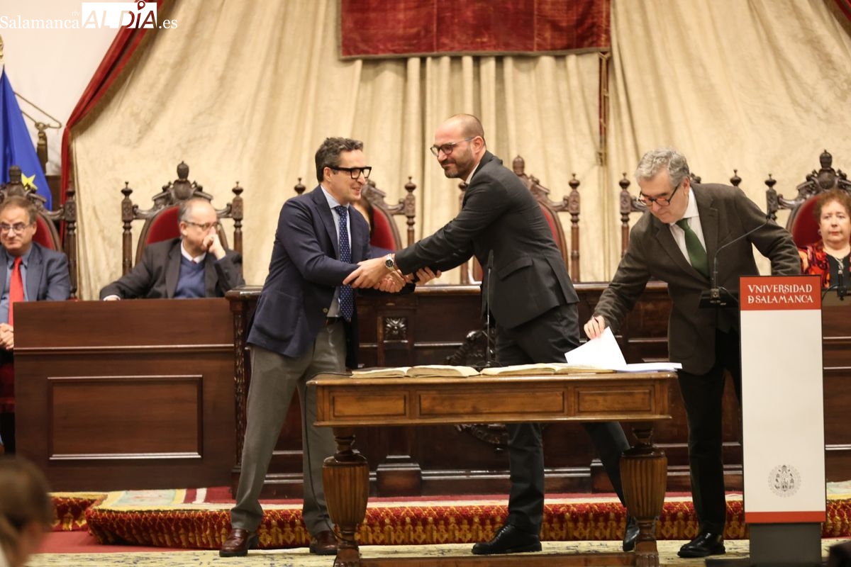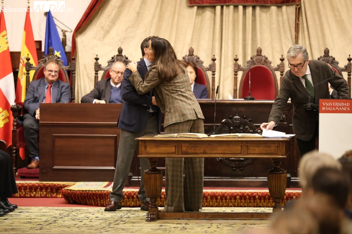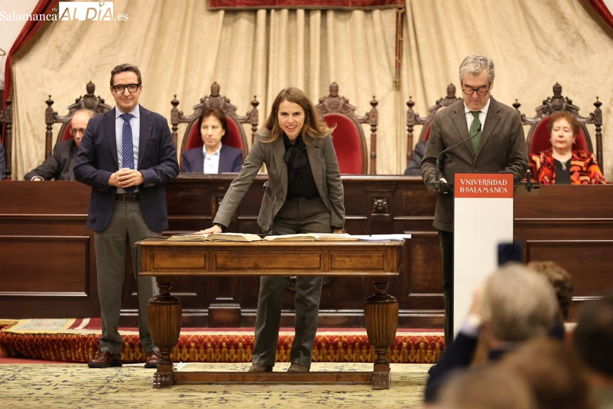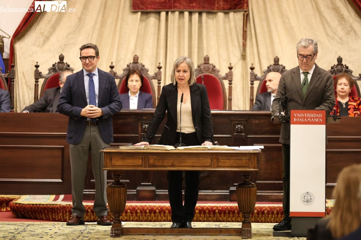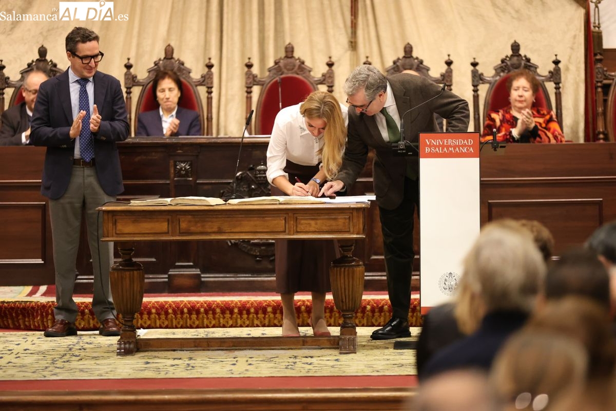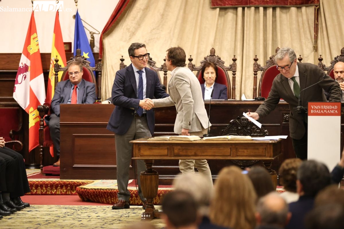 El Paraninfo de la Universidad de Salamanca ha acogido este martes el solemne acto de toma de posesión de un nuevo cargo académico, así como de personal docente e investigador de la institución. La ceremonia, que reafirma el compromiso de la comunidad universitaria con la excelencia académica y la gestión institucional, ha estado encabezada por el máximo responsable de la Universidad, quien ha presidido la sesión protocolaria en el histórico edificio de las Escuelas Mayores.
