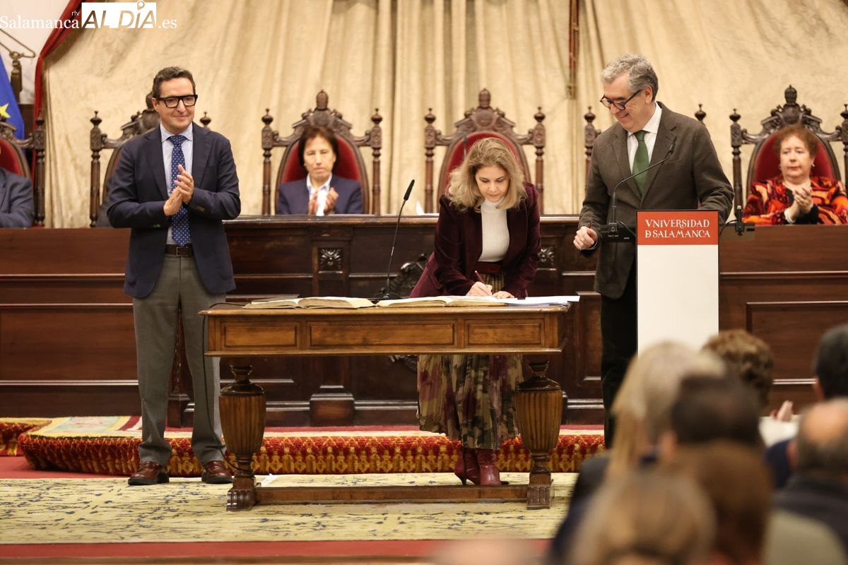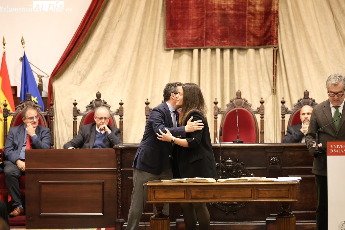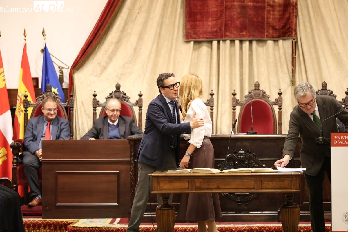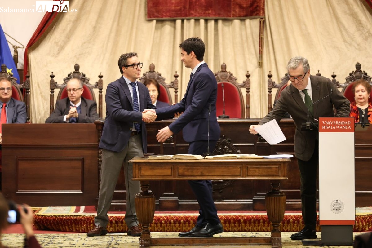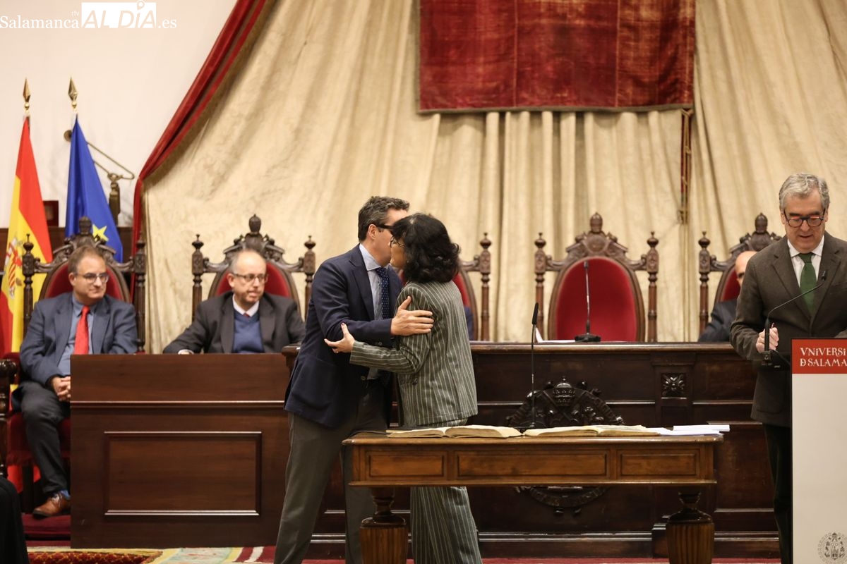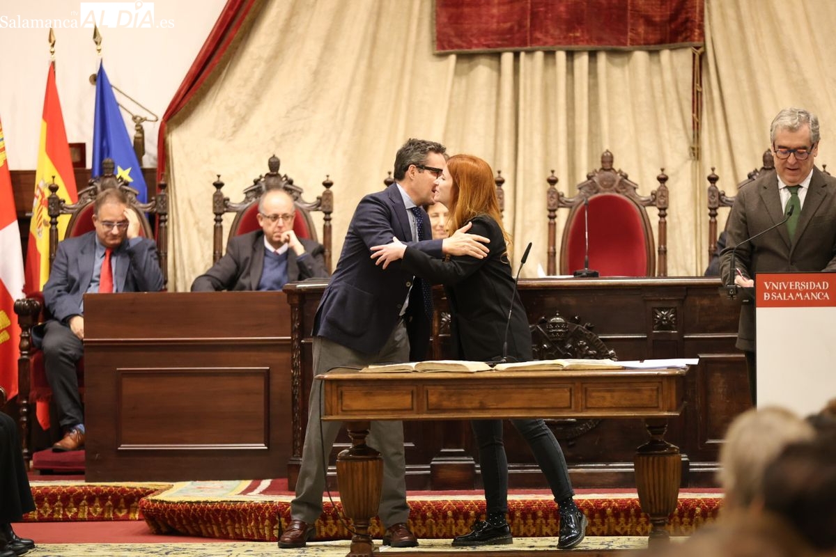 El Paraninfo de la Universidad de Salamanca ha acogido este martes el solemne acto de toma de posesión de un nuevo cargo académico, así como de personal docente e investigador de la institución. La ceremonia, que reafirma el compromiso de la comunidad universitaria con la excelencia académica y la gestión institucional, ha estado encabezada por el máximo responsable de la Universidad, quien ha presidido la sesión protocolaria en el histórico edificio de las Escuelas Mayores.