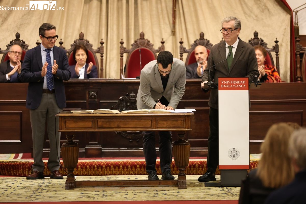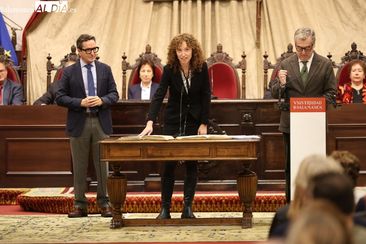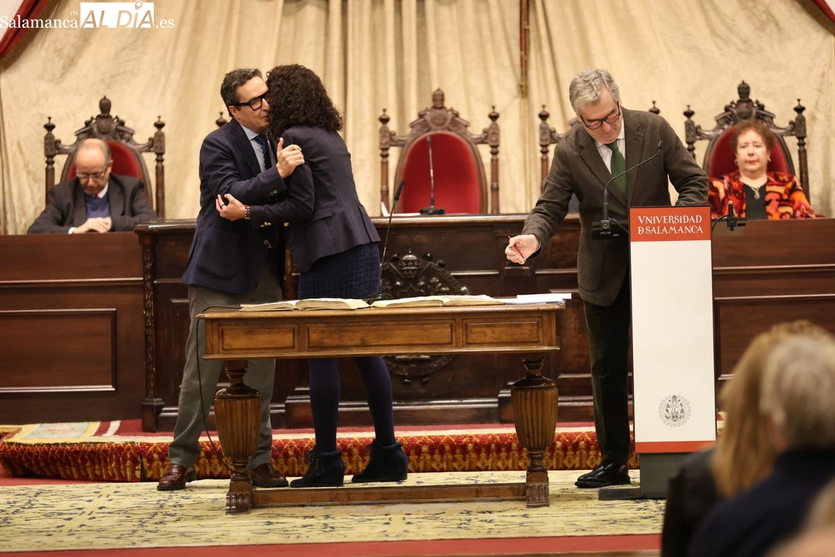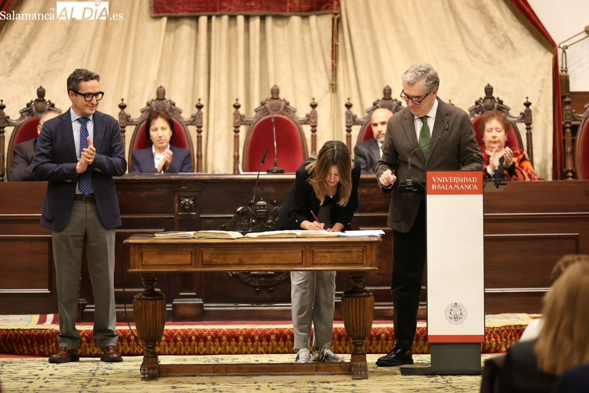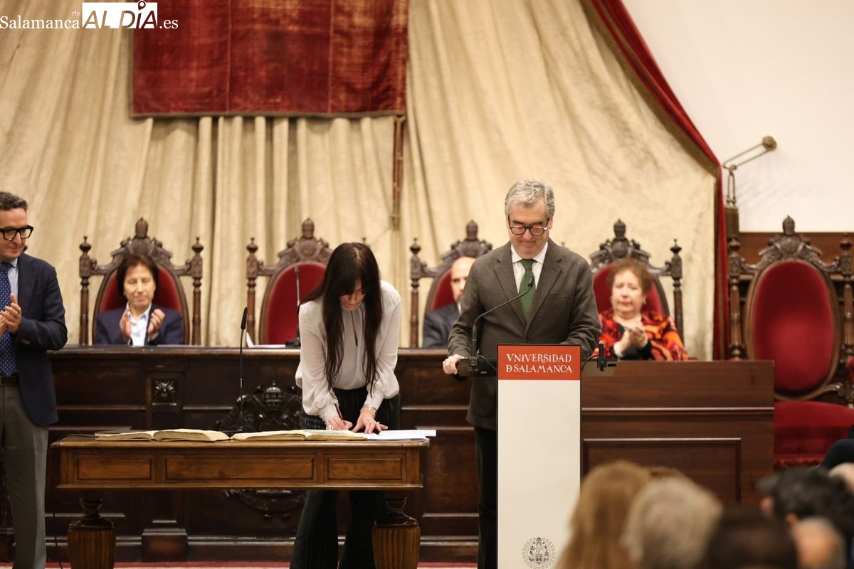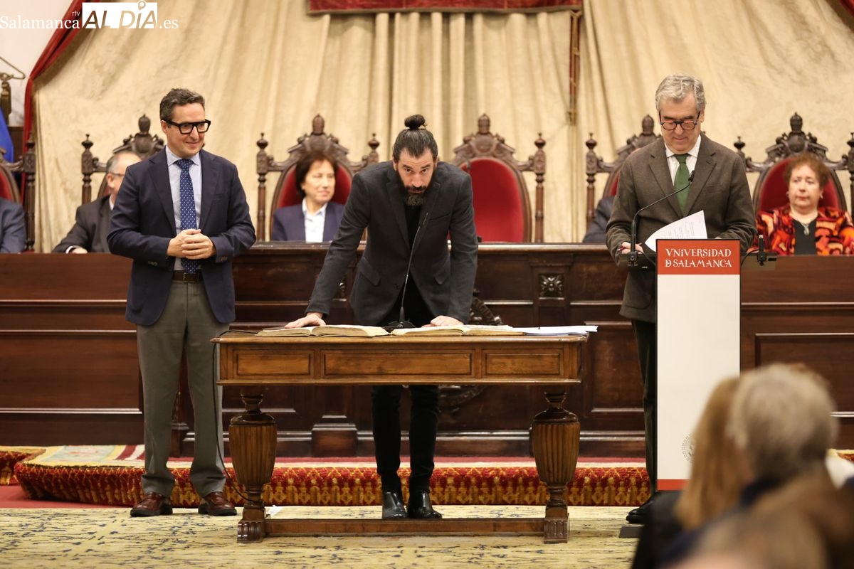 El Paraninfo de la Universidad de Salamanca ha acogido este martes el solemne acto de toma de posesión de un nuevo cargo académico, así como de personal docente e investigador de la institución. La ceremonia, que reafirma el compromiso de la comunidad universitaria con la excelencia académica y la gestión institucional, ha estado encabezada por el máximo responsable de la Universidad, quien ha presidido la sesión protocolaria en el histórico edificio de las Escuelas Mayores.