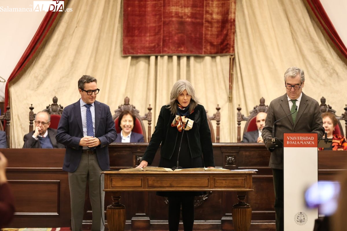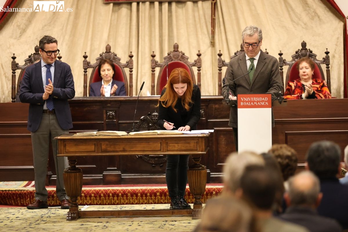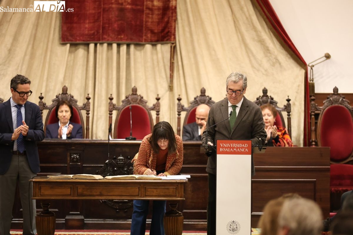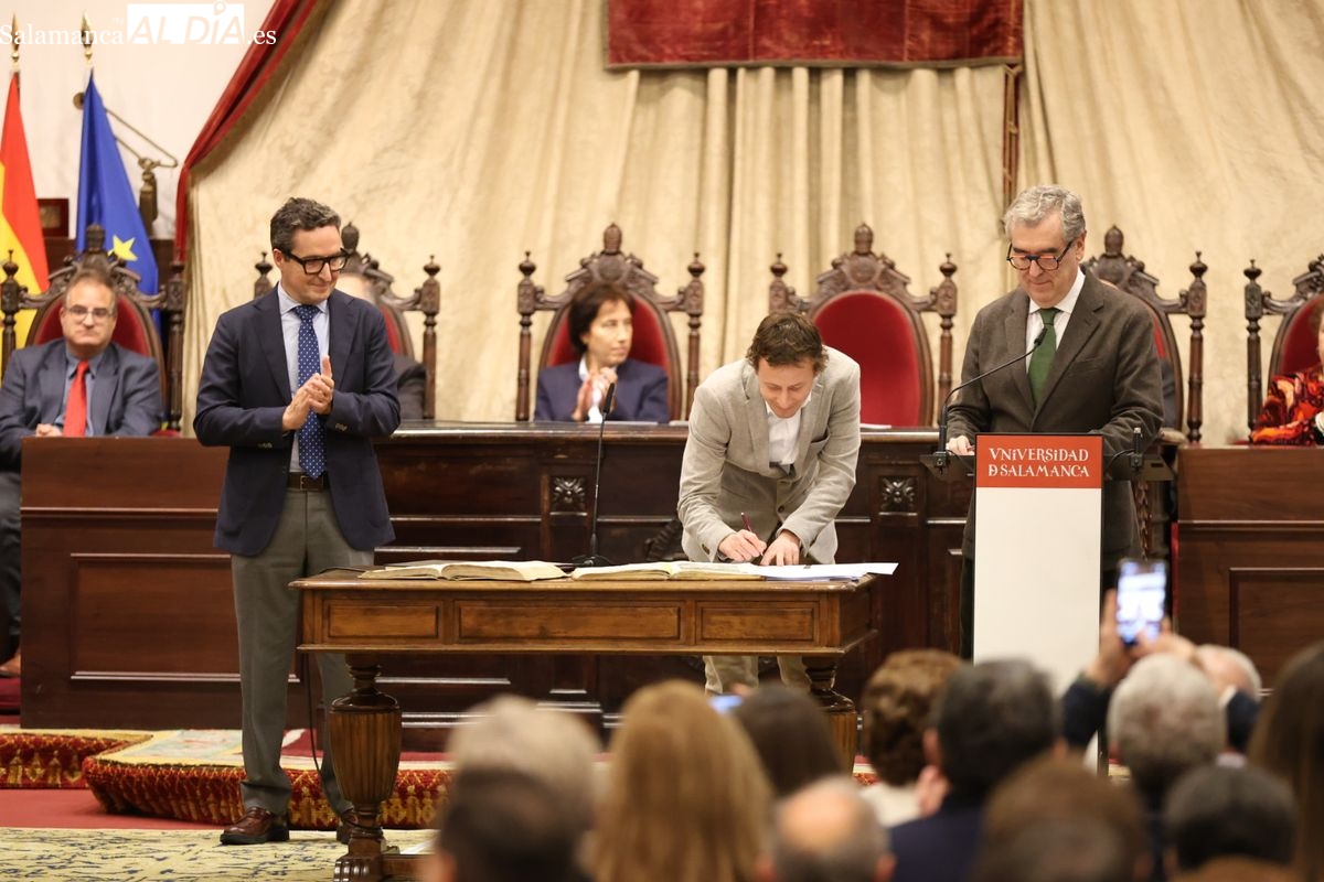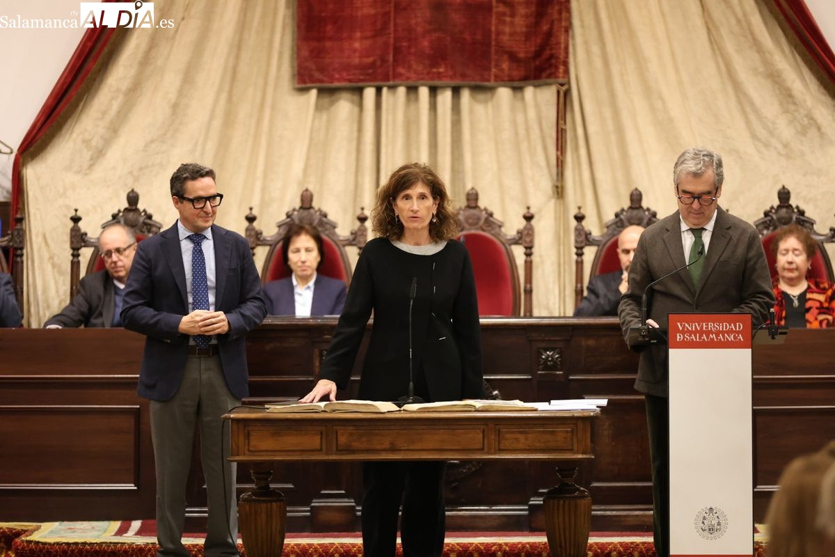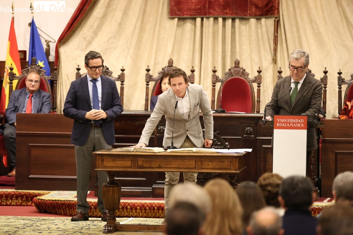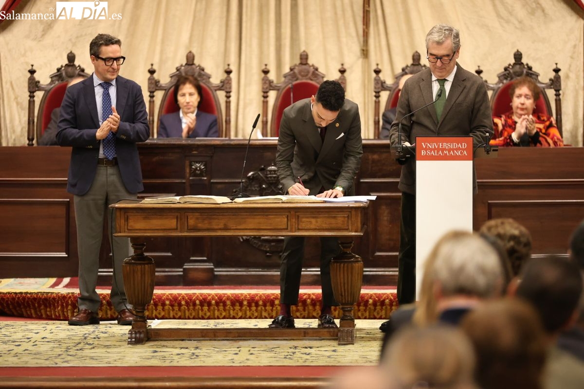 El Paraninfo de la Universidad de Salamanca ha acogido este martes el solemne acto de toma de posesión de un nuevo cargo académico, así como de personal docente e investigador de la institución. La ceremonia, que reafirma el compromiso de la comunidad universitaria con la excelencia académica y la gestión institucional, ha estado encabezada por el máximo responsable de la Universidad, quien ha presidido la sesión protocolaria en el histórico edificio de las Escuelas Mayores.
