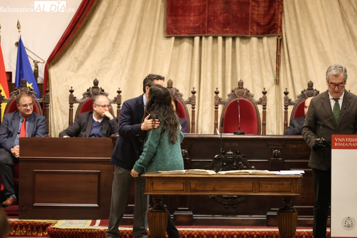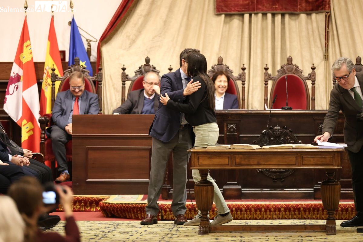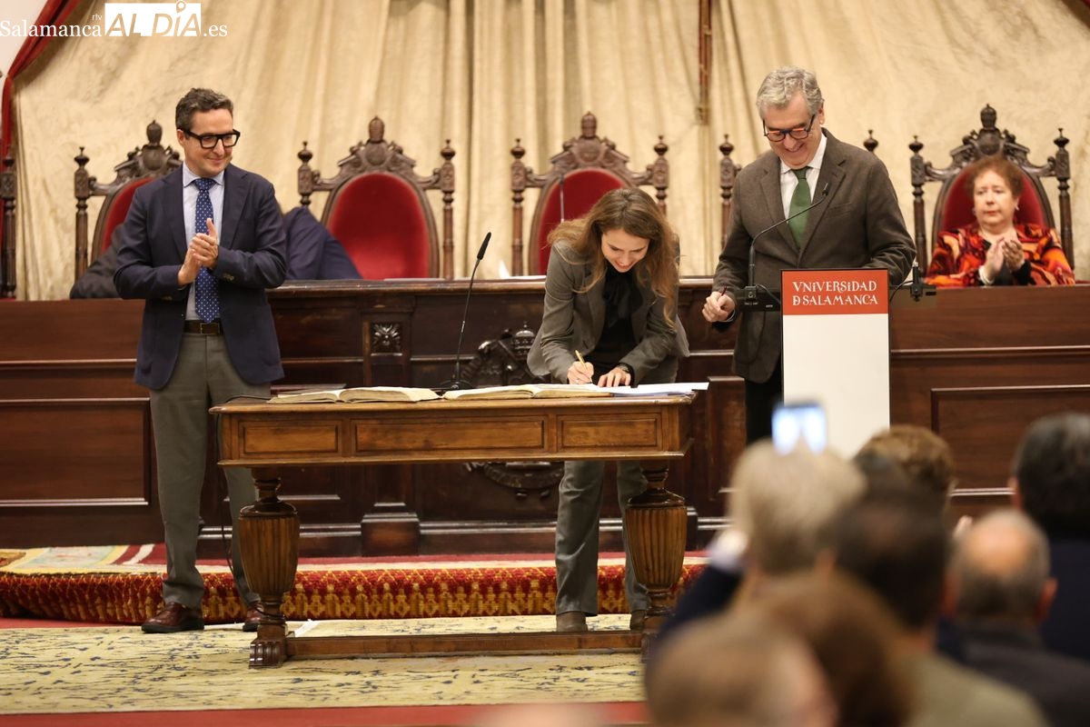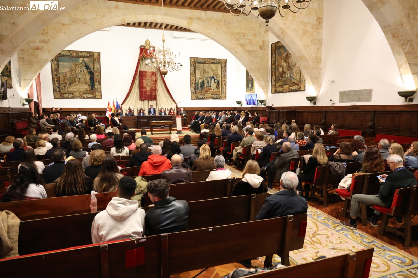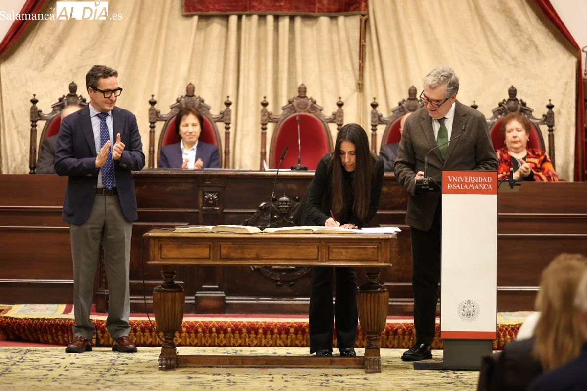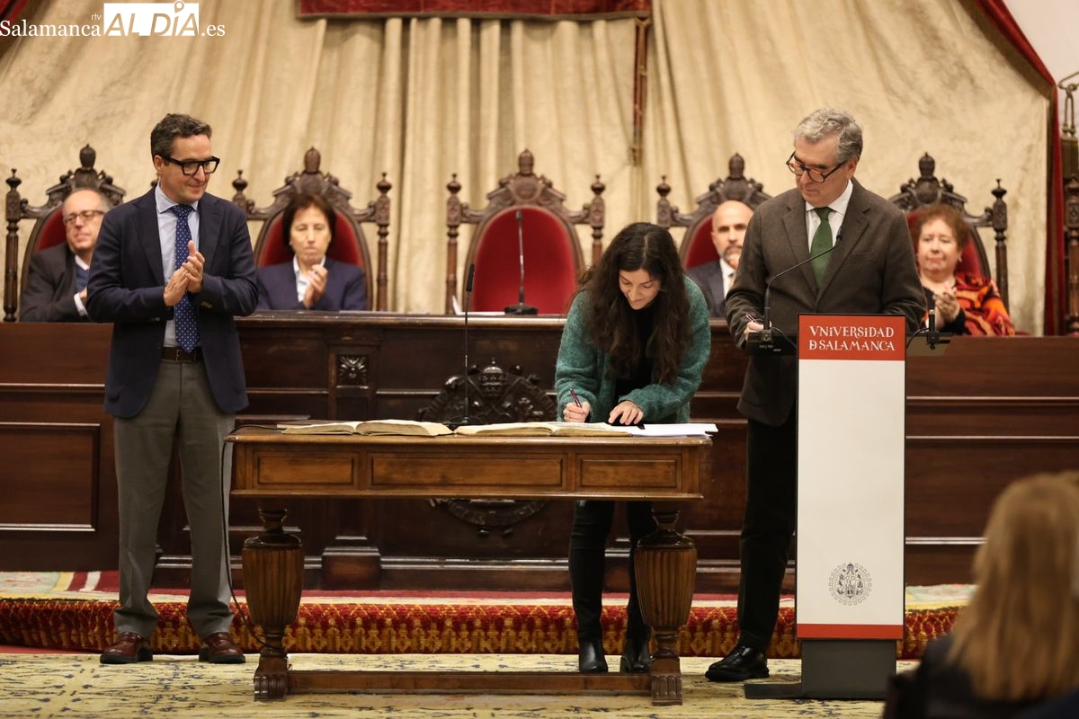El Paraninfo de la Universidad de Salamanca ha acogido este martes el solemne acto de toma de posesión de un nuevo cargo académico, así como de personal docente e investigador de la institución. La ceremonia, que reafirma el compromiso de la comunidad universitaria con la excelencia académica y la gestión institucional, ha estado encabezada por el máximo responsable de la Universidad, quien ha presidido la sesión protocolaria en el histórico edificio de las Escuelas Mayores.