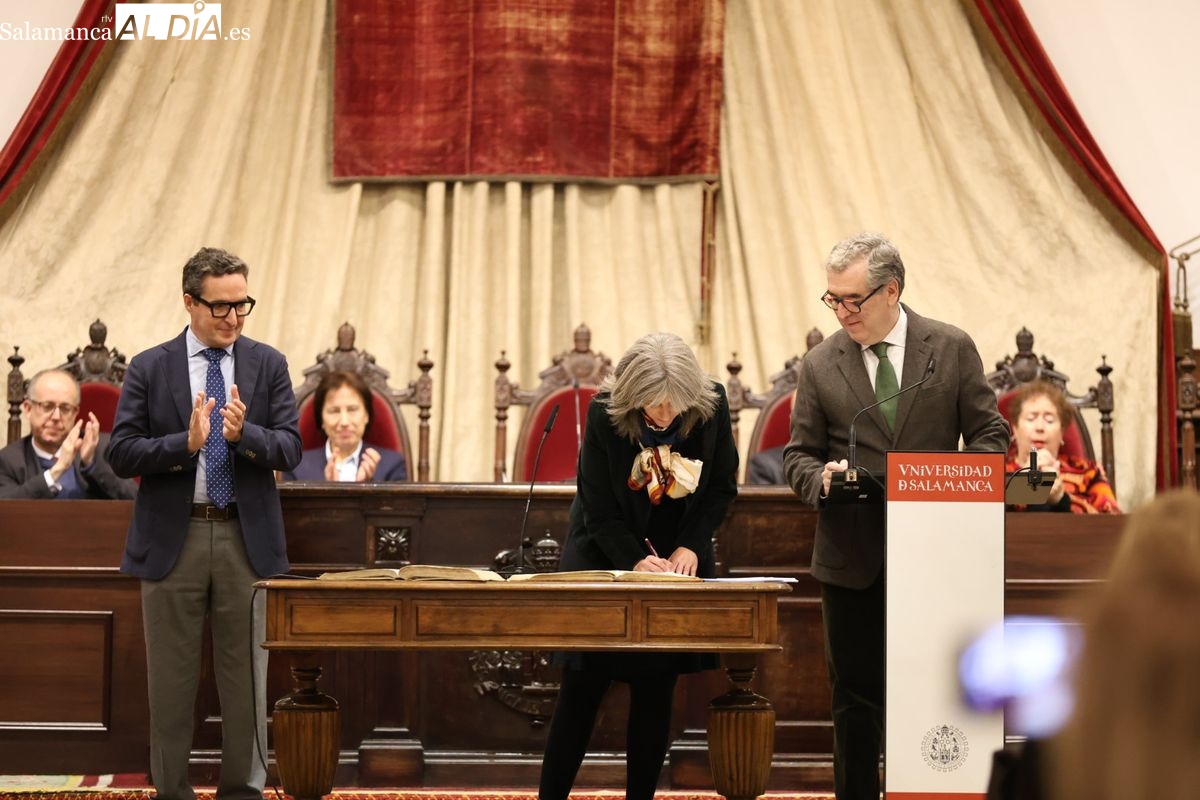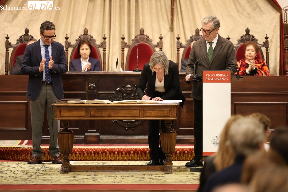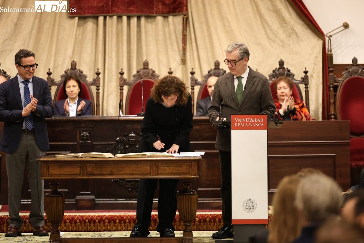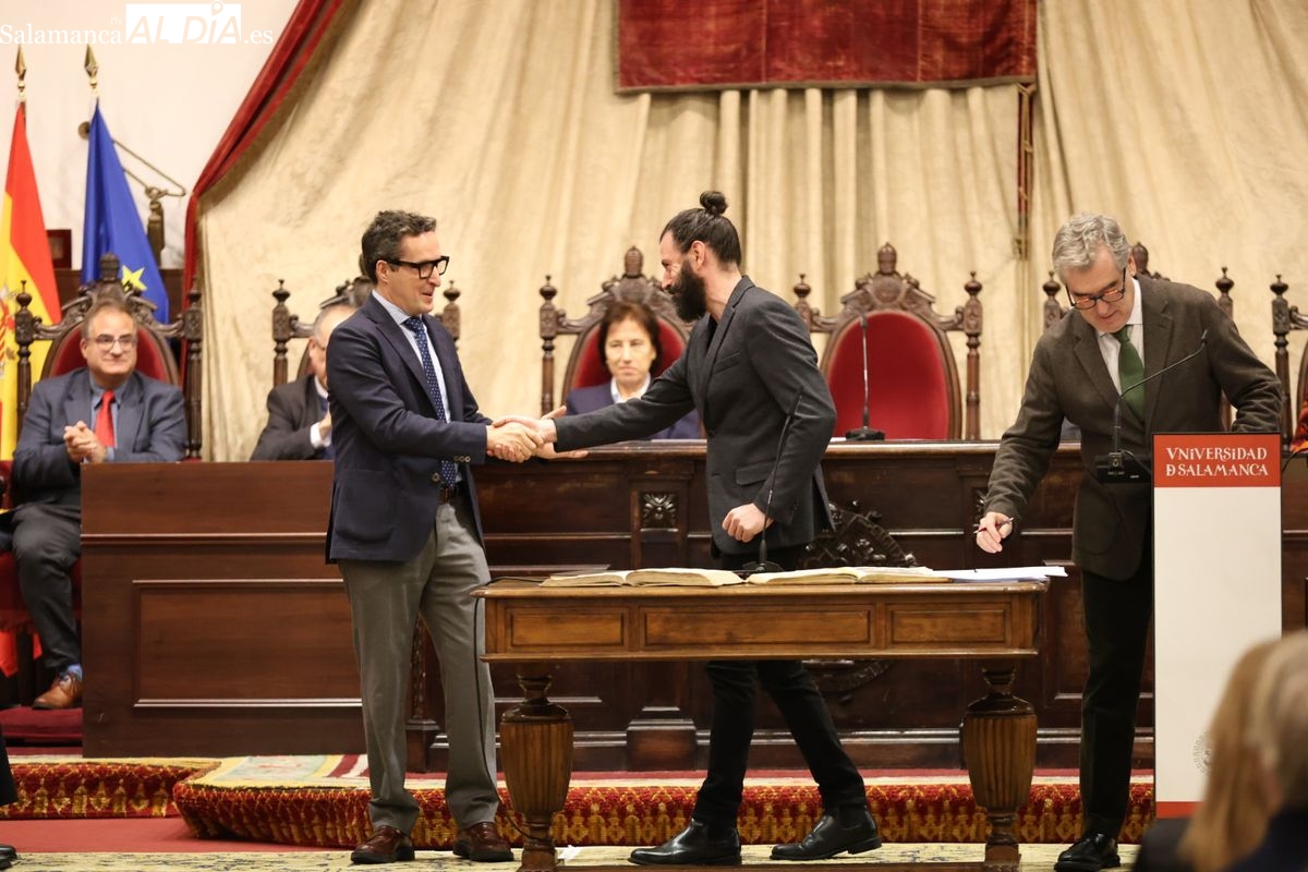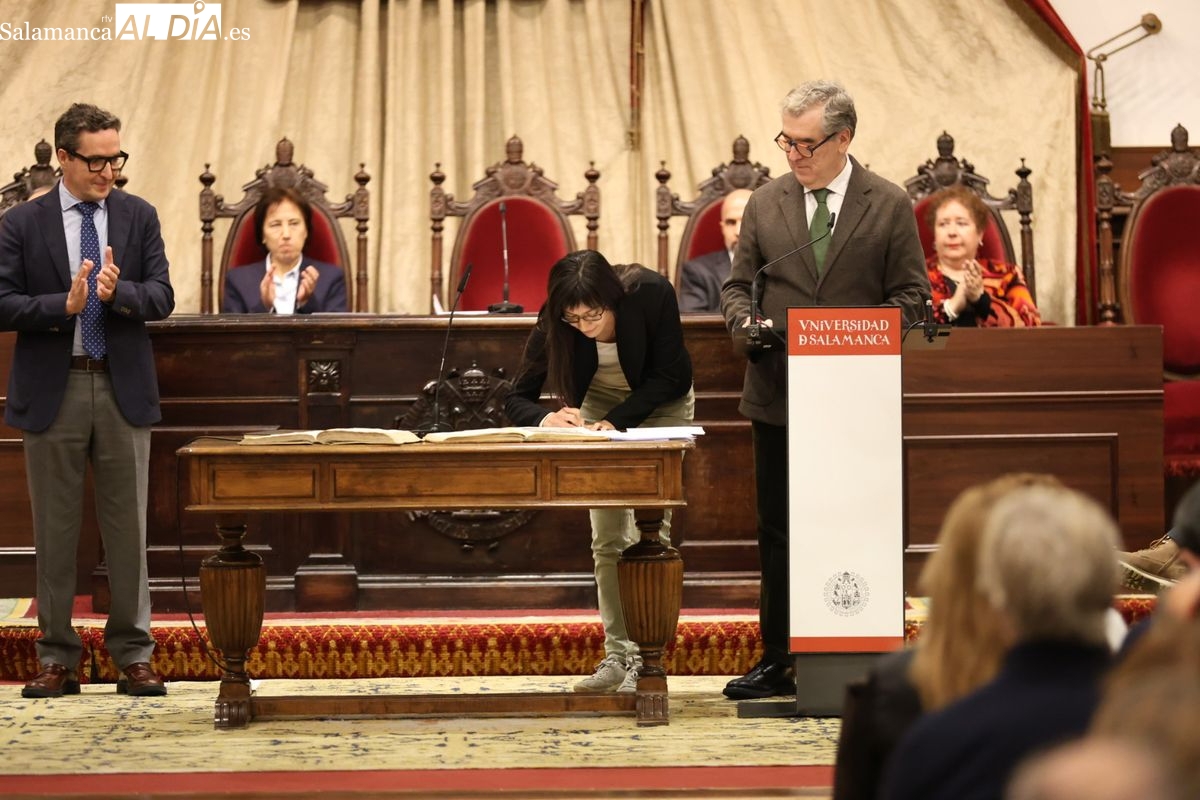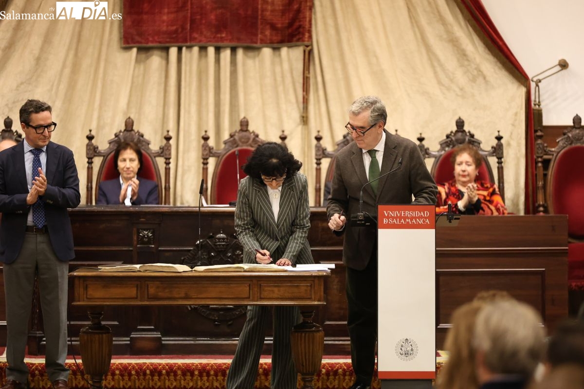 El Paraninfo de la Universidad de Salamanca ha acogido este martes el solemne acto de toma de posesión de un nuevo cargo académico, así como de personal docente e investigador de la institución. La ceremonia, que reafirma el compromiso de la comunidad universitaria con la excelencia académica y la gestión institucional, ha estado encabezada por el máximo responsable de la Universidad, quien ha presidido la sesión protocolaria en el histórico edificio de las Escuelas Mayores.