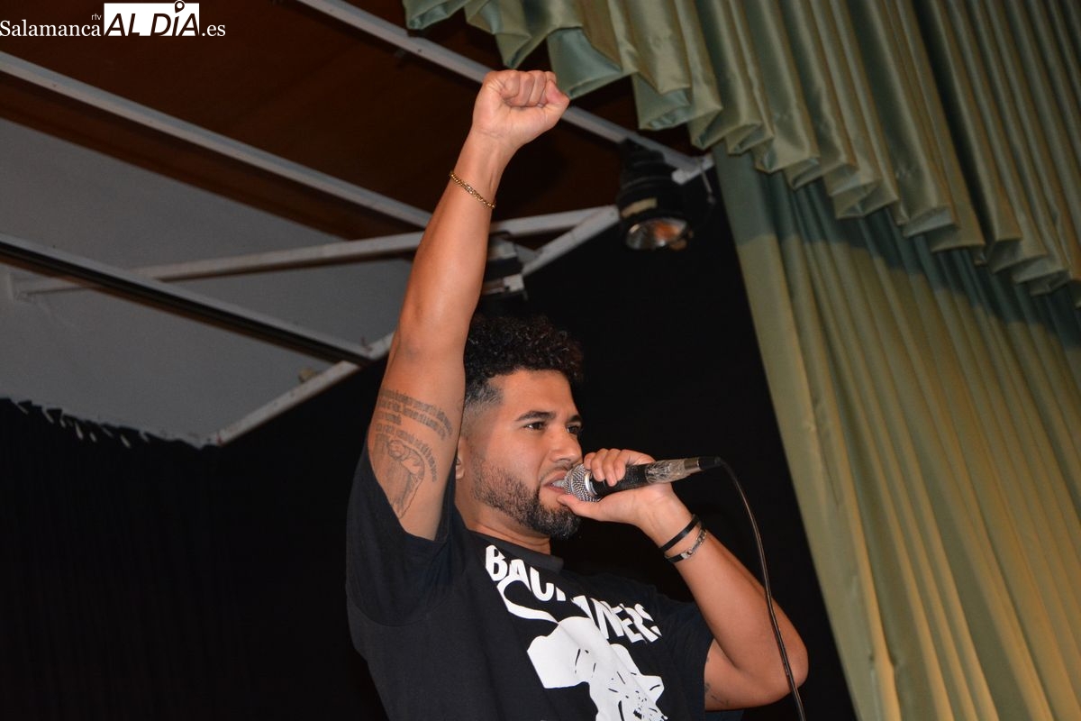 Edwing Vladimir no es un rapero al uso. El suyo es un discurso de empatía, ternura, cercanía, barrio, colectividad, ayuda mutua, entrega. Y poesía. Enamorado de la literatura desde el rap, sus letras hablan de una sensibilidad exquisita que enciende una luz en la noche para agarrar el lápiz, el papel y expresar sus miedos, sus esperanzas, su deseo de vivir otra vida y su valor artístico, que es muy fuerte. Sus letras remiten no solo a la cultura popular de la calle, sino a la poesía, a Celaya con quien comparte el deseo de tomar partido hasta mancharse, a Miguel Hernández. El rap de Edwing está lleno de metáforas, de hallazgos literarios, de vida, y bromea con este público feliz cuando les dice que tienen que ayudarle con un verso particularmente complicado, un alejandrino… y les hace gritar a todos “No, no, no estás invitado, no, no, no estás invitado”. El odio, la violencia, la discriminación, no están invitados a la fiesta a la que nos convida en sus conciertos nuestro rapero.