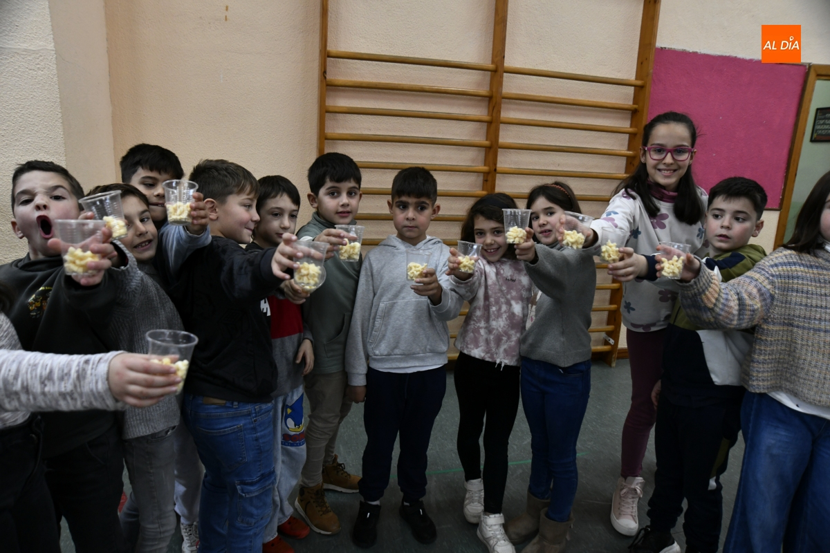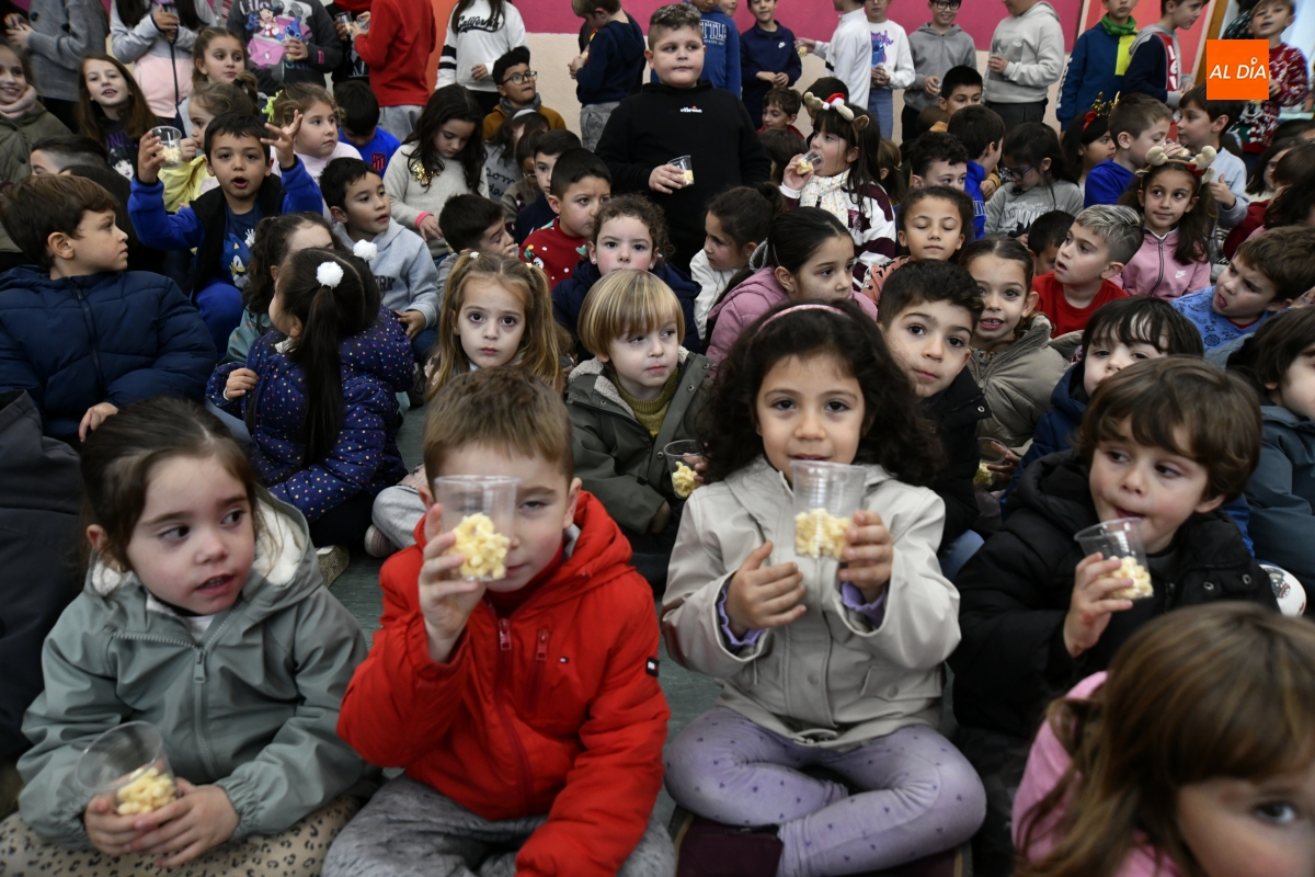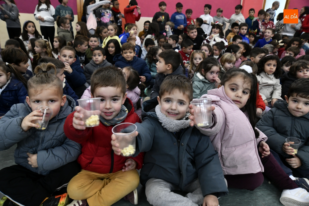 El momento cumbre de la celebración ha llegado con el sonido del reloj. En lugar de las tradicionales uvas de la suerte, los alumnos de Infantil y Primaria han tenido en su poder doce palomitas. Al son de cada campanada, los pequeños han ido comiendo este aperitivo para dar la bienvenida anticipada al año 2026 en un ambiente de compañerismo y diversión.