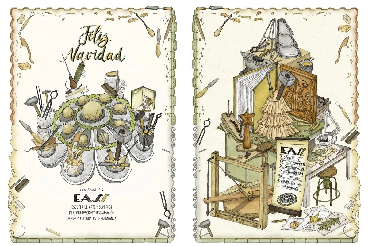 Sin embargo, eso no es todo. Karla también ha homenajeado a Salamanca con este suigéneris botón charro o ese árbol de Navidad que es un canto a la melancolía de estos días, el candor de los oficios de antaño y los sueños de su persistencia a través de las enseñanzas que ofrece esta Escuela, desde la forja artística hasta la conservación y restauración de documento gráfico, pasando por bachillerato artístico, ebanistería, técnicas escultóricas, encuadernación, cerámica o gráfica publicitaria, disciplina en la que se enmarca la creación de esta tarjeta, si bien la ganadora estudia el grado de Conservación y Restauración, la titulación más alta que se ofrece en esta institución académica oficial tan desconocida por muchos, misteriosa para otros y tan importante para la persistencia de nuestra memoria histórica y artística. Así es como la Escuela de Arte y Superior de Salamanca os desea una Feliz Navidad.