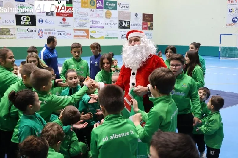 Tras ello, se realiza la foto de familia, con la presencia de todos los equipos, la directiva del club, miembros del Ayuntamiento de Alba de Tormes y representantes de la familia Durán, principal apoyo del club. El acto incluye varias actuaciones deportivas, protagonizadas por los grupos de Baby Sala, Multideporte y Gimnasia Rítmica, que arrancan los aplausos del público presente en las gradas. Una vez finalizadas, y antes de la llegada de Papá Noel, todos los grupos de escuelas participan en un baile conjunto, acompañados por sus monitores, poniendo el broche festivo a la parte central de la presentación. A continuación, hace su entrada Papá Noel, que reparte caramelos tanto a los niños como al público asistente en las gradas.