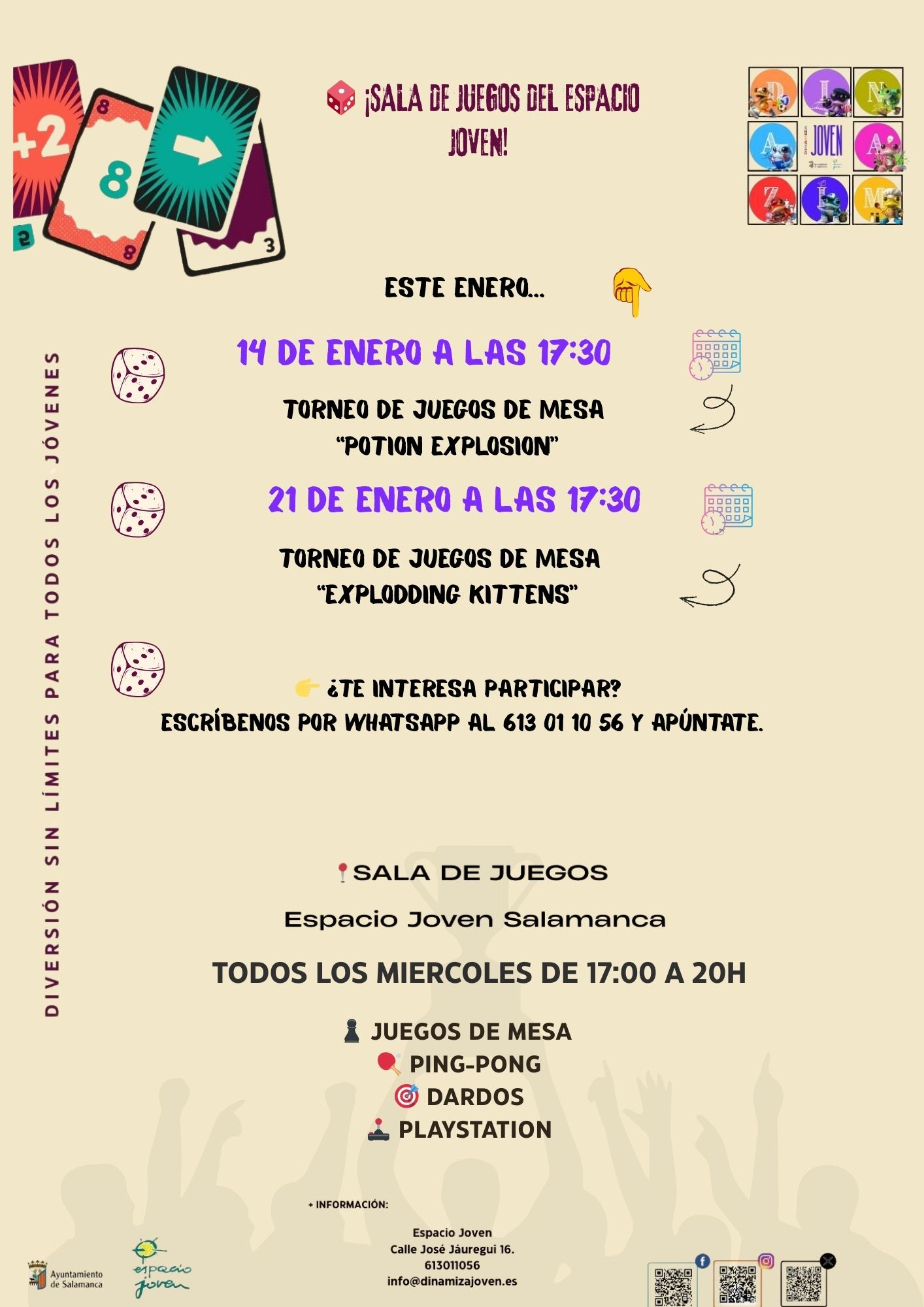 Por otro lado, la sala de juegos estará disponible todos los miércoles en horario de 17:00 a 20:00 horas. Este espacio está equipado con zona de ping-pong, diana de dardos, juegos de mesa y videojuegos. Además, para fomentar la participación, se han organizado torneos de juegos de mesa específicos para los días 14 y 21 de enero.