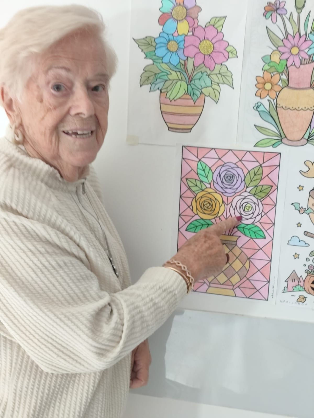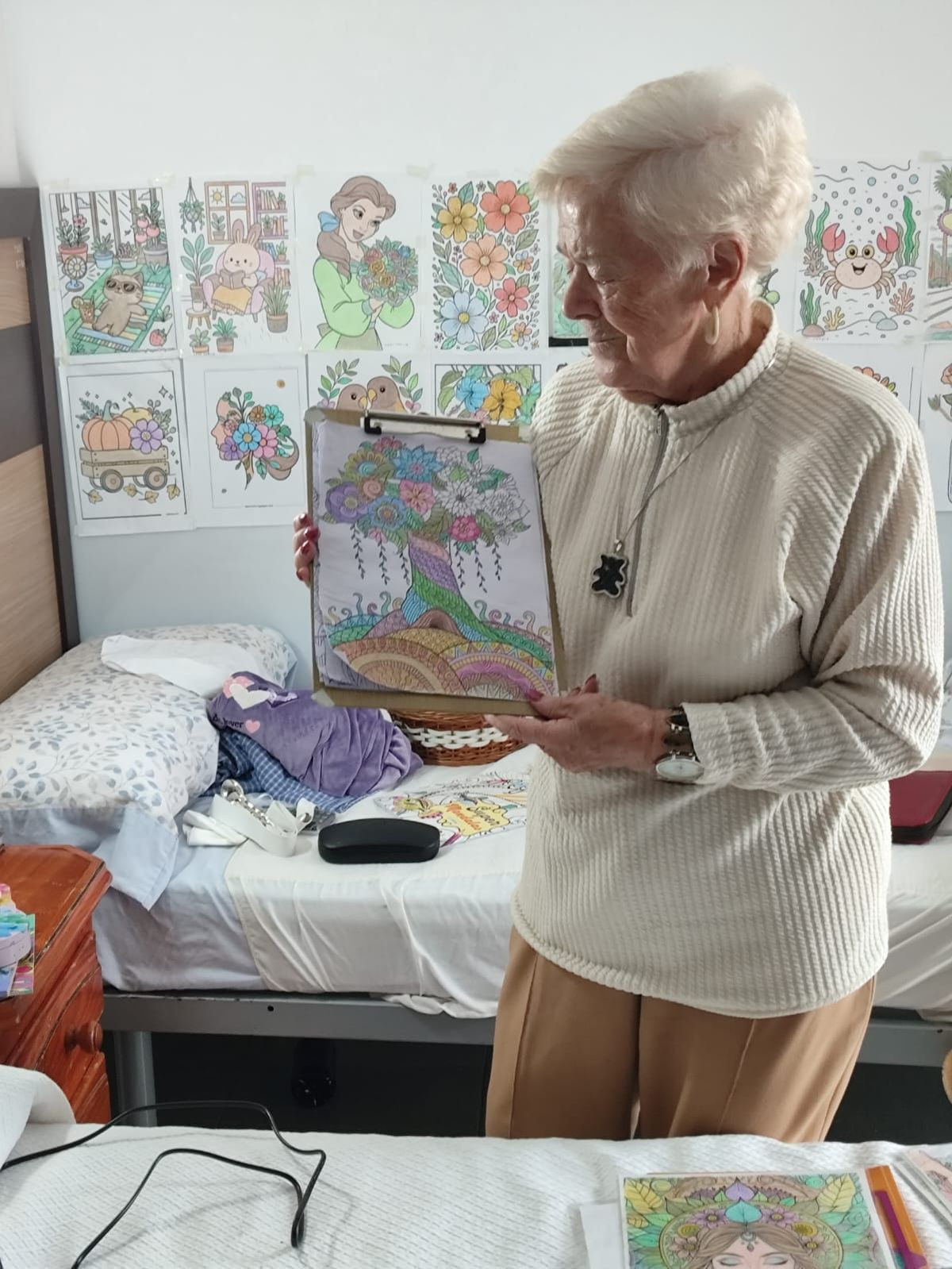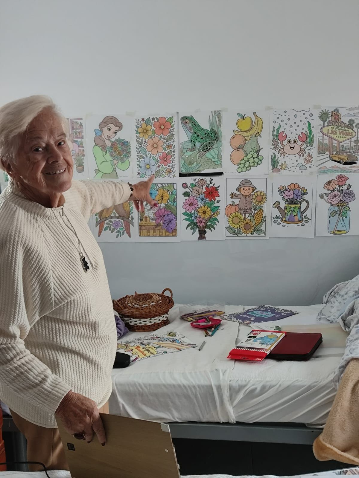 María, con 91 años, colorea su vida en la residencia sin salirse ni un milímetro de una ilusión y pasión por la creatividad y la costura envidiables. Un caso excepcional de temple, calma y filosofía ante la vida.