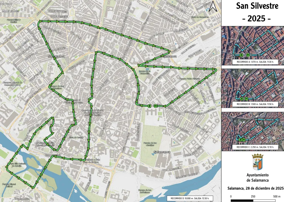 La celebración de la XLI edición de la carrera popular ‘San Silvestre Salmantina’ este domingo, 28 de diciembre, provocará diversas alteraciones en el tráfico rodado de la capital. El Ayuntamiento ha programado un dispositivo especial que incluye cortes y desvíos de circulación al paso de los corredores por los distintos itinerarios de la prueba.