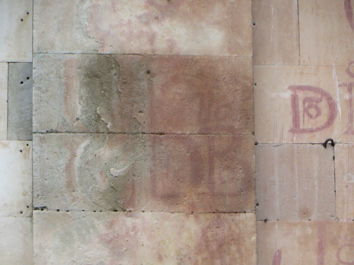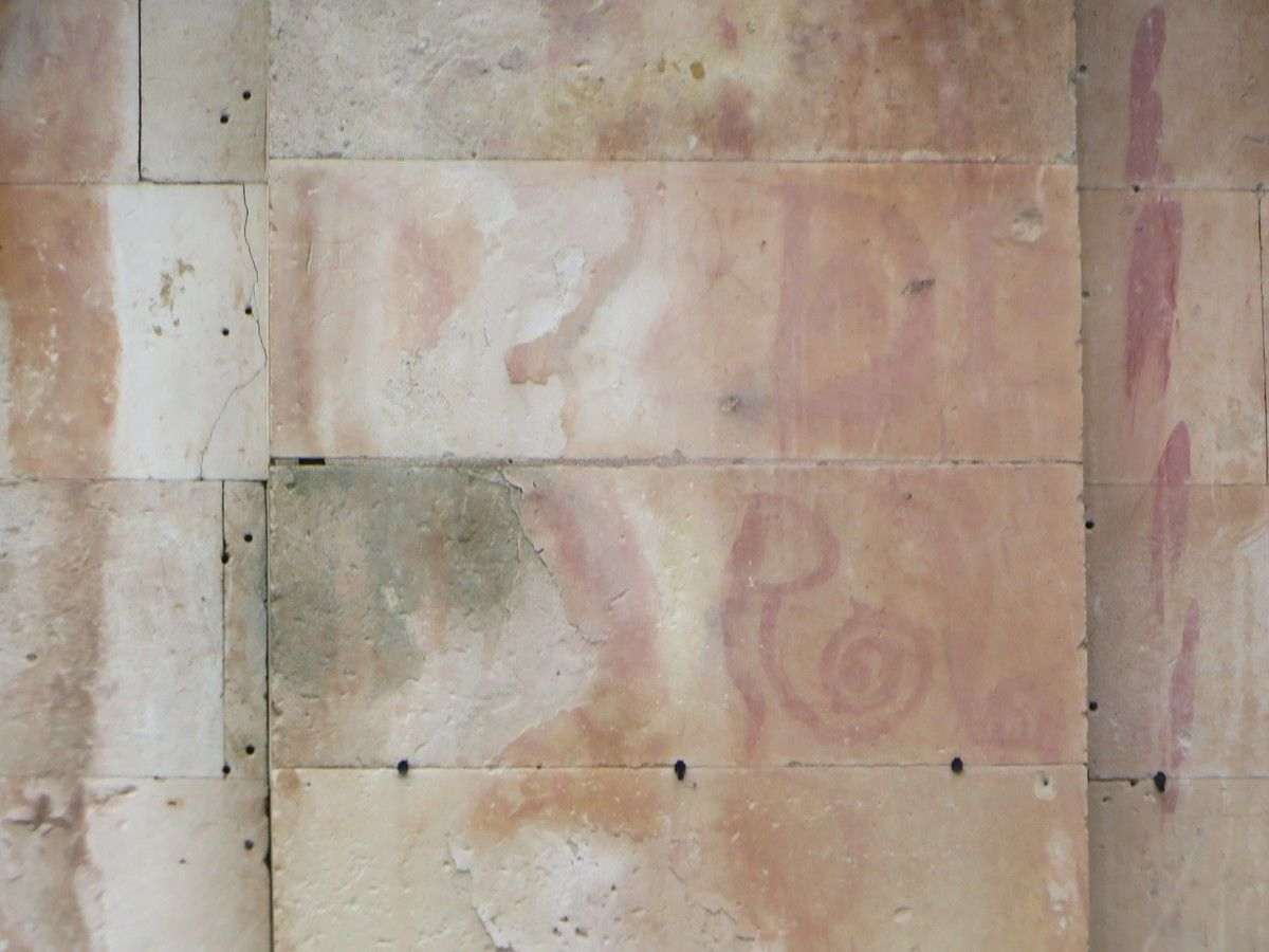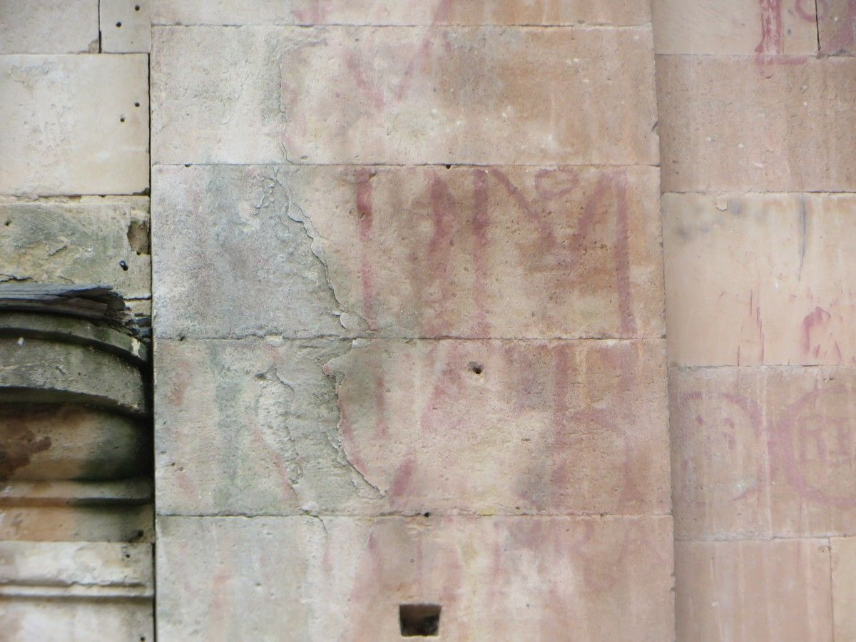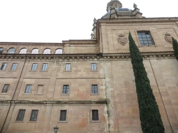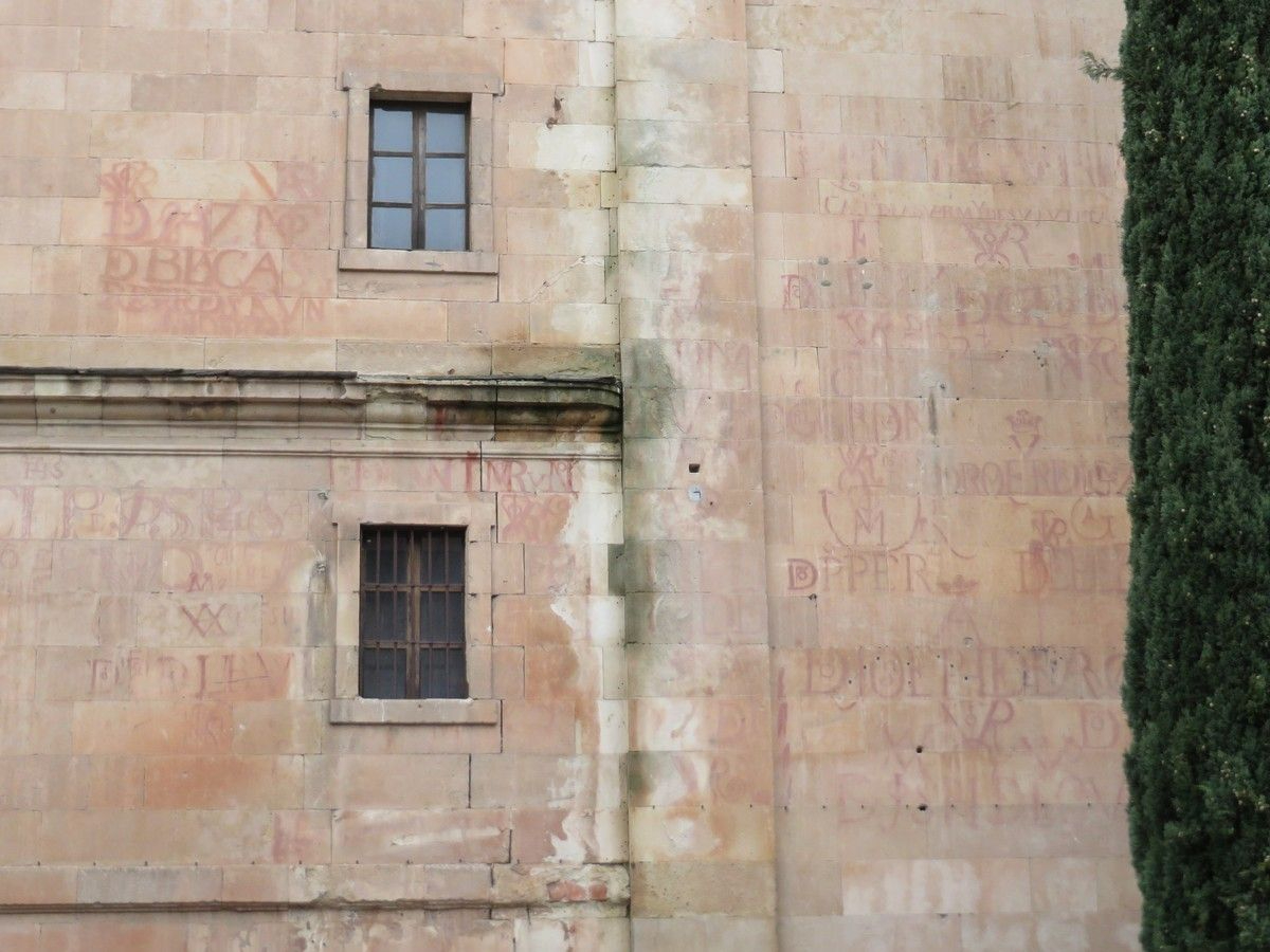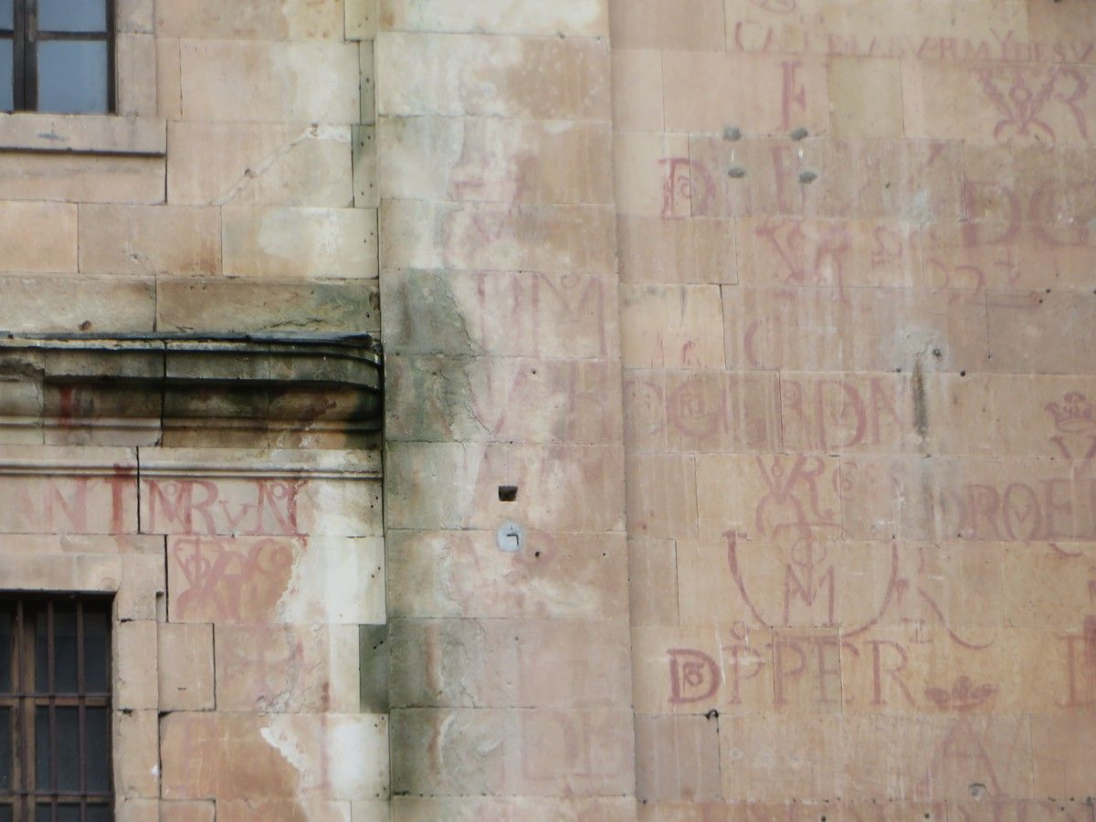 Además de los vítores, el deterioro afecta a una zona de especial relevancia histórica. Se trata del área donde los estudios de Alexandra Mª Gutiérrez Hernández, doctora en Historia del Arte y profesora de la Universidad de Salamanca, han documentado la montea de la cúpula de la propia Iglesia de la Clerecía. Las incisiones de este trazado en la piedra arenisca se están perdiendo en las zonas donde el material se humedece por la acción del agua.
