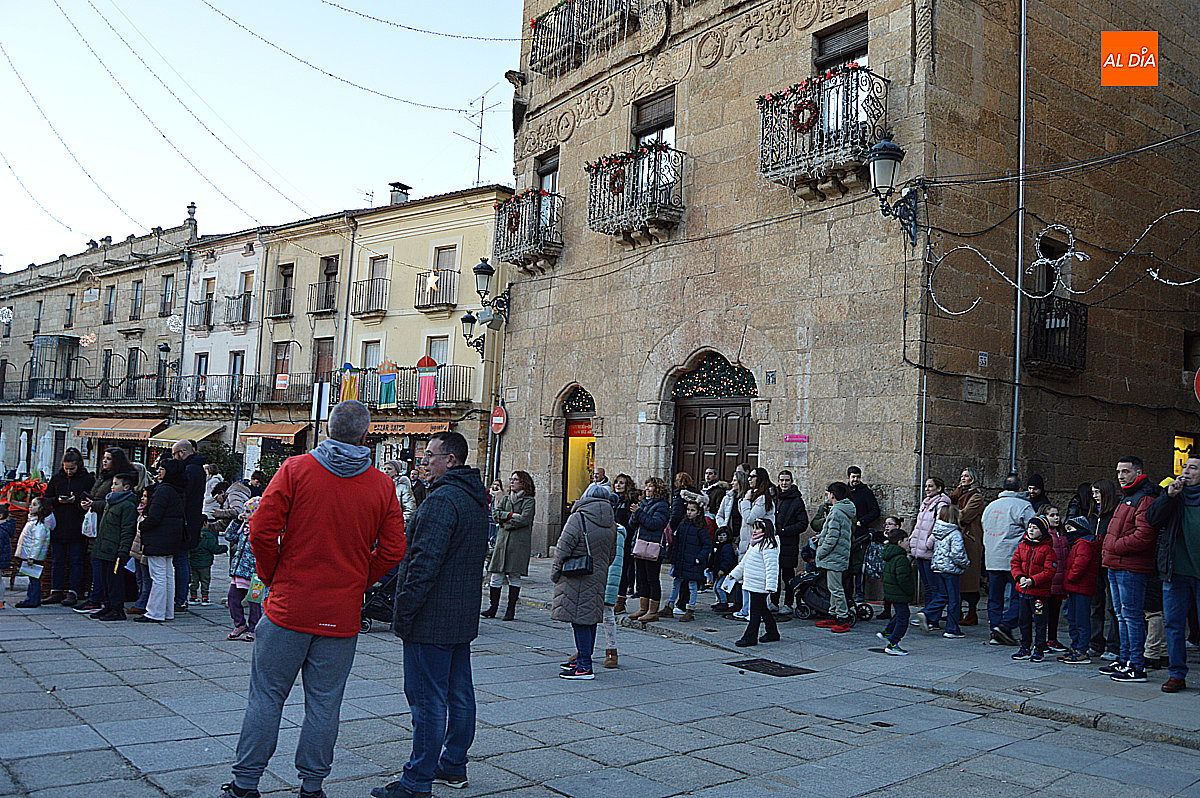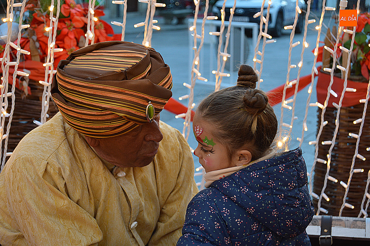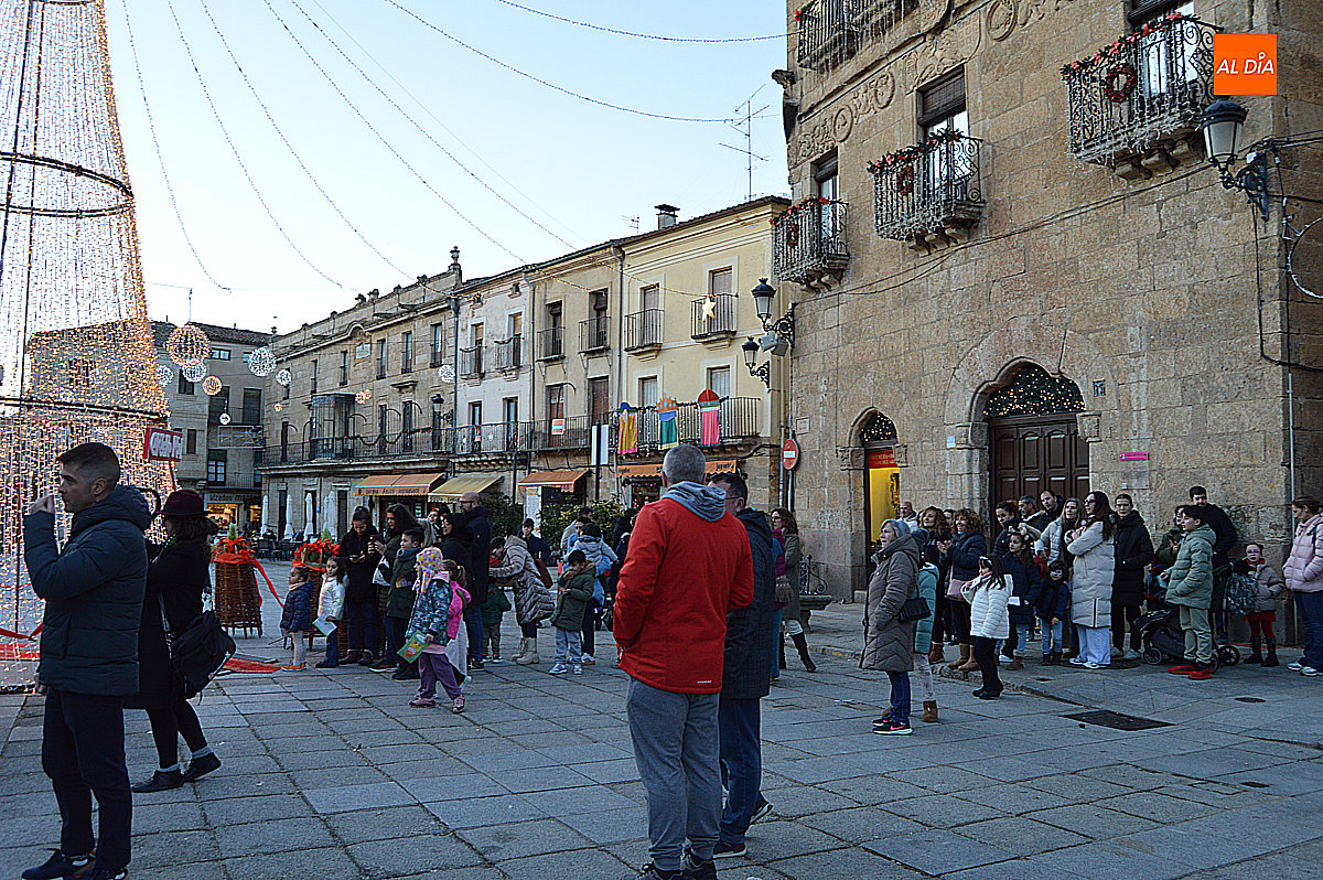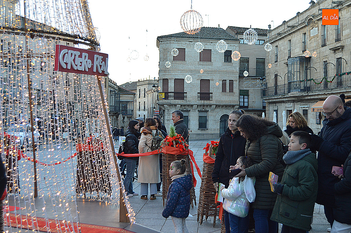 El Cartero Real llegó en una carroza tirada por un coche, desde la que fue saludando y lanzando caramelos a los niños. Una vez en la Plaza Mayor, descendió y se instaló dentro del pino navideño, donde todo estaba preparado para la ocasión para recibir a los pequeños: una silla, un bol con golosinas y un baúl destinado a guardar las cartas.