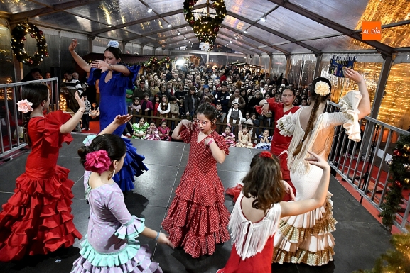 Bajo una imponente carpa instalada en pleno límite entre España y Portugal, a la que se accedía a través de un gran árbol de Navidad, vecinos y visitantes compartieron una tarde marcada por la calidez del ambiente y la diversidad de propuestas. El grupo infantil Taconeos da Raia abrió el programa con una animada exhibición de sevillanas, cuyos ritmos y coreografías conquistaron a los asistentes y prepararon el terreno para uno de los momentos más esperados por los más pequeños: la llegada del Cartero Real, encargado de recoger las cartas dirigidas a Sus Majestades los Reyes Magos.