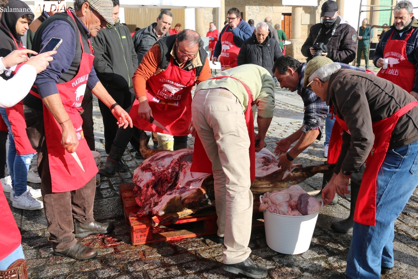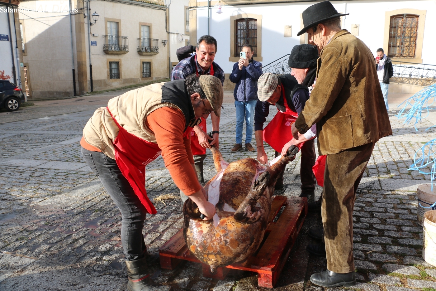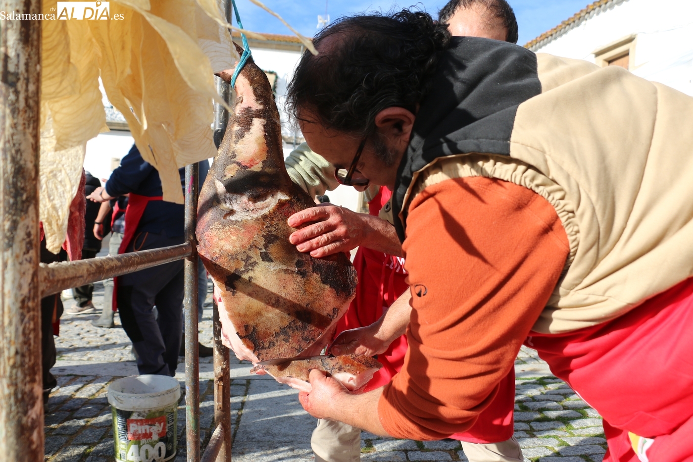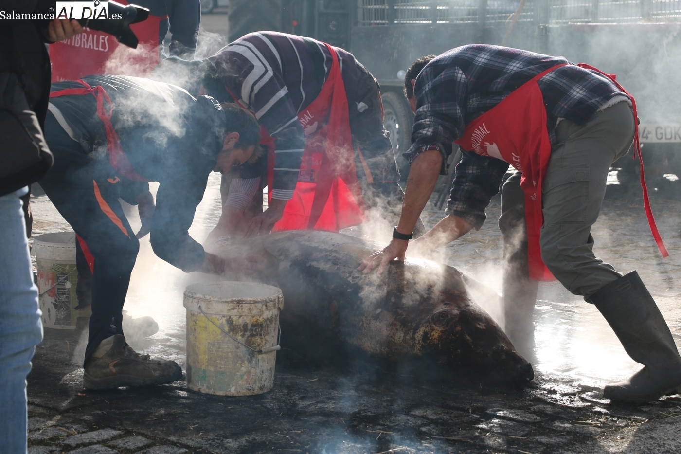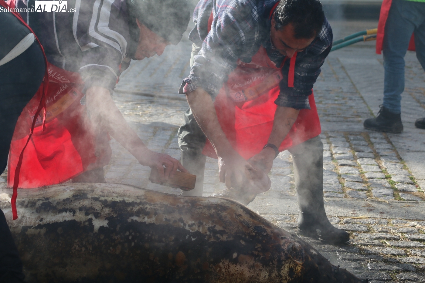 Las labores del sacrificio y despiece han corrido a cargo de los matarifes José Vicente Fregeneda y Manuel Barahona, quienes, junto a su grupo de colaboradores, han ejecutado el ritual siguiendo los cánones de antaño. El proceso ha comenzado con el chamuscado utilizando paja de centeno, seguido del raspado y la limpieza del cuero con agua caliente. Para esta tarea, y como manda la costumbre más arraigada, se han utilizado palas cuadradas, tapas de cazos y rascadores artesanales fabricados con chapas de botellines.