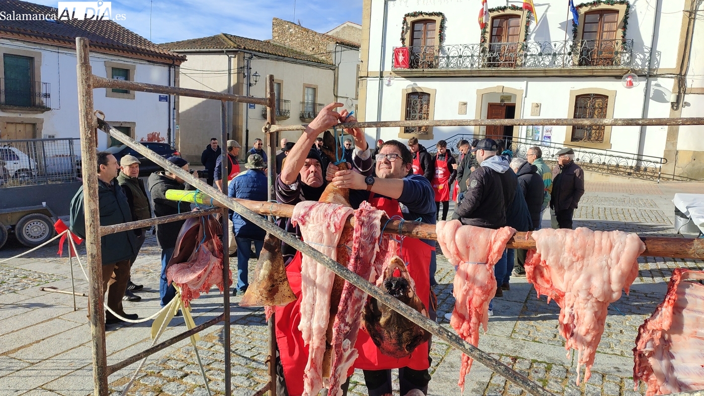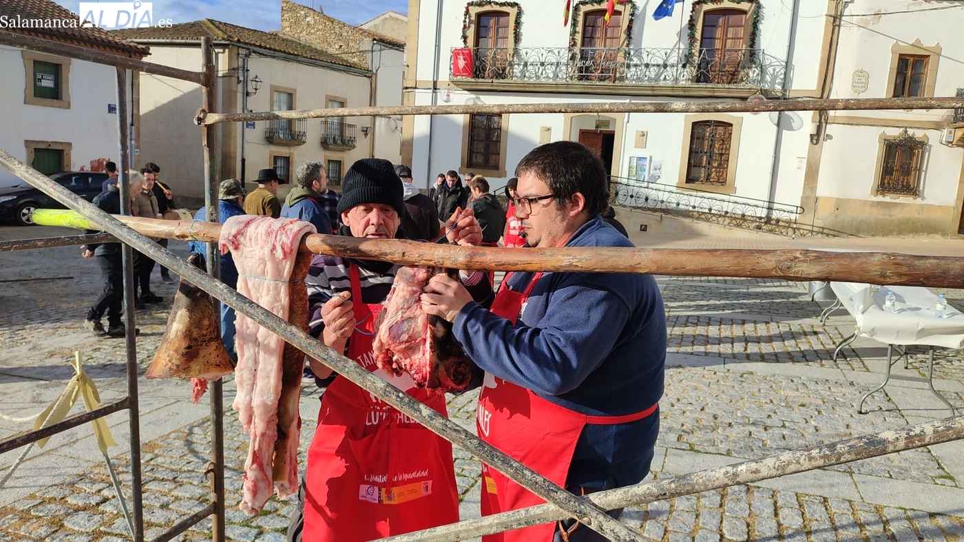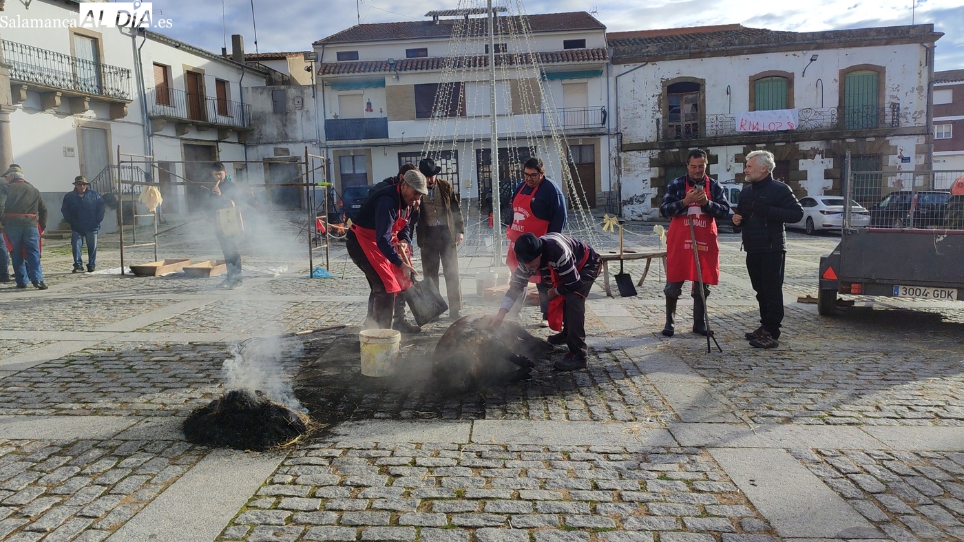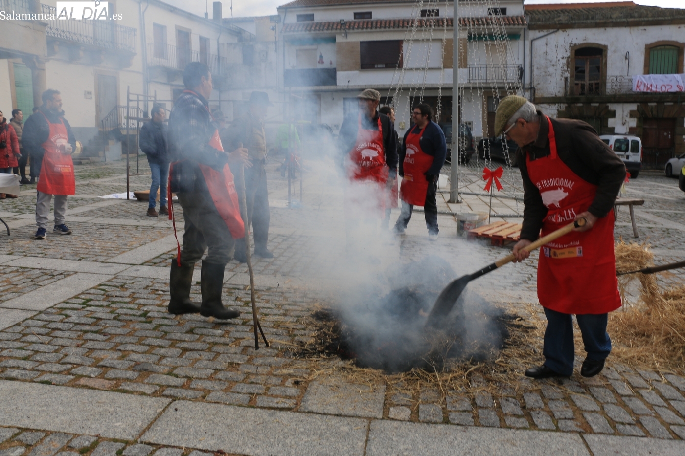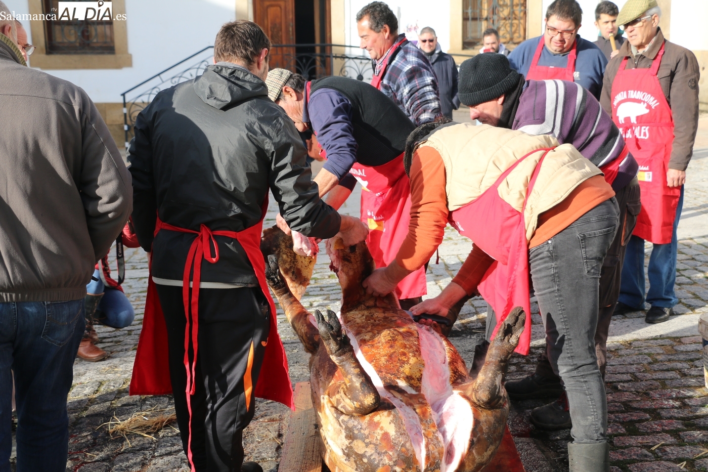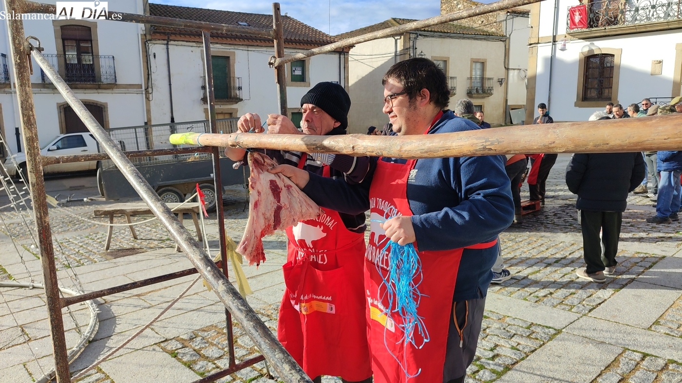 Las labores del sacrificio y despiece han corrido a cargo de los matarifes José Vicente Fregeneda y Manuel Barahona, quienes, junto a su grupo de colaboradores, han ejecutado el ritual siguiendo los cánones de antaño. El proceso ha comenzado con el chamuscado utilizando paja de centeno, seguido del raspado y la limpieza del cuero con agua caliente. Para esta tarea, y como manda la costumbre más arraigada, se han utilizado palas cuadradas, tapas de cazos y rascadores artesanales fabricados con chapas de botellines.