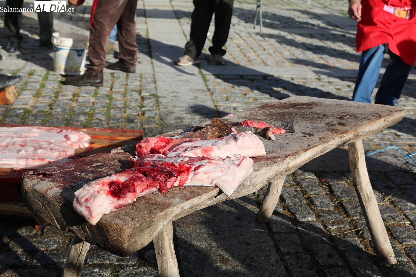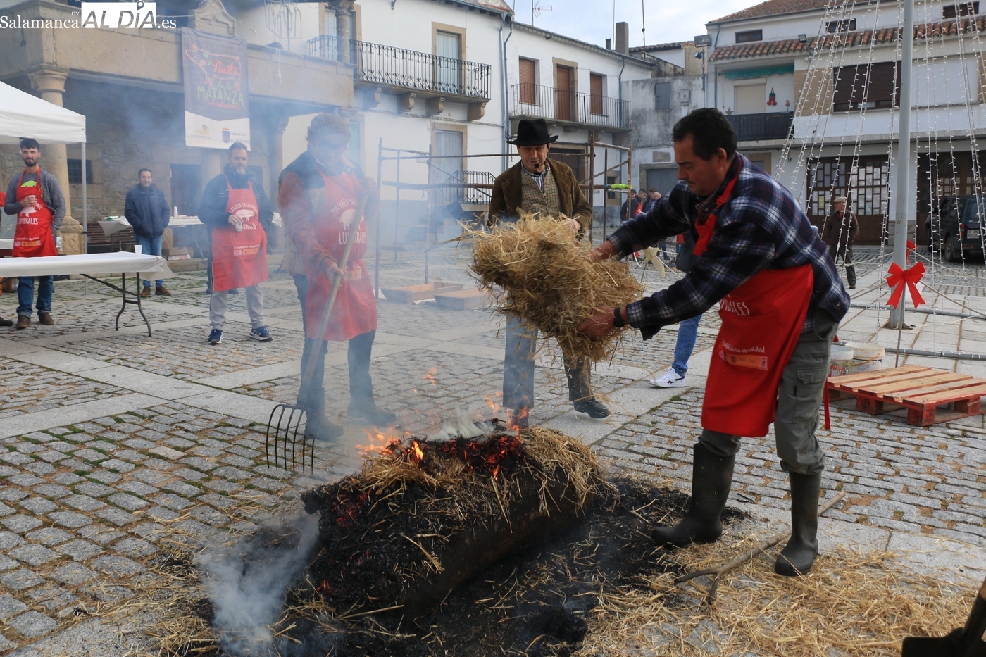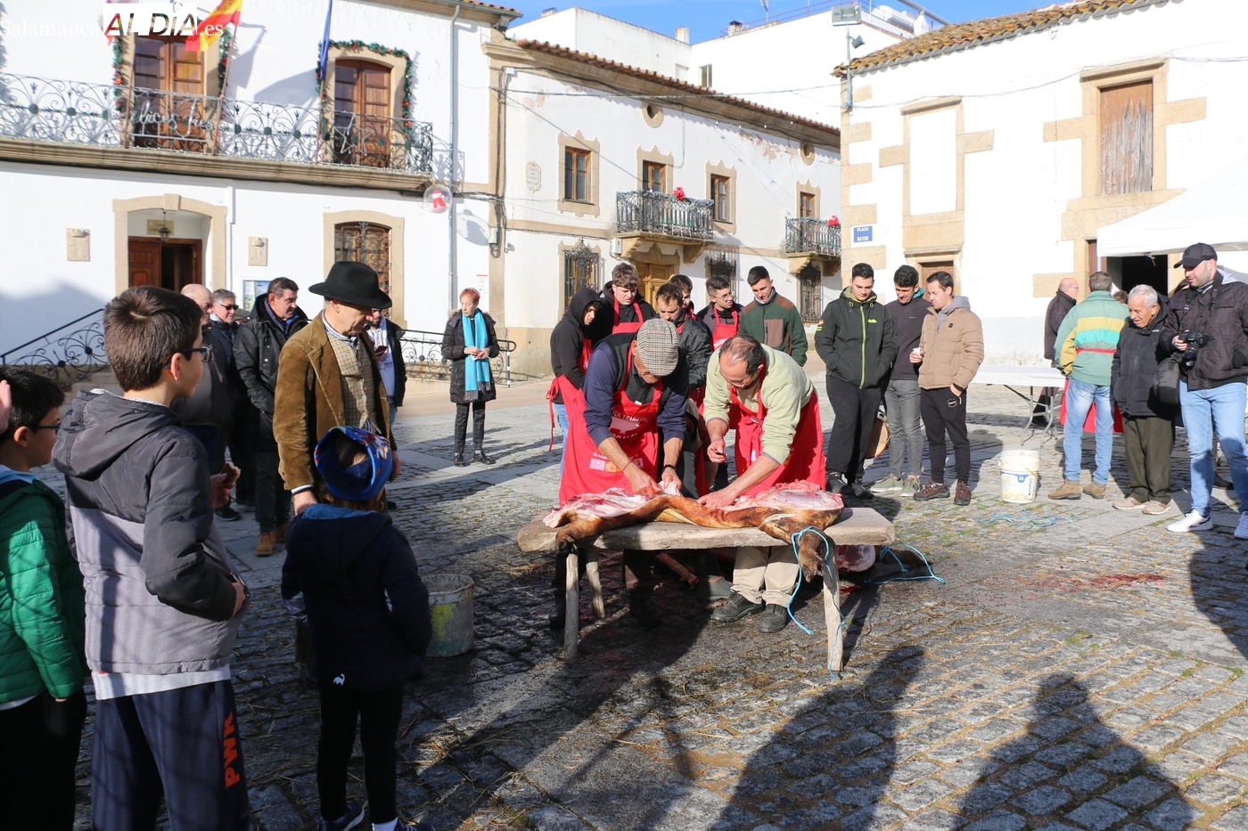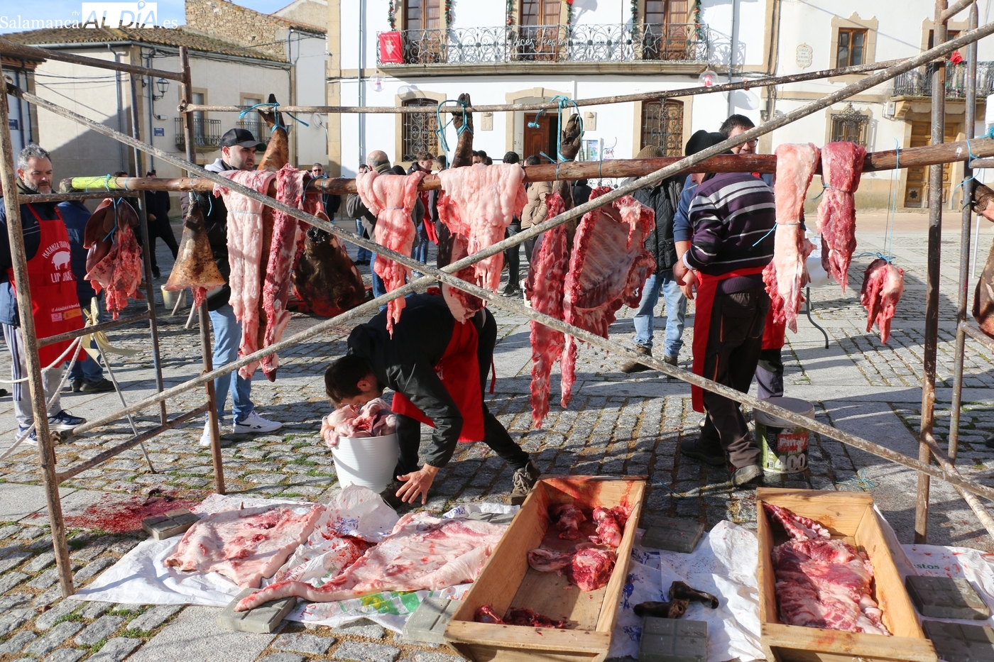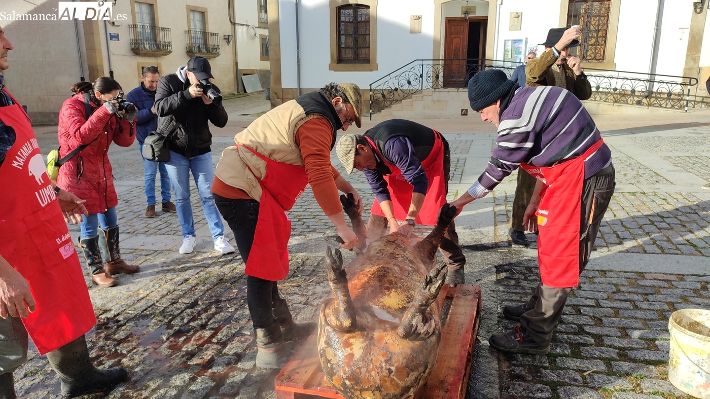 Las labores del sacrificio y despiece han corrido a cargo de los matarifes José Vicente Fregeneda y Manuel Barahona, quienes, junto a su grupo de colaboradores, han ejecutado el ritual siguiendo los cánones de antaño. El proceso ha comenzado con el chamuscado utilizando paja de centeno, seguido del raspado y la limpieza del cuero con agua caliente. Para esta tarea, y como manda la costumbre más arraigada, se han utilizado palas cuadradas, tapas de cazos y rascadores artesanales fabricados con chapas de botellines.