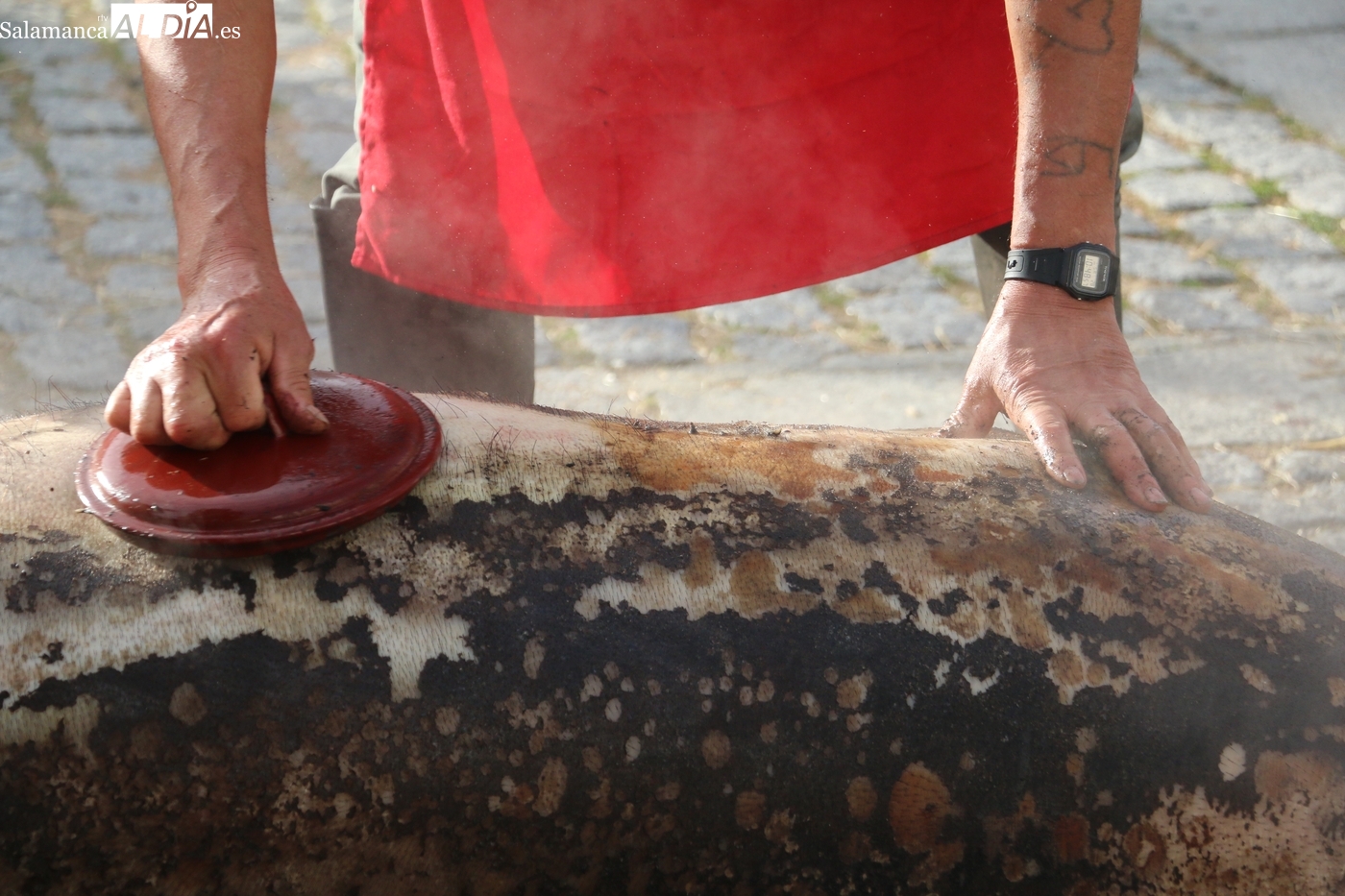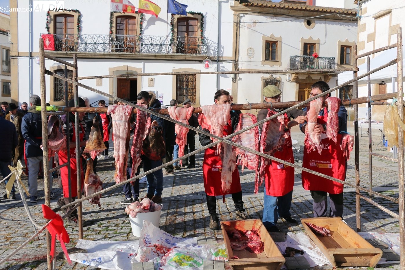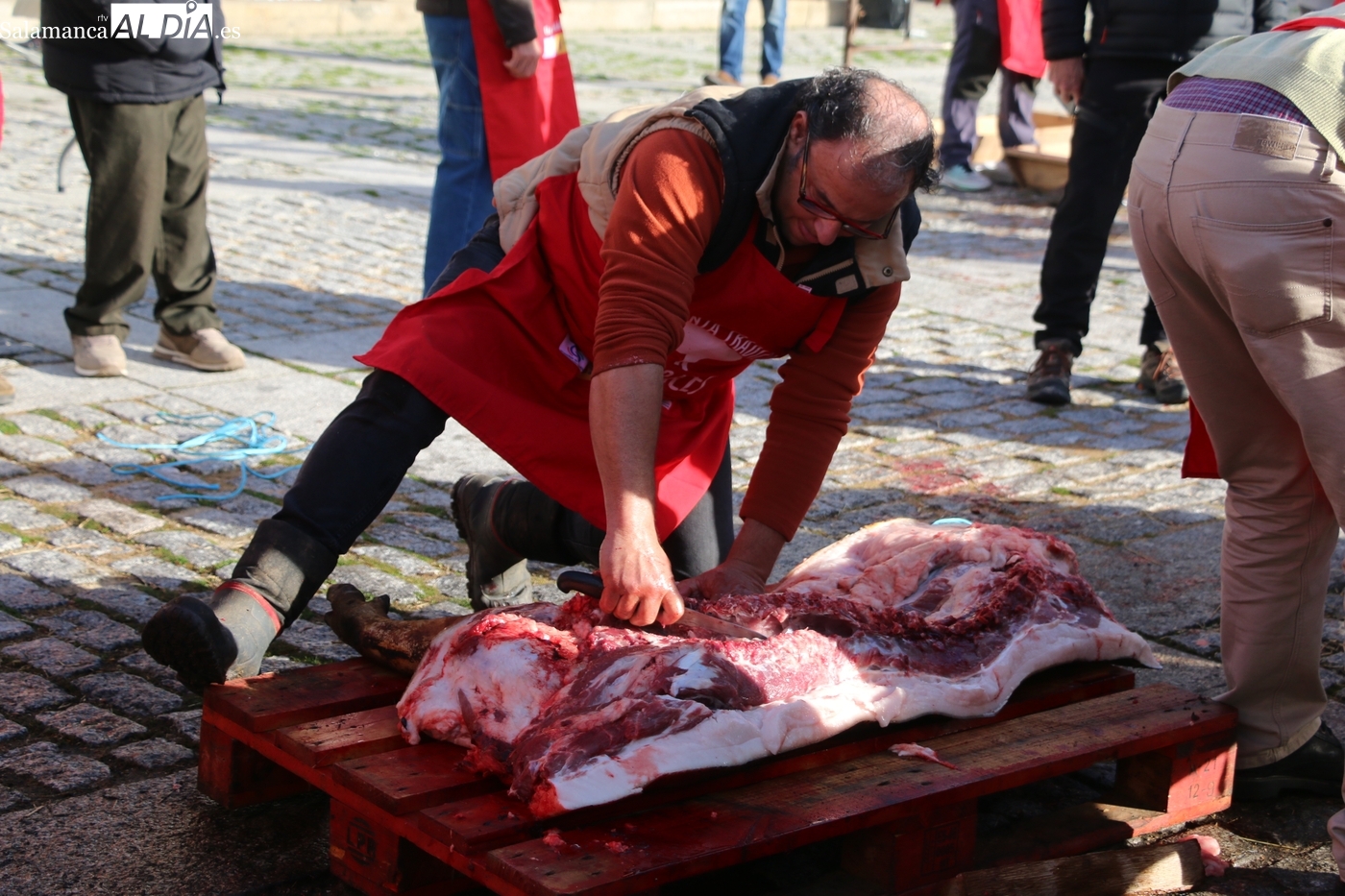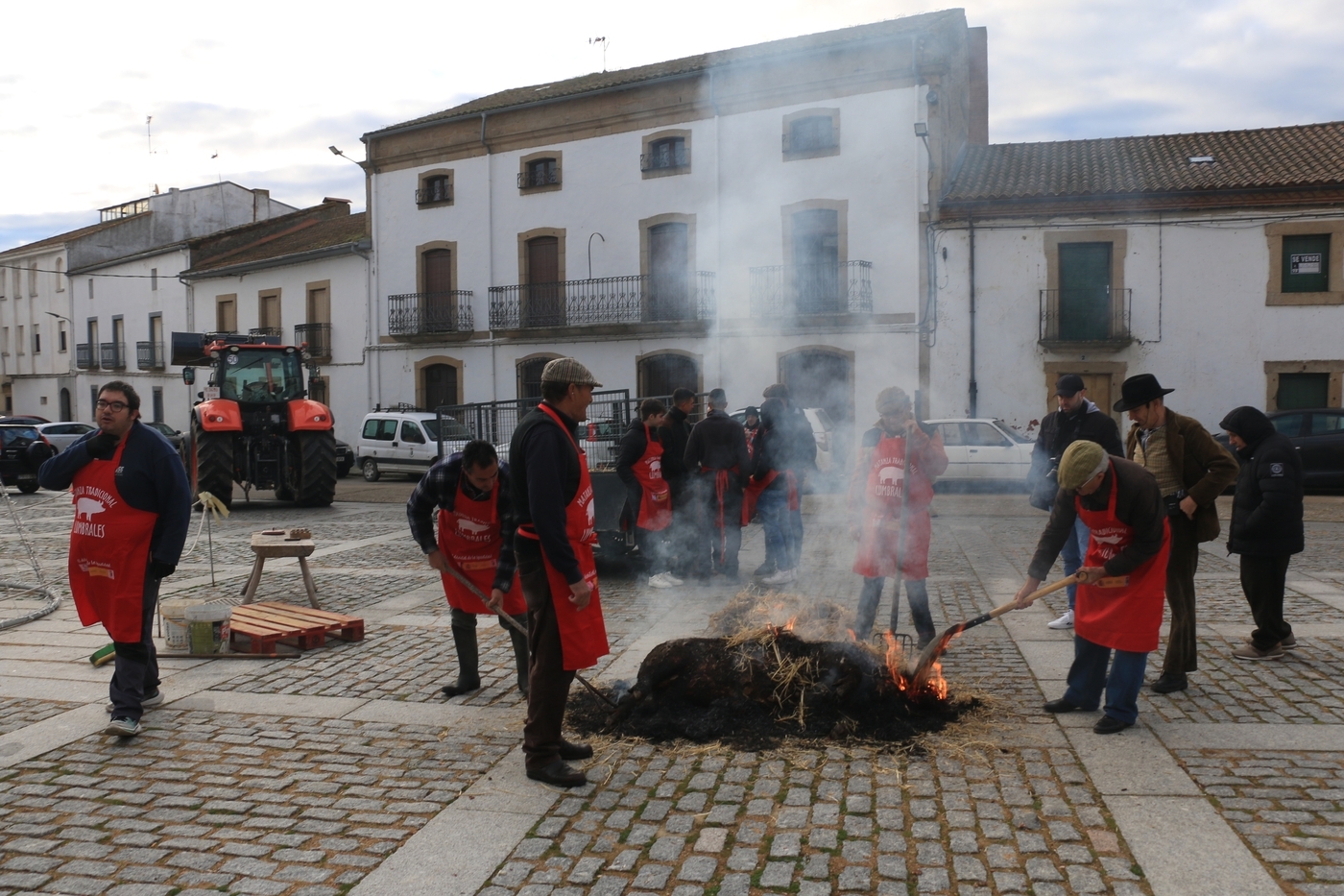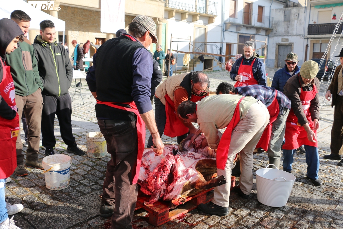 Las labores del sacrificio y despiece han corrido a cargo de los matarifes José Vicente Fregeneda y Manuel Barahona, quienes, junto a su grupo de colaboradores, han ejecutado el ritual siguiendo los cánones de antaño. El proceso ha comenzado con el chamuscado utilizando paja de centeno, seguido del raspado y la limpieza del cuero con agua caliente. Para esta tarea, y como manda la costumbre más arraigada, se han utilizado palas cuadradas, tapas de cazos y rascadores artesanales fabricados con chapas de botellines.