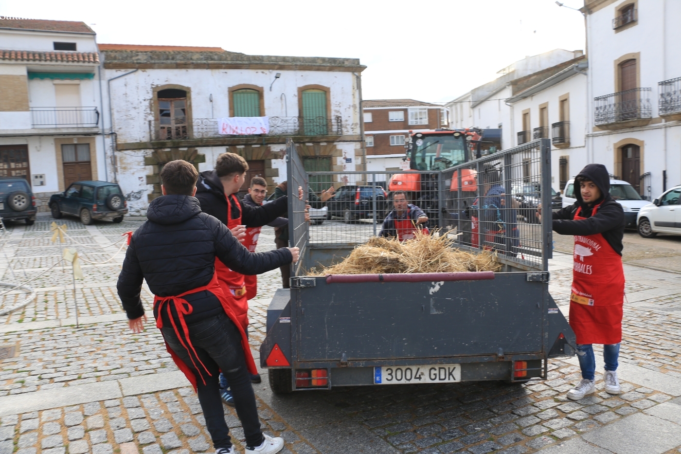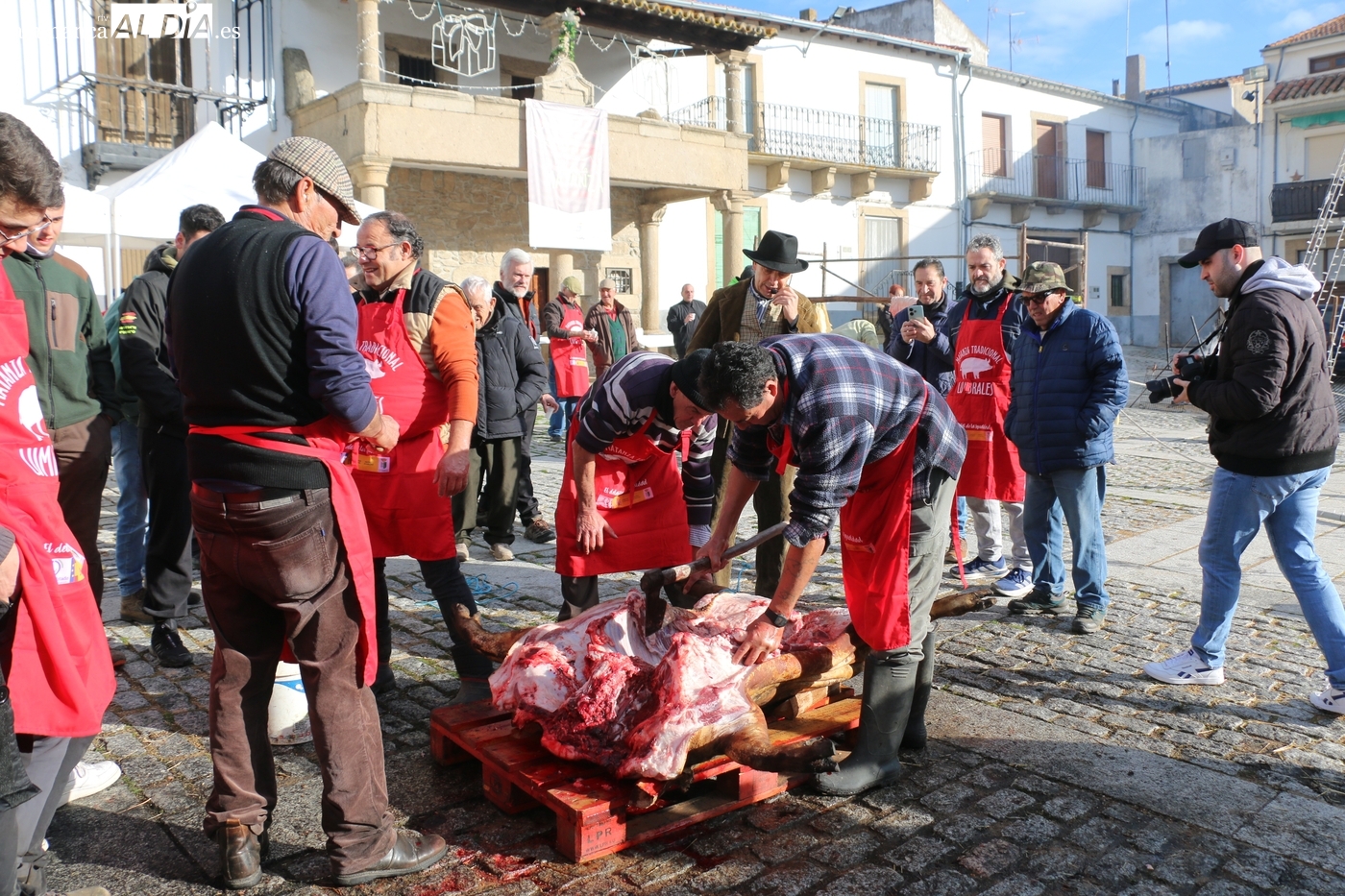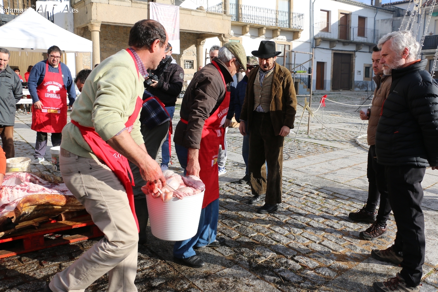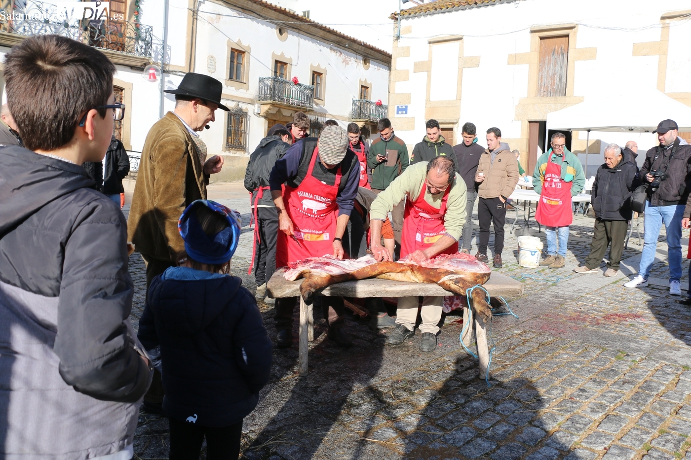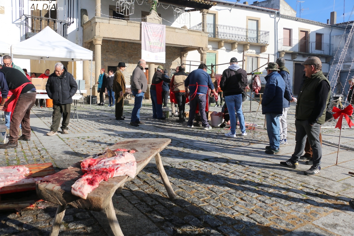 Las labores del sacrificio y despiece han corrido a cargo de los matarifes José Vicente Fregeneda y Manuel Barahona, quienes, junto a su grupo de colaboradores, han ejecutado el ritual siguiendo los cánones de antaño. El proceso ha comenzado con el chamuscado utilizando paja de centeno, seguido del raspado y la limpieza del cuero con agua caliente. Para esta tarea, y como manda la costumbre más arraigada, se han utilizado palas cuadradas, tapas de cazos y rascadores artesanales fabricados con chapas de botellines.