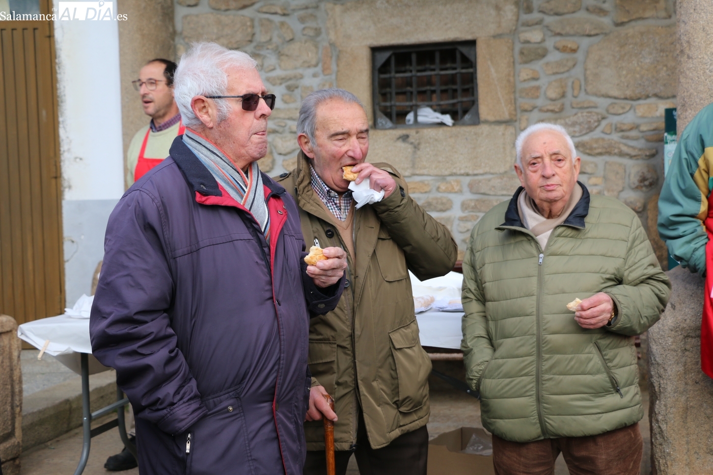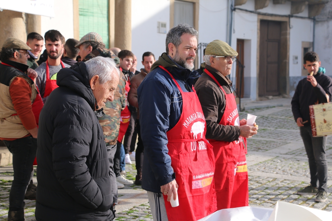 Los actos han arrancado puntuales a las 10:00 horas con el convite del desayuno típico, compuesto por perrunillas y mantecados regados con aguardiente y vino, fundamentales para coger fuerzas ante la laboriosa mañana. El protagonista indiscutible de la cita ha sido un marrano 'colorao' de algo más de 180 kilos de peso.