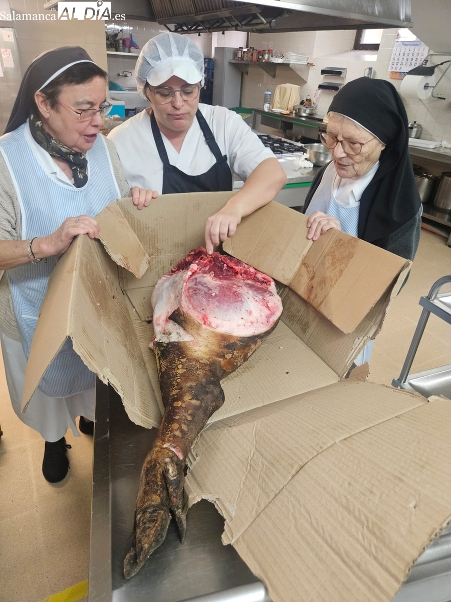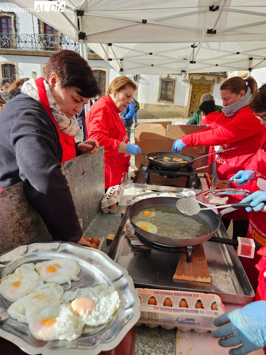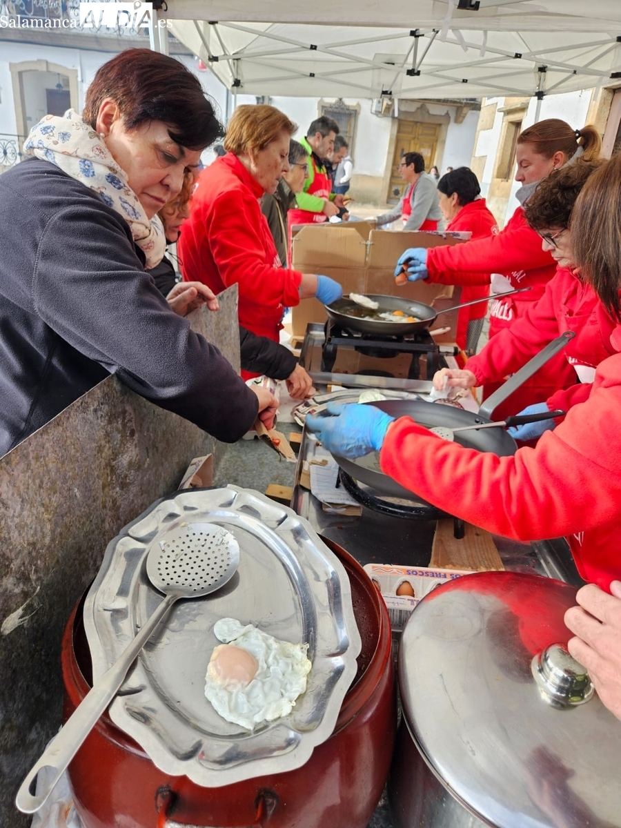 Mientras los matarifes realizaban su trabajo, las mujeres del barrio El Teso se han afanado en la preparación del almuerzo. Las cifras de la comida dan cuenta de la magnitud del evento: se han cocinado 40 kilos de chichas, 18 de panceta, 15 de lomo y 15 de morcilla, acompañados por nada menos que 30 docenas de huevos. La degustación estaba prevista para las 14:00 horas, momento en el que también se realizará el sorteo de las piezas del cerdo.