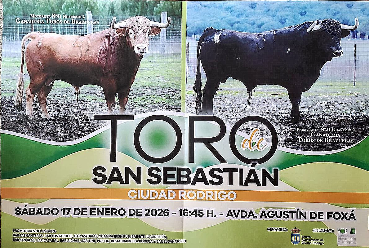 Ciudad Rodrigo celebrará la quinta edición del Toro de San Sebastián el próximo sábado 17 de enero a las 16:45 horas. Dos toros de la ganadería vallisoletana de Brazuelas, 'Motorista' y 'Picapleitos', recorrerán la avenida Conde de Foxá en un festejo popular que sirve de antesala al Carnaval del Toro.