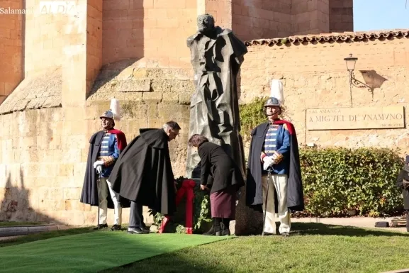 Dada la temática elegida para este aniversario, el protagonismo de la ofrenda ha recaído en la institución académica. La vicerrectora de Ordenación Académica y Profesorado de la USAL, María Rosario Arévalo, ha sido la encargada de depositar las flores a los pies de la escultura. Ha estado acompañada en este solemne momento por el alcalde de Salamanca, Carlos García Carbayo.