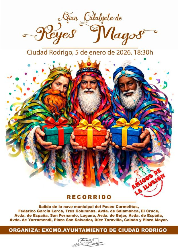 El Ayuntamiento de Ciudad Rodrigo, junto a la asociación "Amigos de la Ilusión", ha presentado el recorrido y horario de la Cabalgata de Reyes Magos del próximo 5 de enero de 2026.