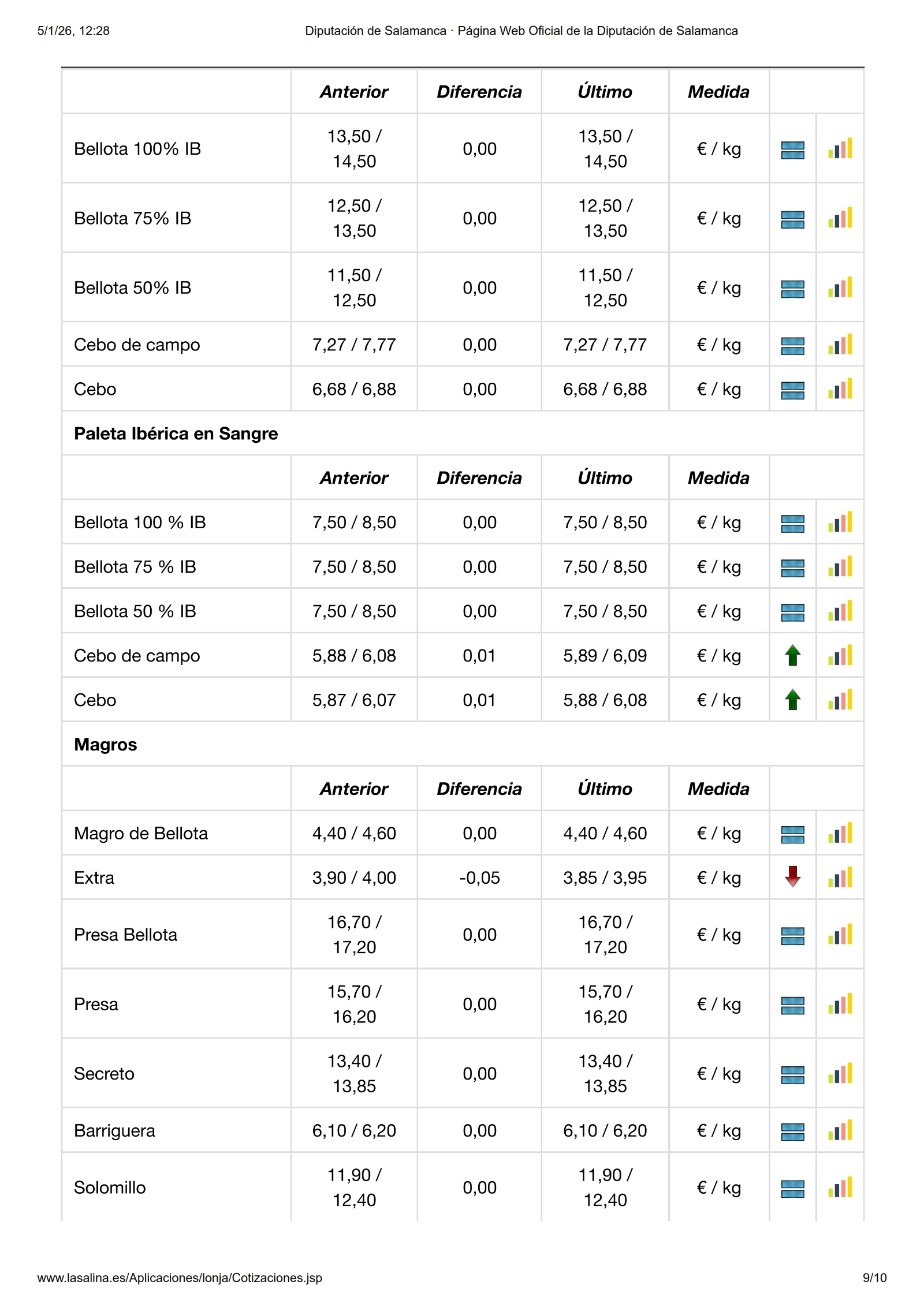 En la Mesa de Despiece de Ibérico, las paletas en sangre de cebo y cebo de campo suben 0,01 €/kg, mientras el magro extra cae -0,05 €/kg.