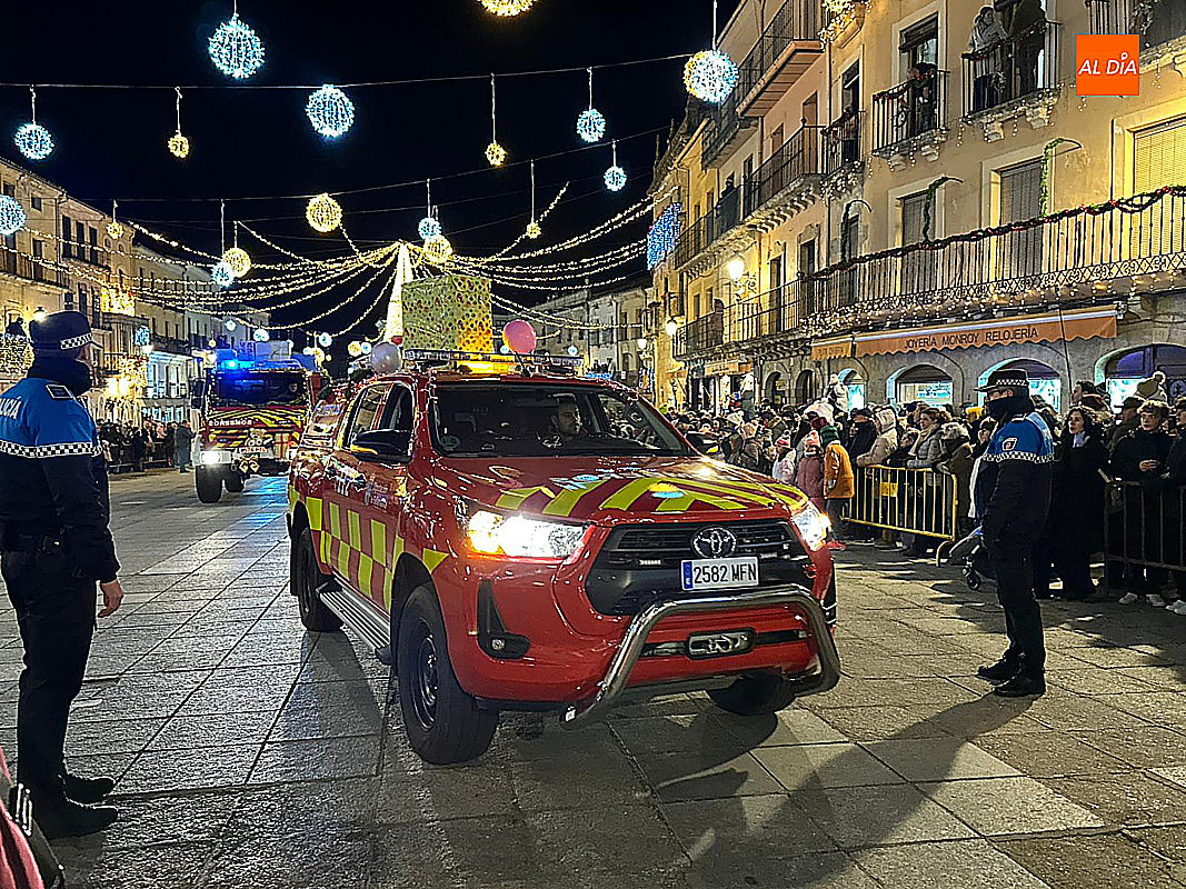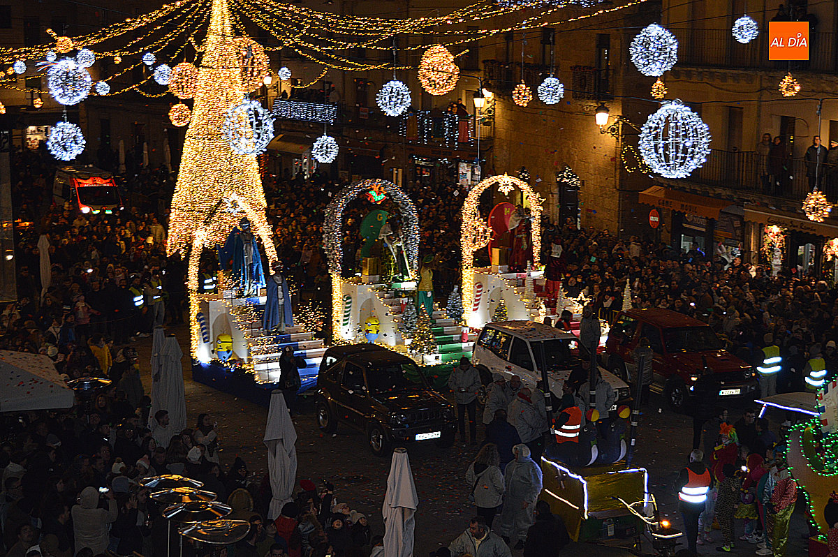 La comitiva real partió desde la nave municipal situada en el Paseo de Carmelitas, dando inicio a un desfile lleno de color, música y fantasía que recorrió el municipio hasta alcanzar la Plaza Mayor. Las majestuosas carrozas de Melchor, Gaspar y Baltasar presentaron este año una cuidada ambientación navideña: la de Melchor adornada con pinos y estrellas, la de Gaspar con pinos coronados por una campana y la de Baltasar con árboles iluminados, ramas y copos de nieve, reforzando el carácter festivo del desfile, todas ellas decoradas con un arco triunfante.